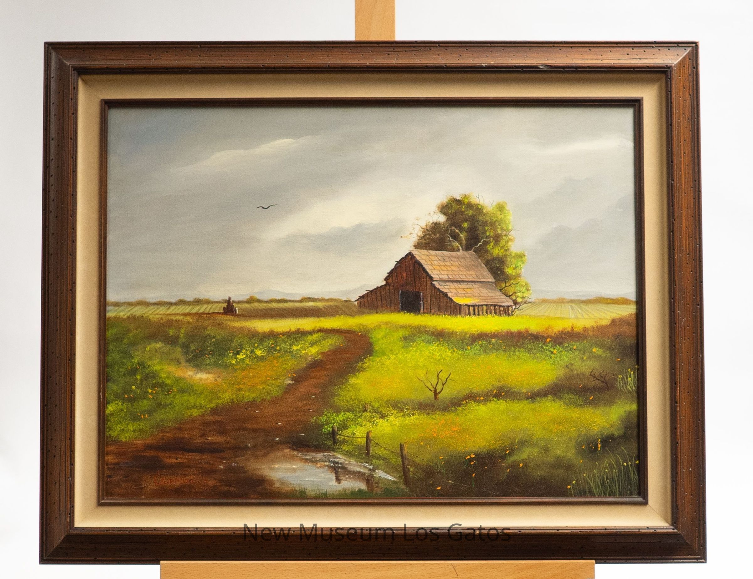 A framed oil painting, depicting a farm scene. There is a brown barn in the center-right of the painting, surrounded by green fields with scattered wildflowers, a gray and cloudy sky, and a tree behind it. There is a dirt path extending into the painting from the lower left corner. The painting has a thick brown wooden frame with a cream-colored mat.Type of Painting