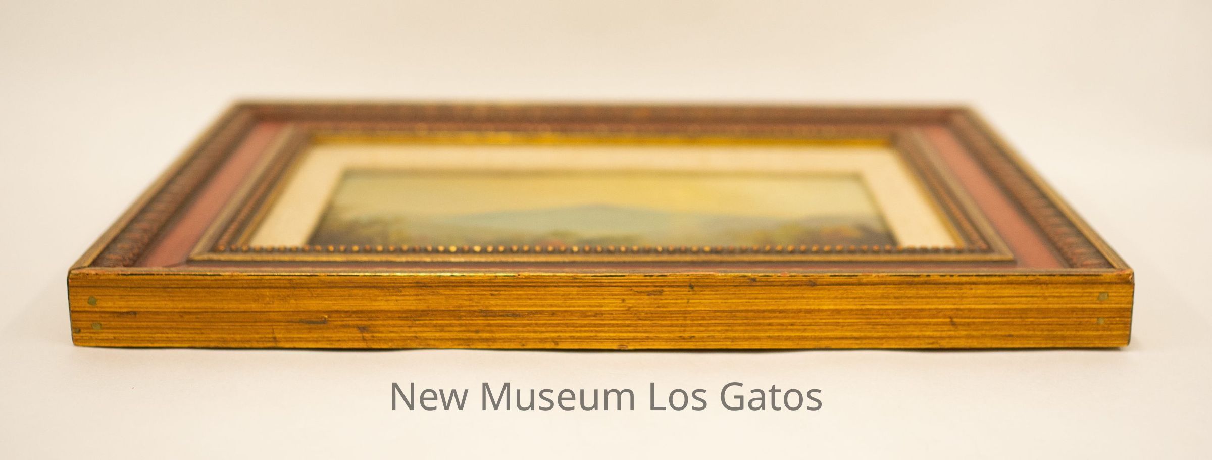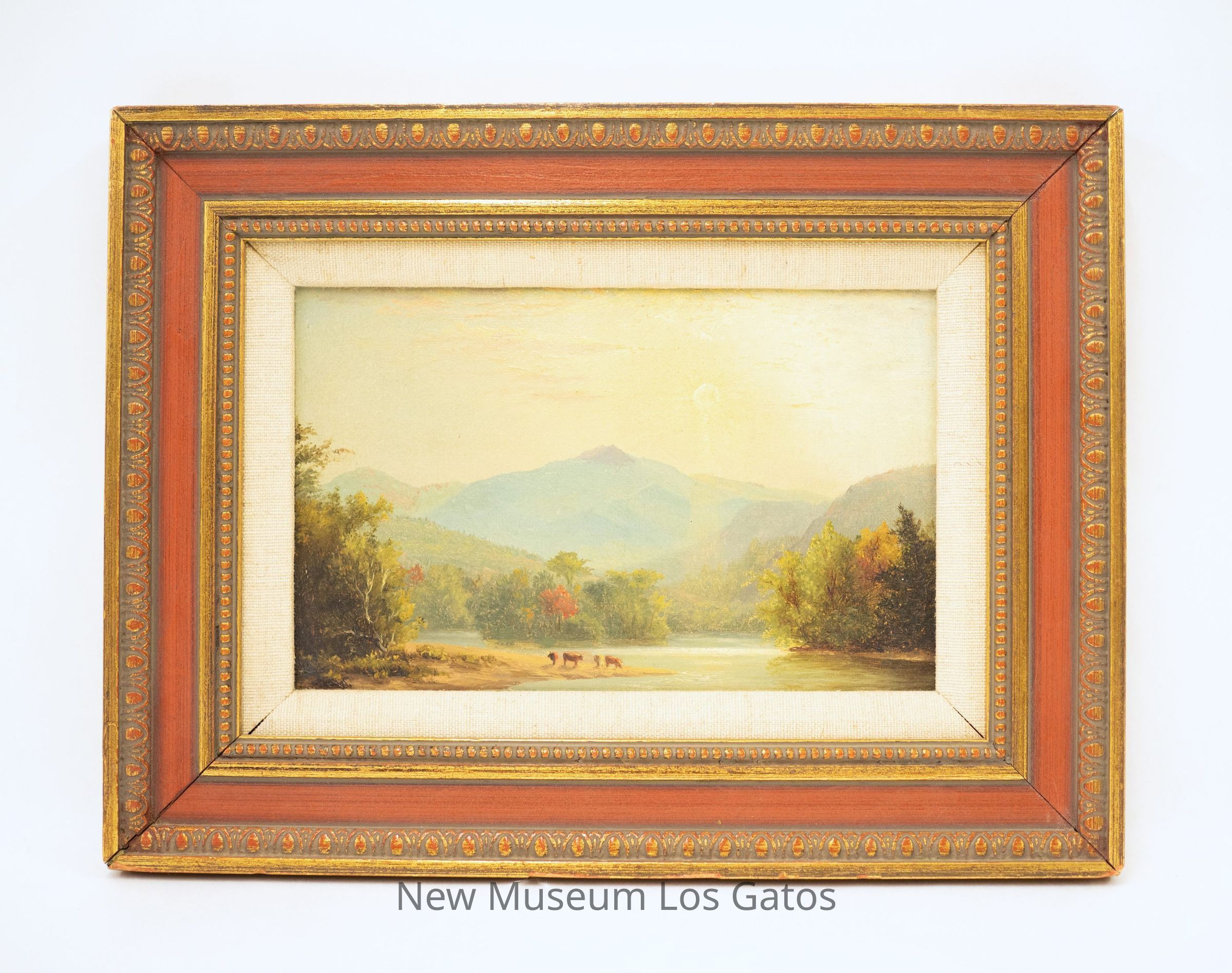A painting of a landscape with a river, forest, and mountains with four bovine in the foreground. The frame is red and gold with a canvas portion for the inner edge of the window.