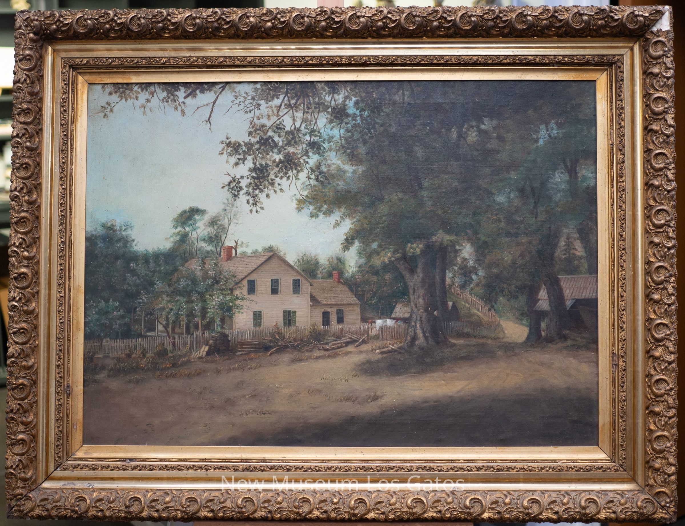 An oil painting depicting a house surrounded by trees. The white, two-story house is the mid-ground/background, behind a wooden fence. There is open space and large trees in the mid-ground/foreground. The painting is in an ornate, gilded frame.Type of Painting