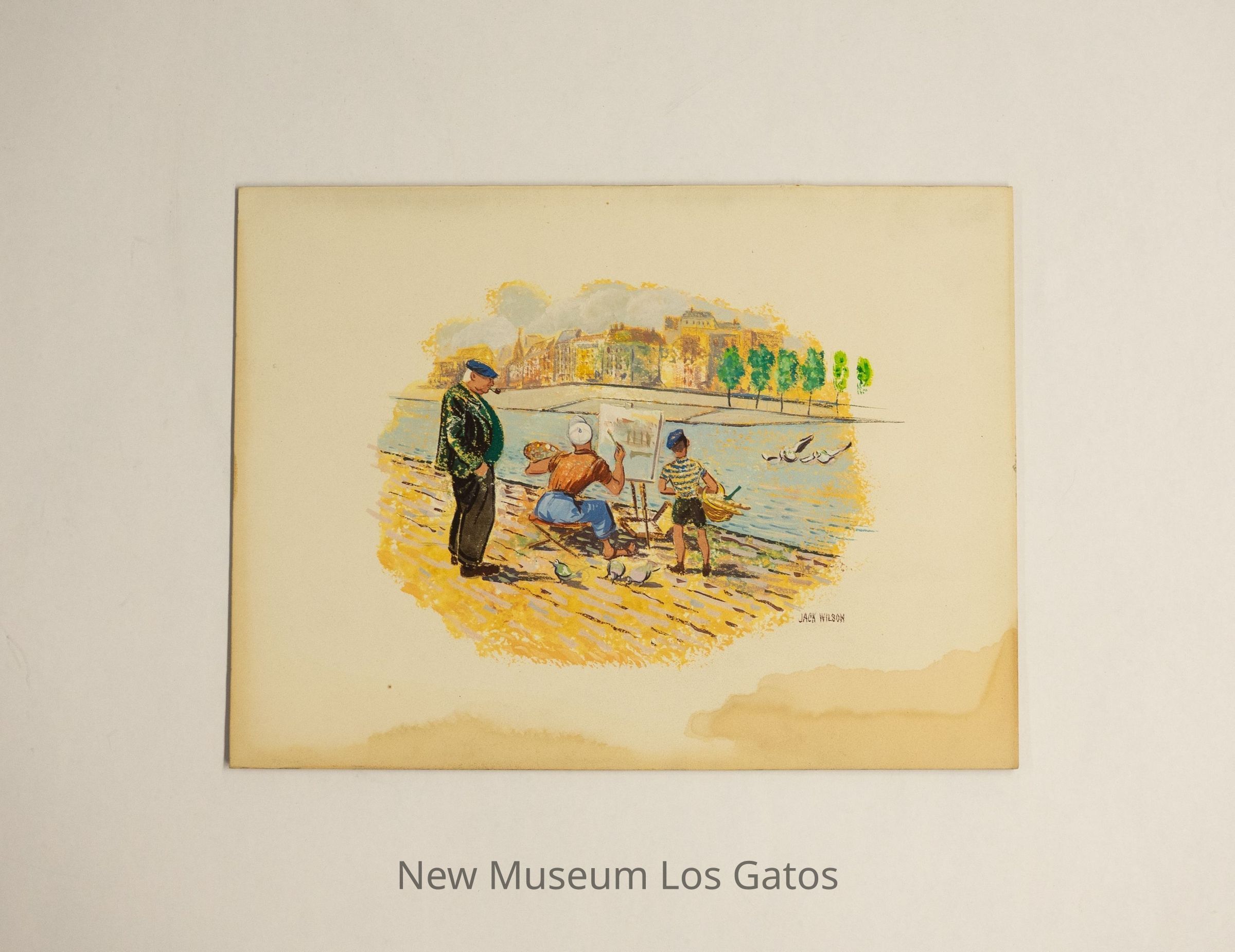 A gouache (likely) painting in the center of an illustration board, with soft edges. The painting depicts a person sitting on a stool, painting on a canvas by a river running through a city. There is a young boy standing to the right of the painter, holding a basket of bread, with an old man smoking a pipe standing to the left of the painter, looking on.Type of Painting