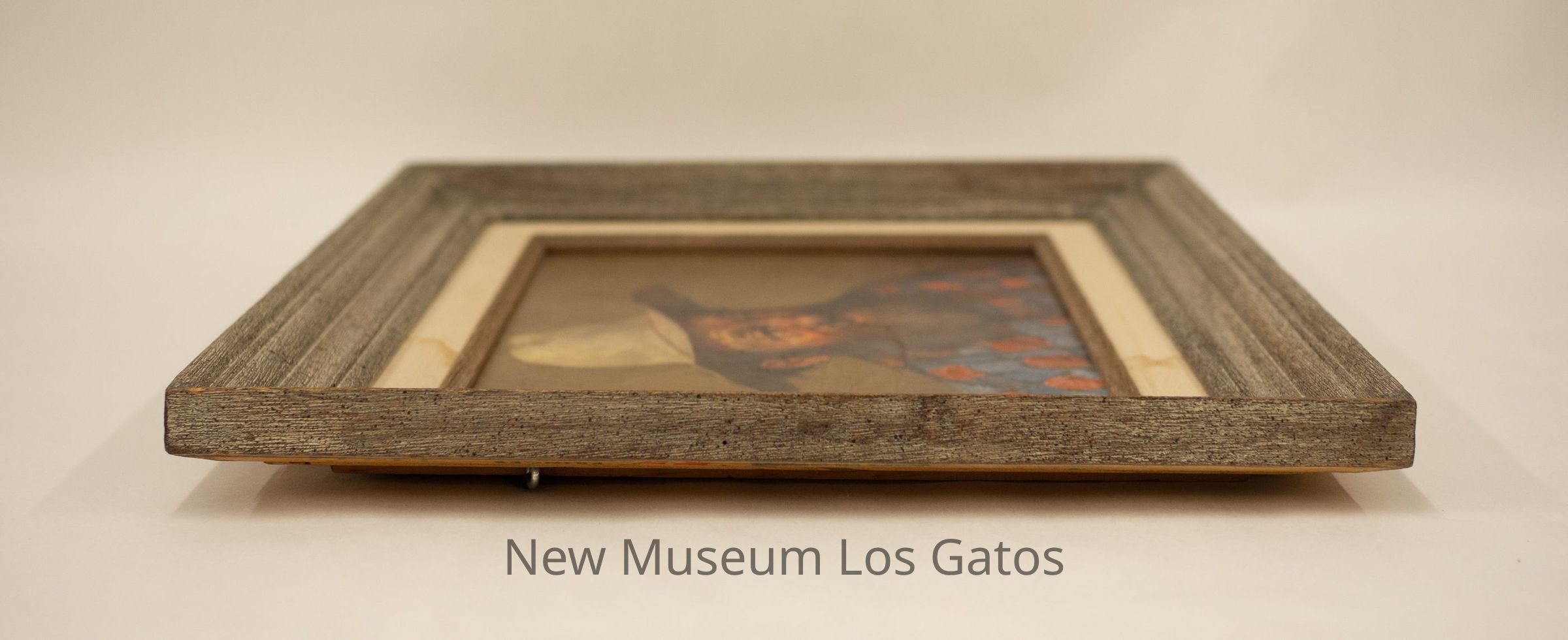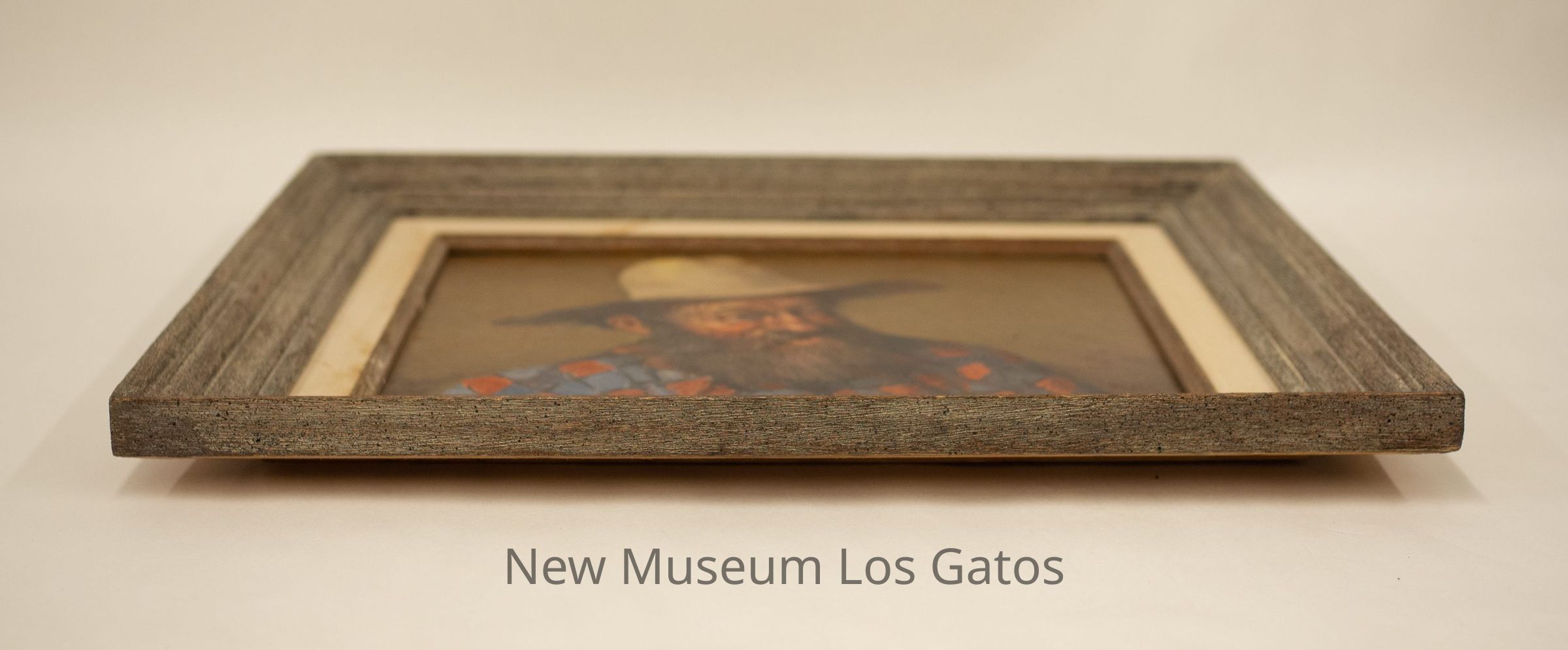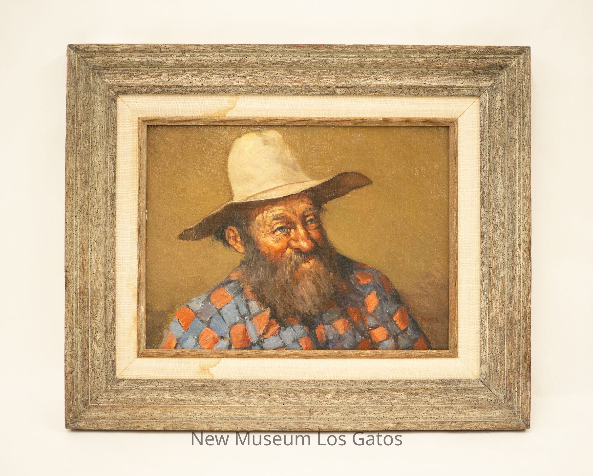 A portrait painting of an elderly man with a brown beard in a white hat and a blue and red plaid shirt on a tan background.