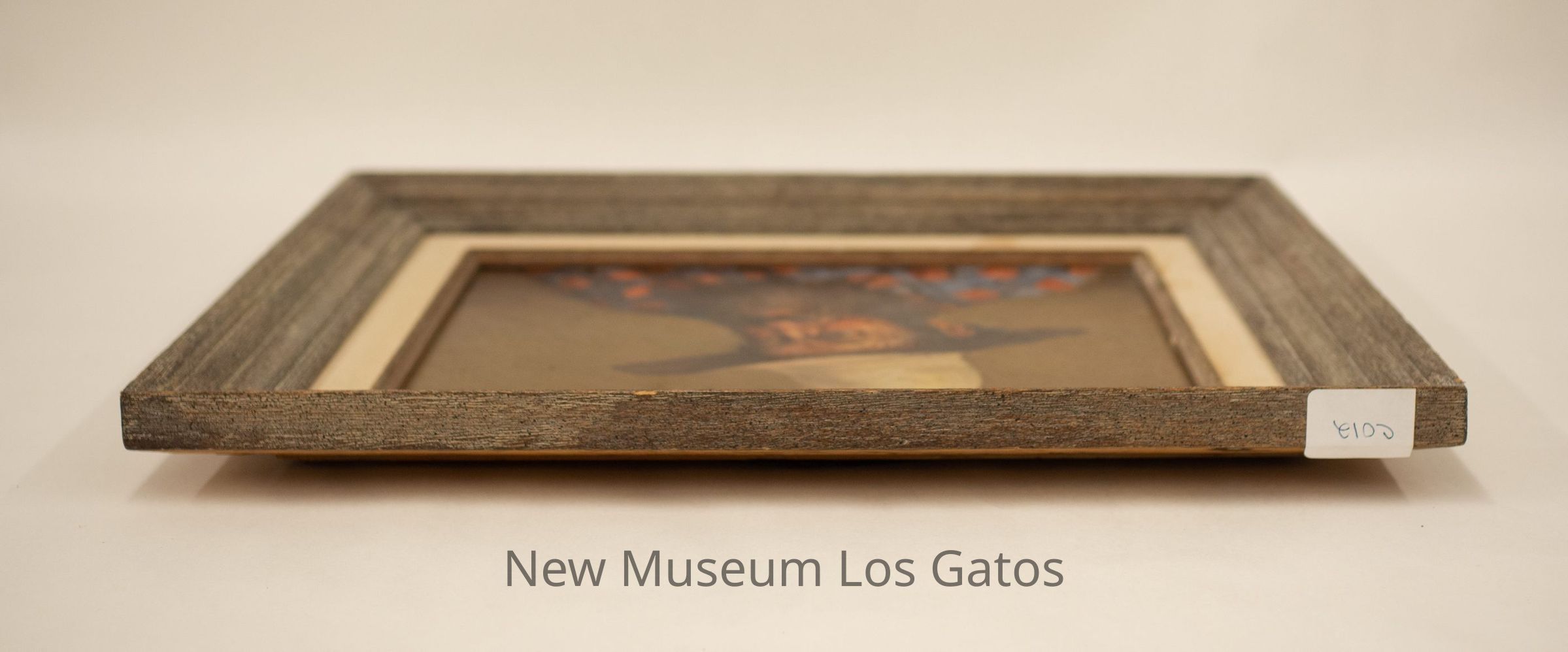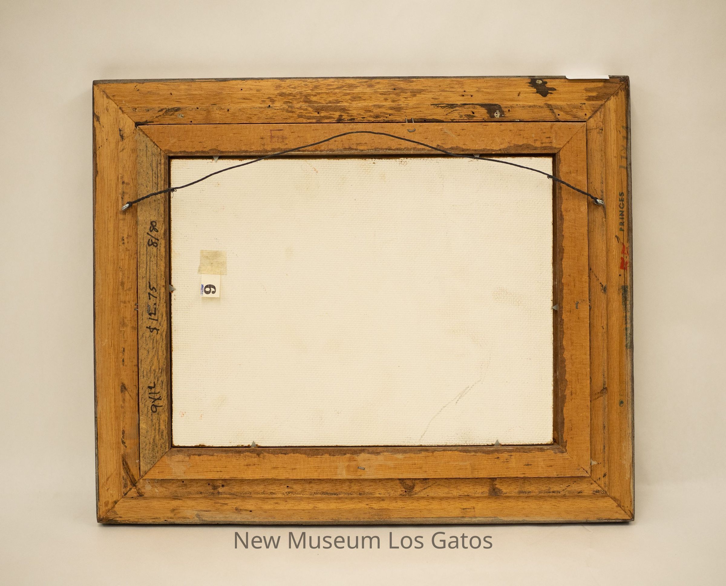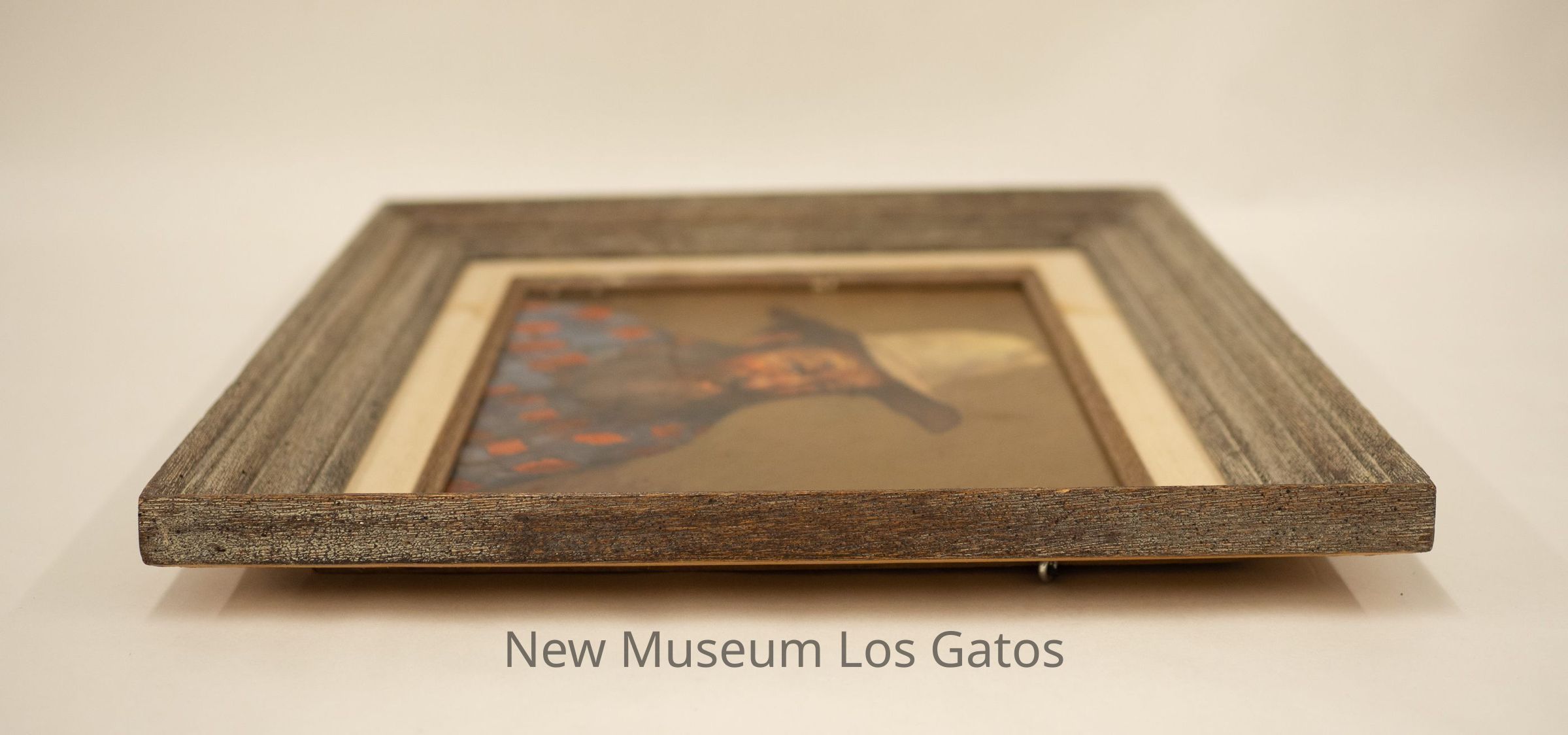 A portrait painting of an elderly man with a brown beard in a white hat and a blue and red plaid shirt on a tan background.