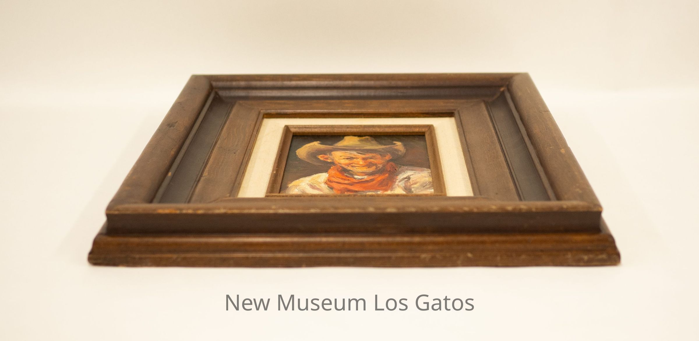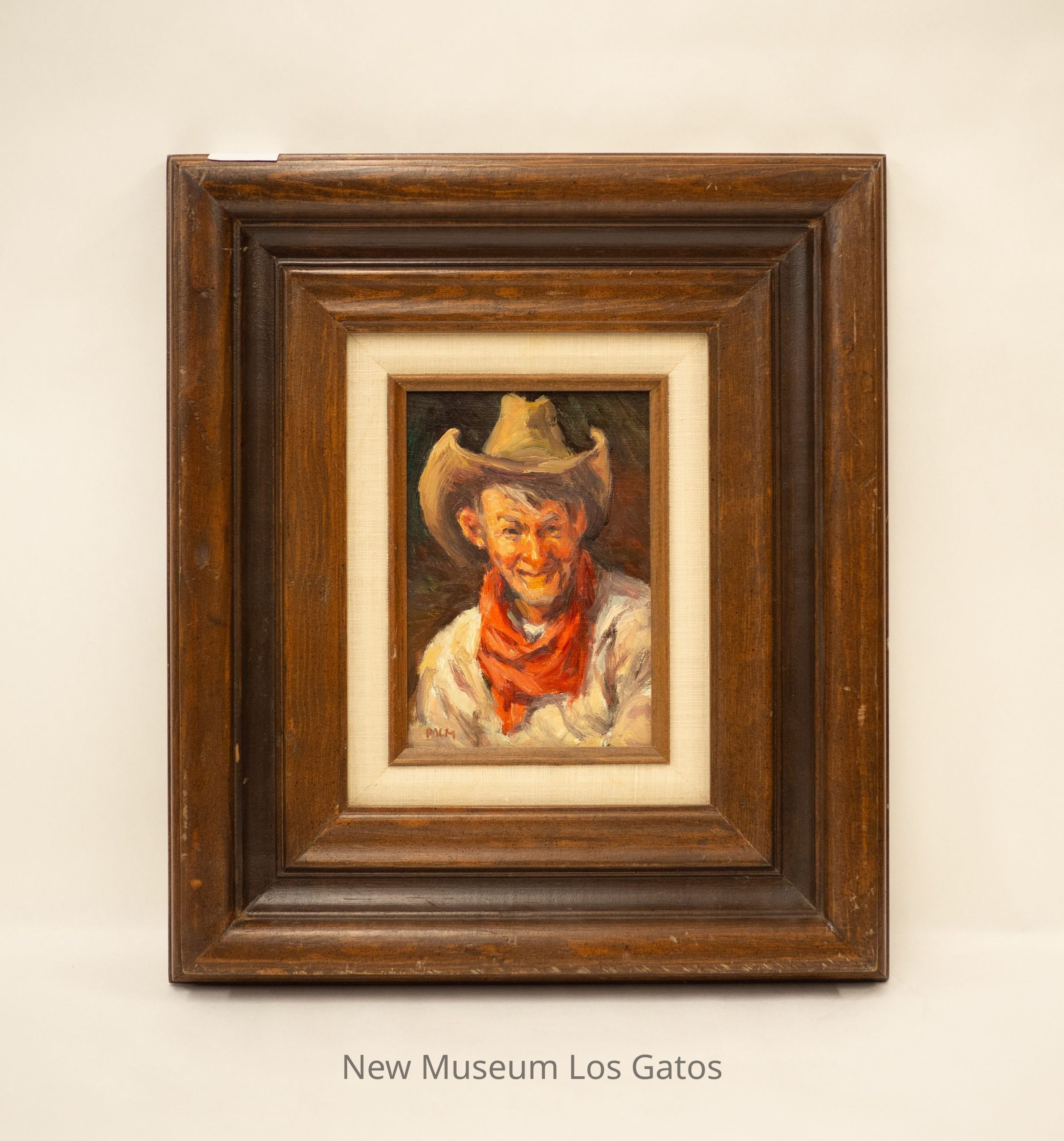 A painting of an old farmer in a cowboy hat and red bandana in a wooden frame.