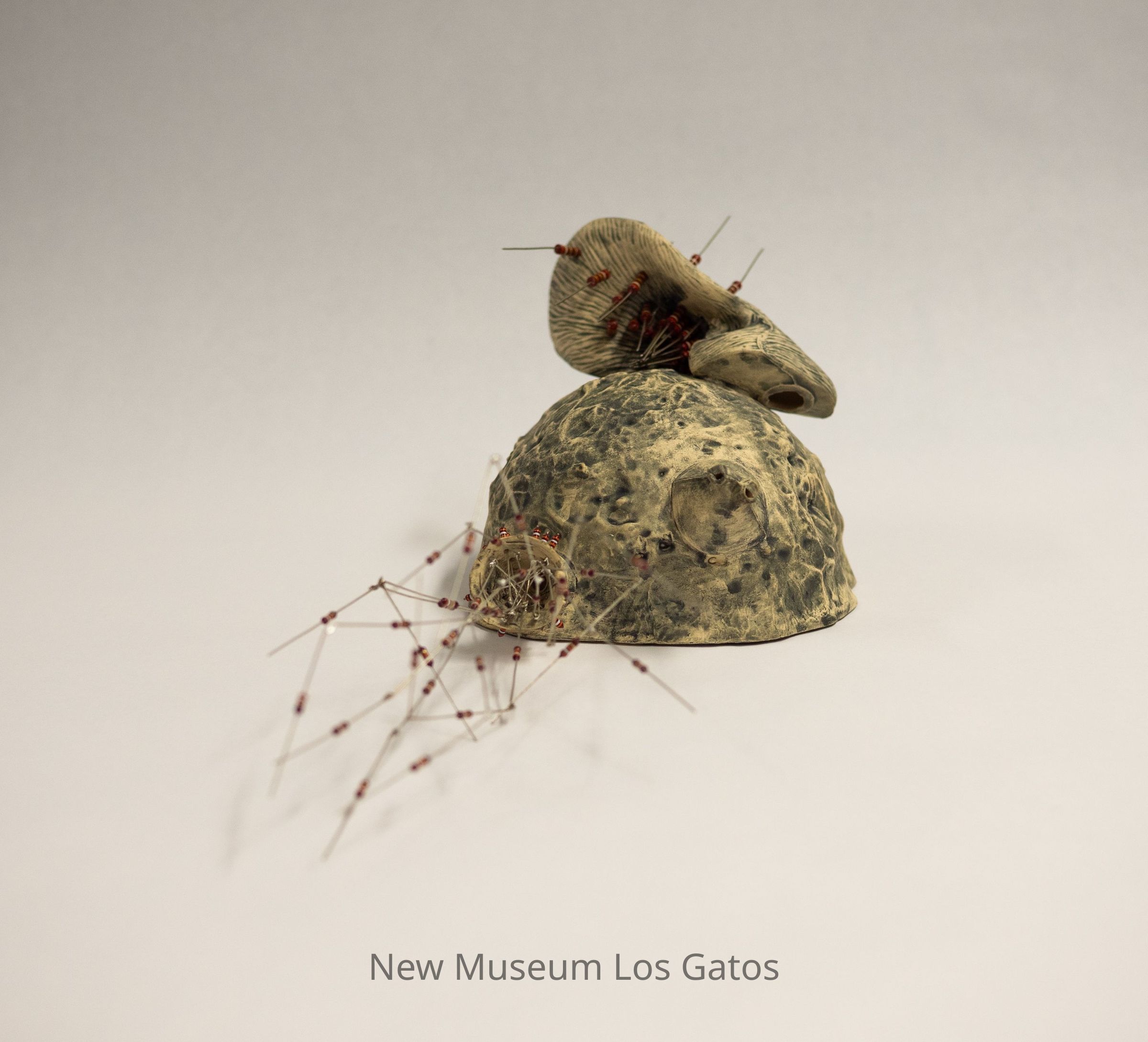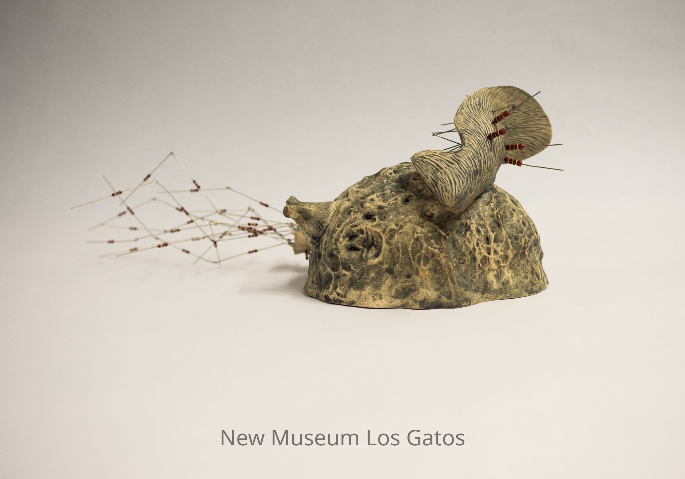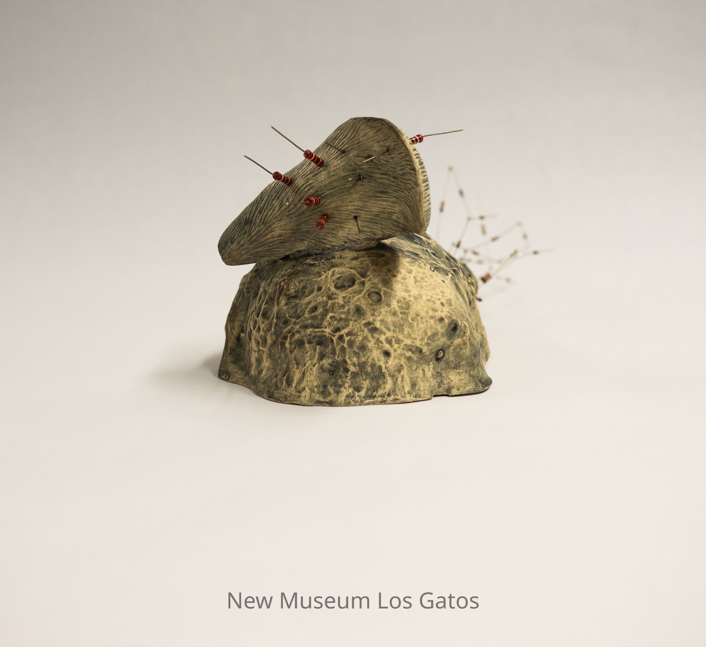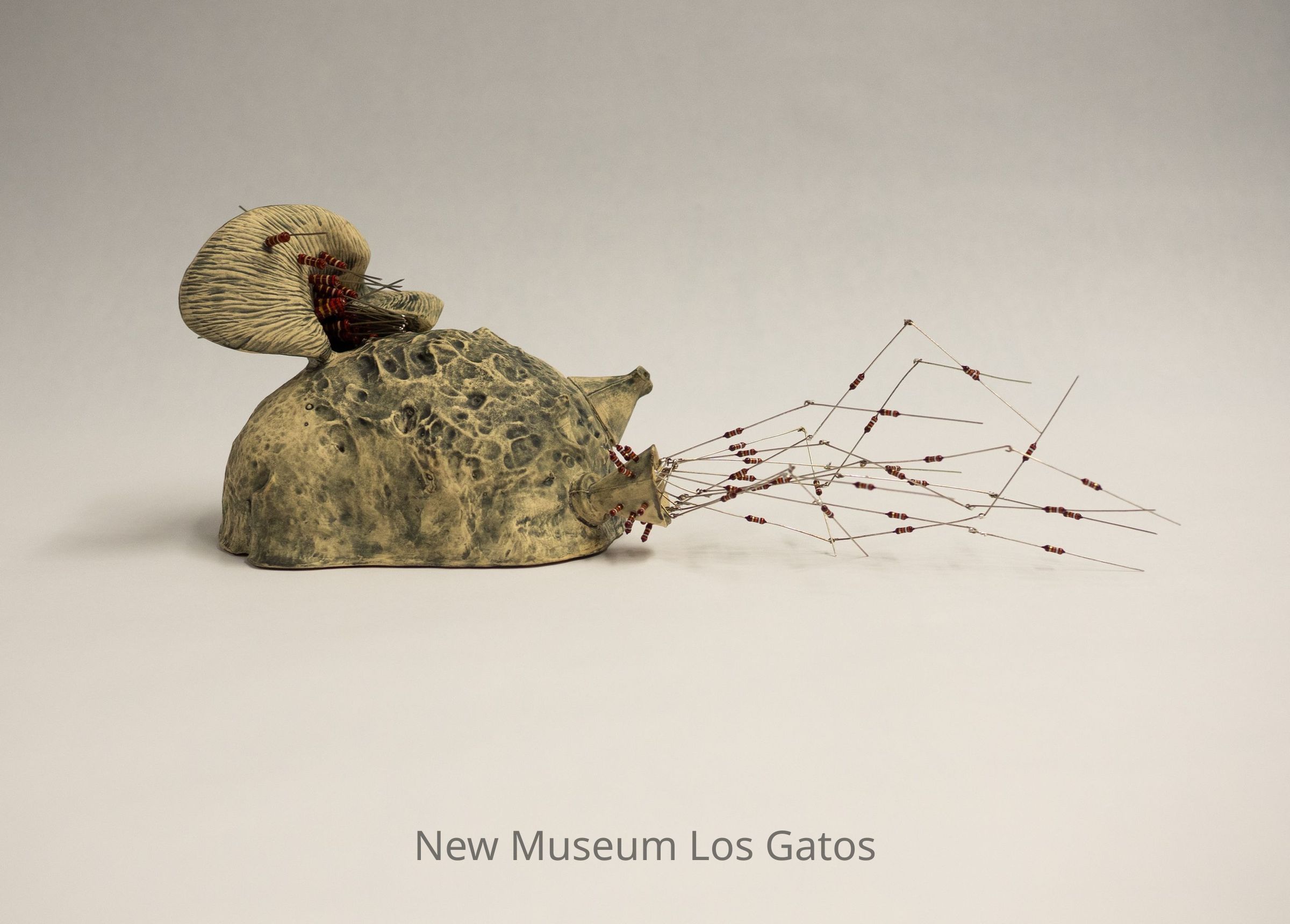 A mixed media sculpture, consisting of porcelain with resistor accents. The porcelain is white with a dark gray/blue coating, and is largely spherical, with a piece resembling a deer's ear coming out of the top, and two other conical and funnel shaped protrusions coming out of the opposite side. There are numerous short resistors coming out of the ears, with numerous longer resistors coming out of the cone.Type of Sculpture