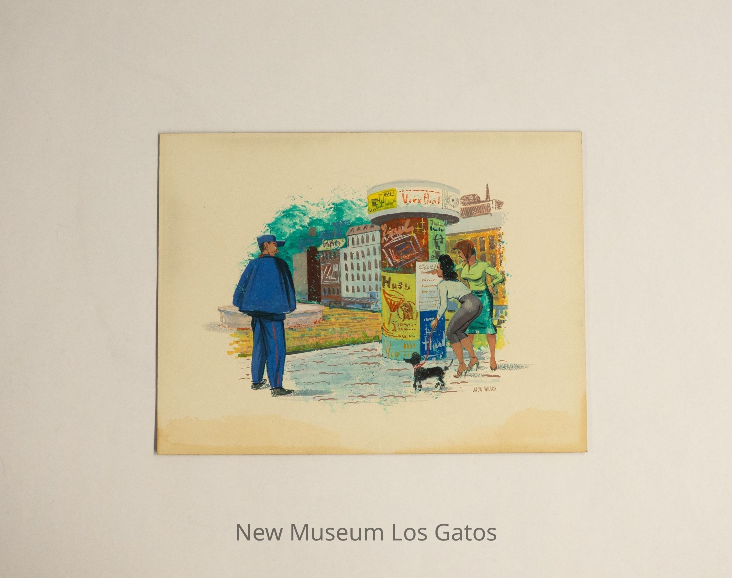 A gouache (likely) painting in the center of an illustration board, with soft edges. The painting depicts two women reading flyers in a circular public board; one woman is wearing a green top and green skirt with a red bandana on her head, while the other is wearing a light colored top and gray pants and crouching down, while holding the leash for a small black dog. There is a policeman dressed in blue standing to the left looking at the women, and there are numerous buildings in the mid/background.Type of Painting