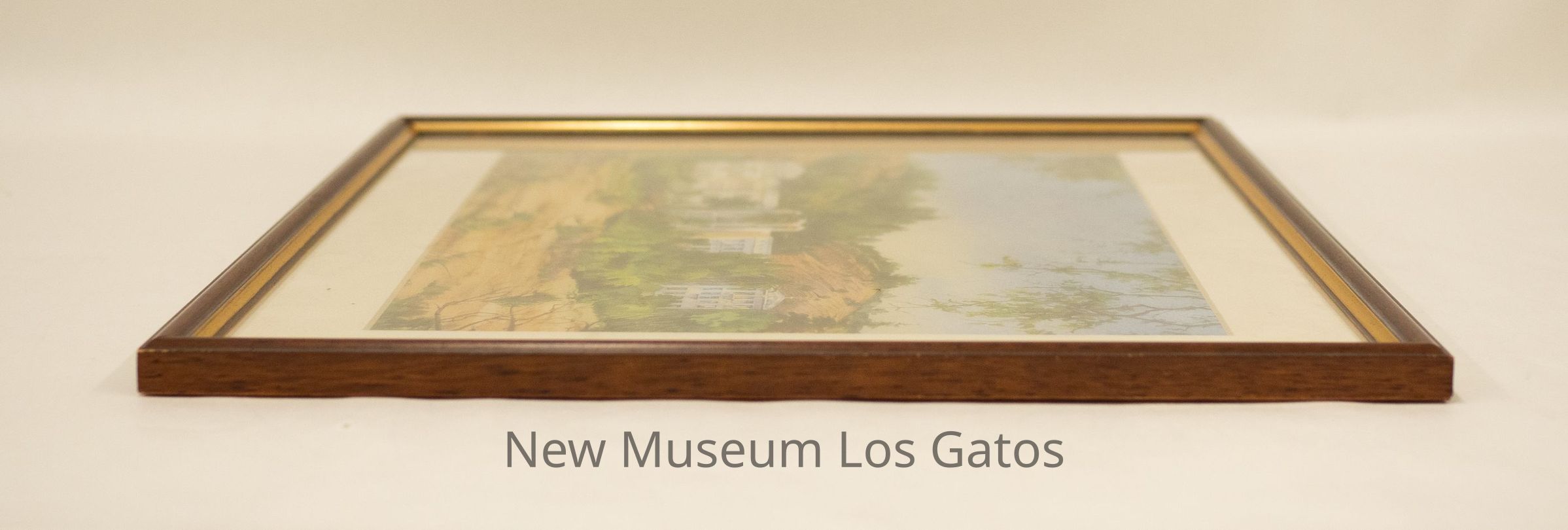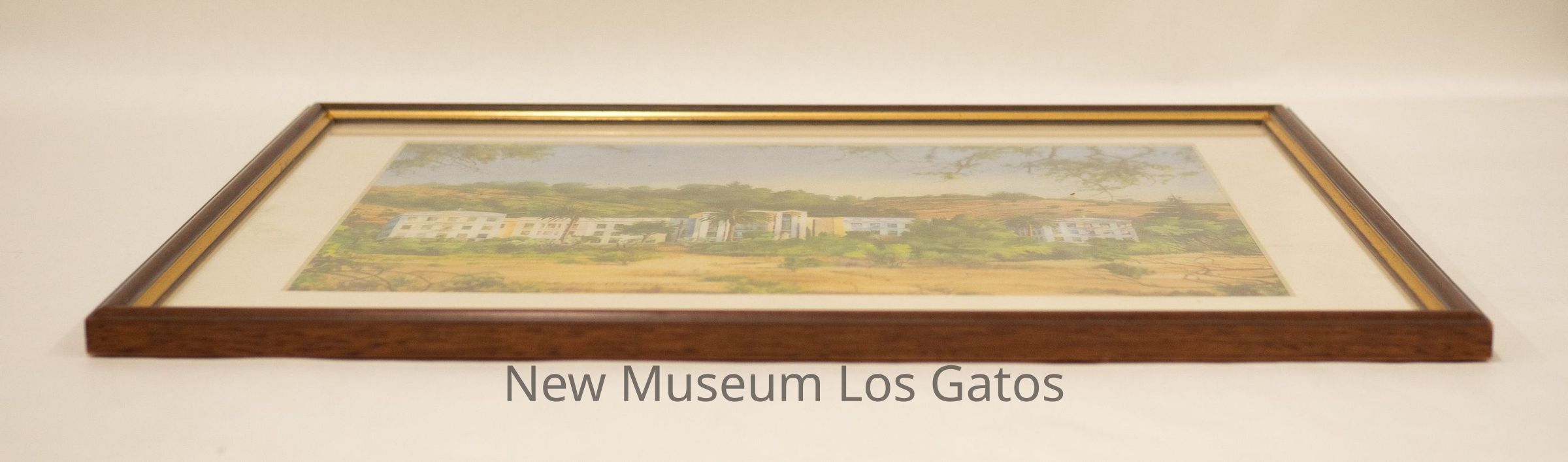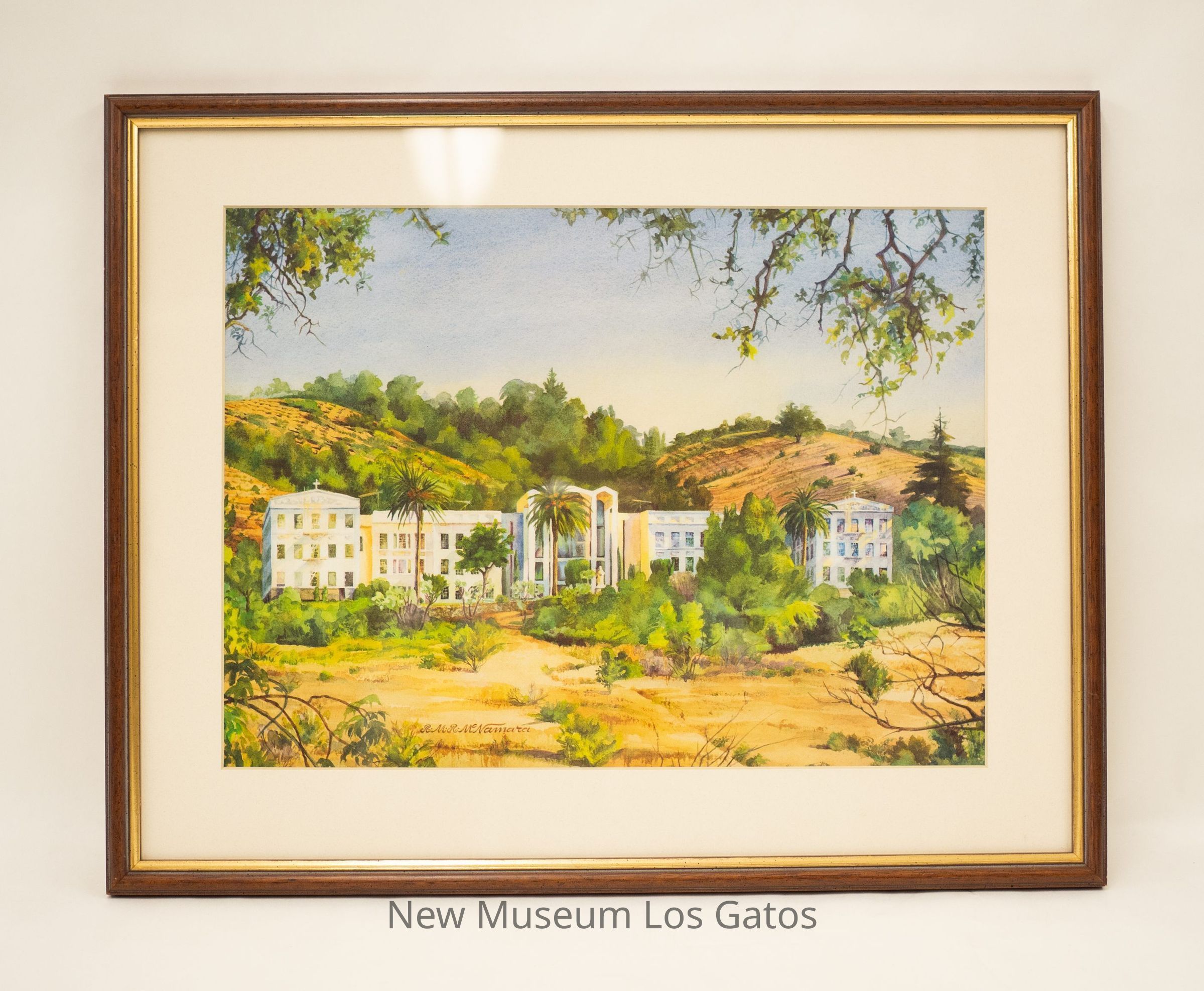 A print of a painting of a large white building nestled in brown hills, surrounded by green trees and foliage.