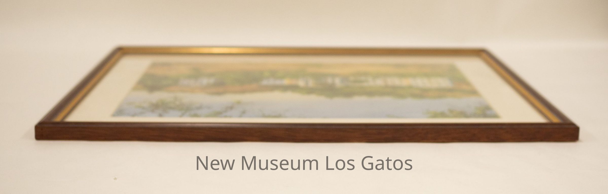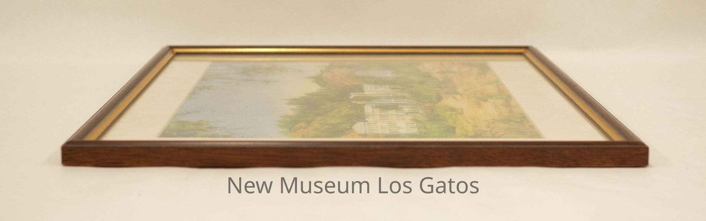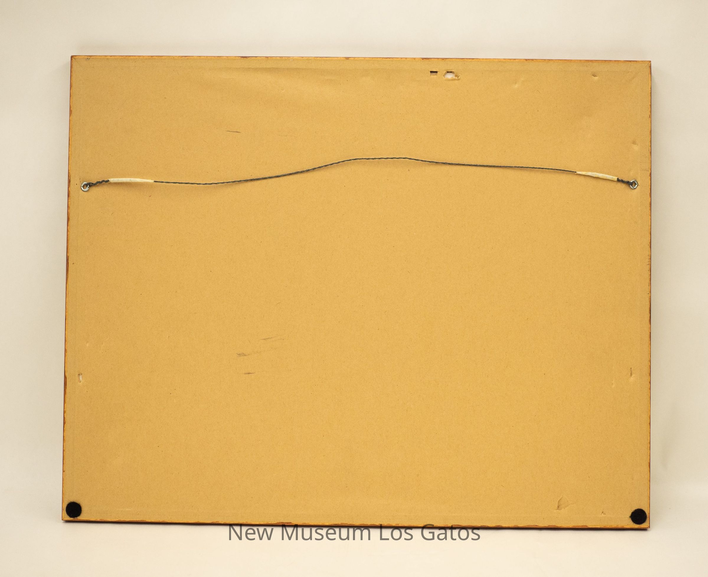 A print of a painting of a large white building nestled in brown hills, surrounded by green trees and foliage.