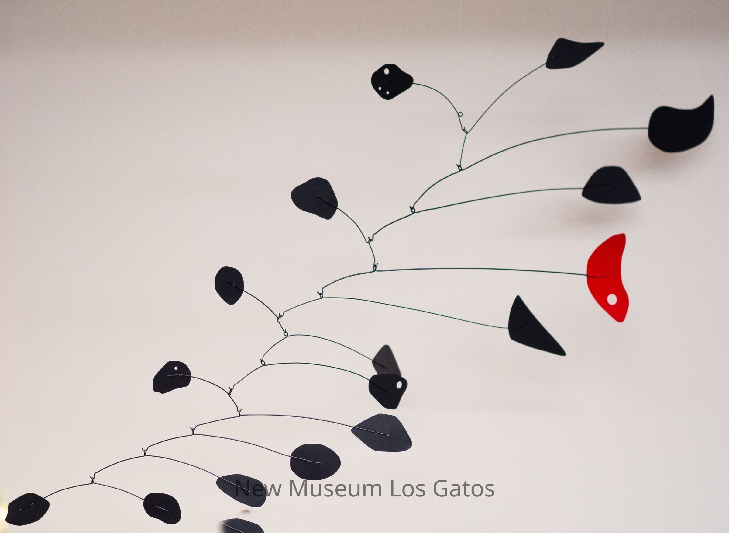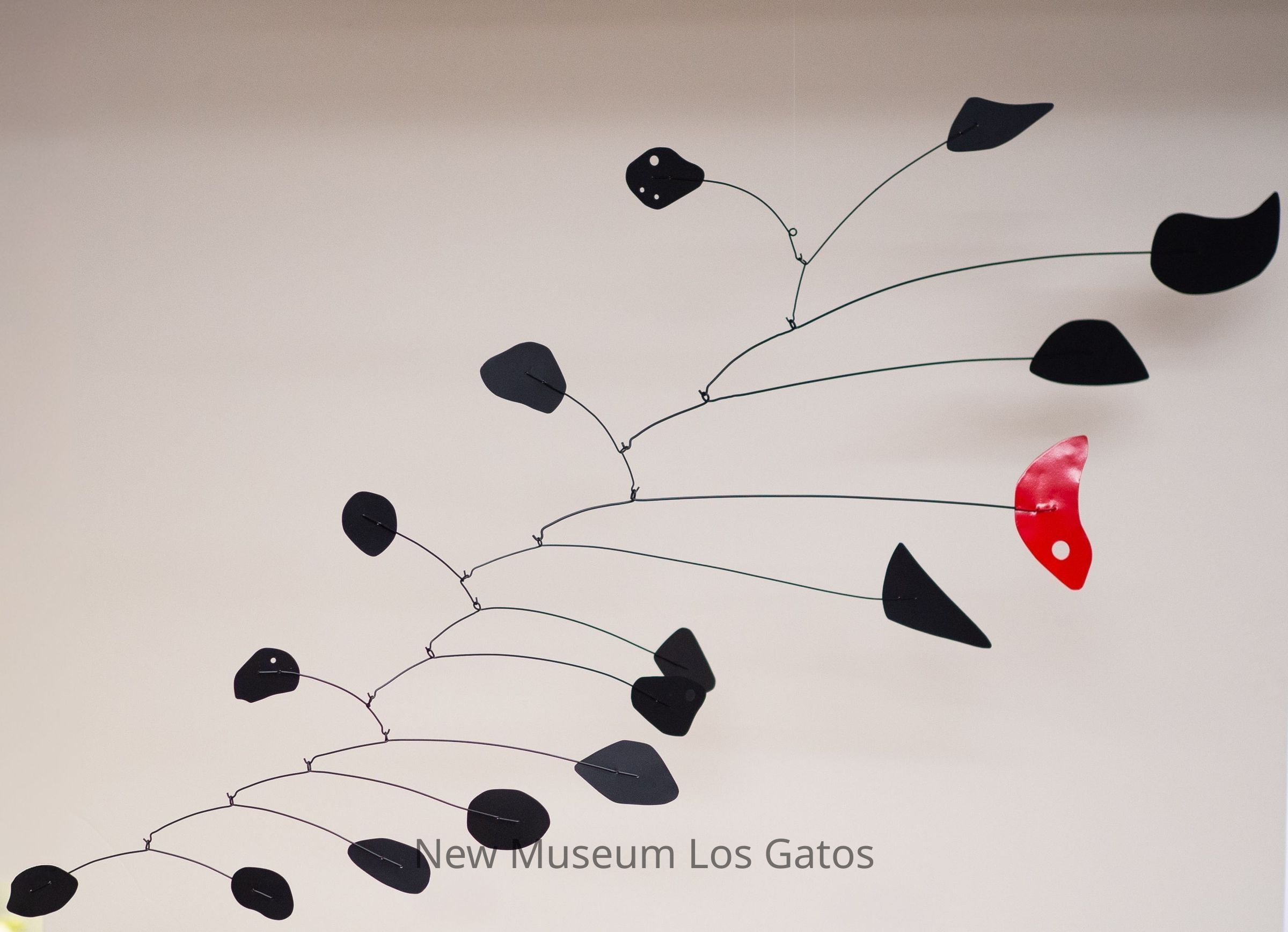 A sheet metal and wire hanging mobile sculpture, consisting predominately of black sheet metal shapes and one red sheet metal shape, attached to black black wires, which hang from each other in an abstract pattern.Type of Sculpture