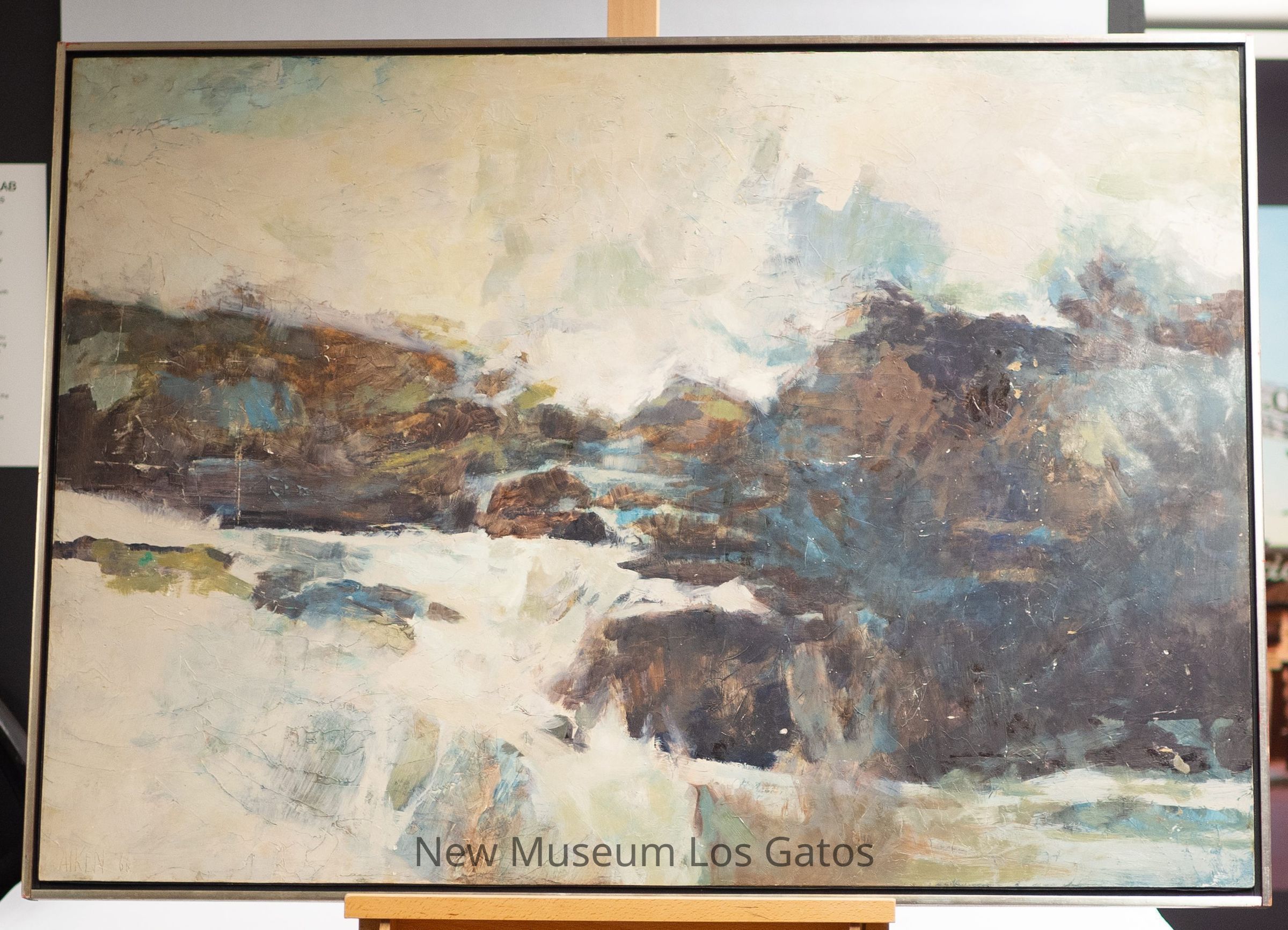 An oil painting of an abstracted landscape scene. The painting is inside of a thin wooden frame, painted silver.Type of Painting