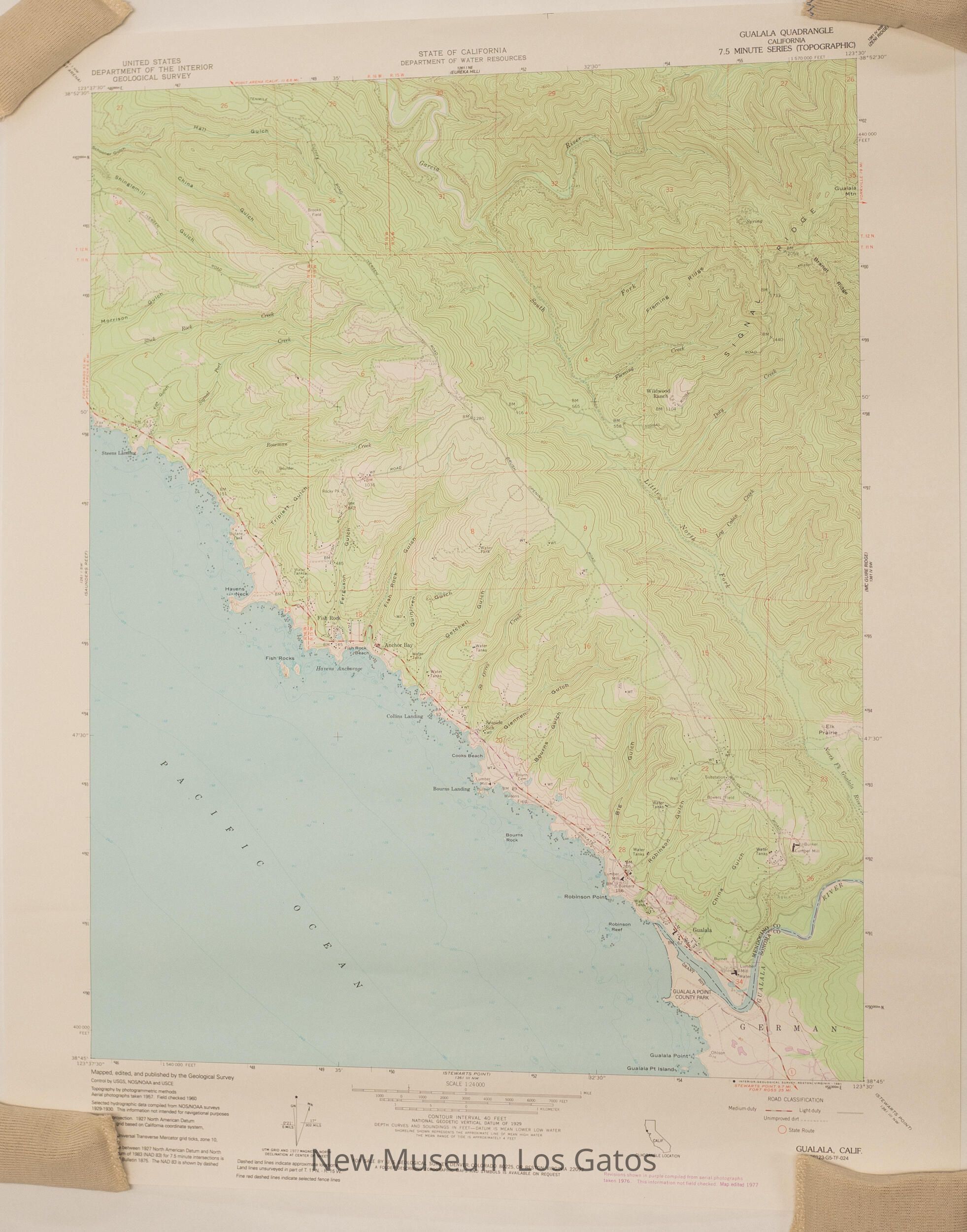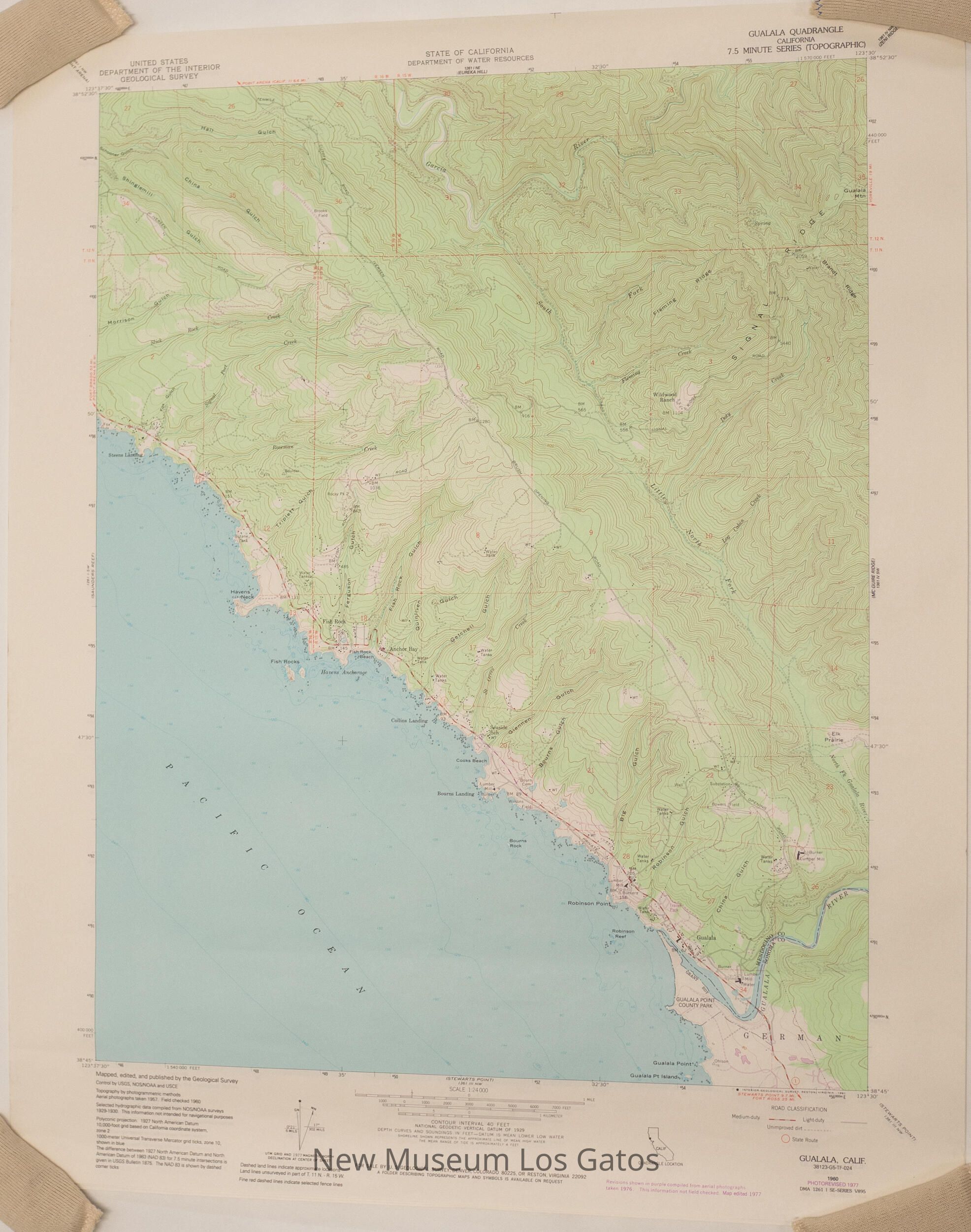 Two identical copies of a topographic, color map of the Gualala quadrangle in Mendocino and Sonoma Counties, California.Collection