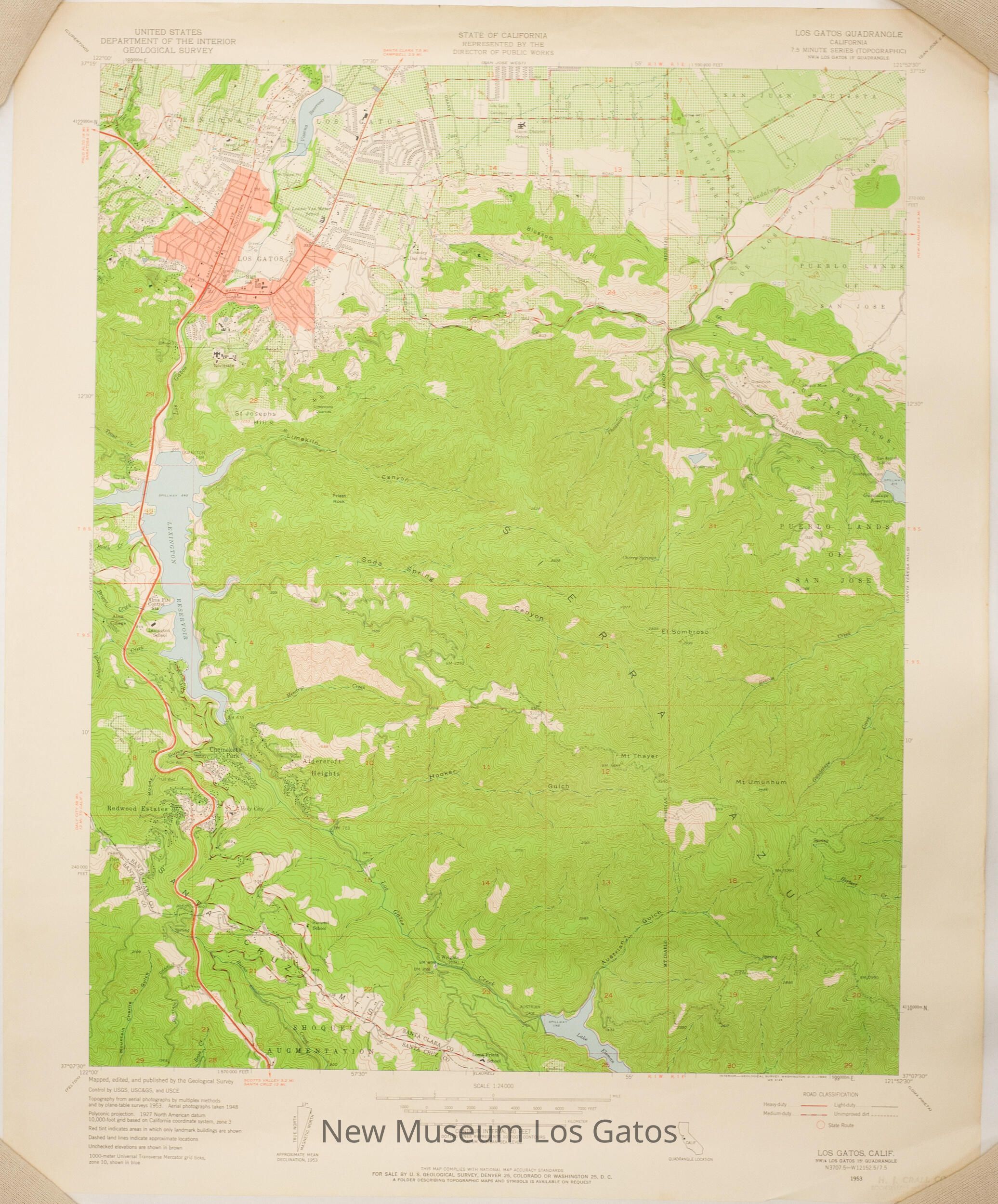 A topographic, color map of the Los Gatos quadrangle in Santa Clara and Santa Cruz Counties, California.