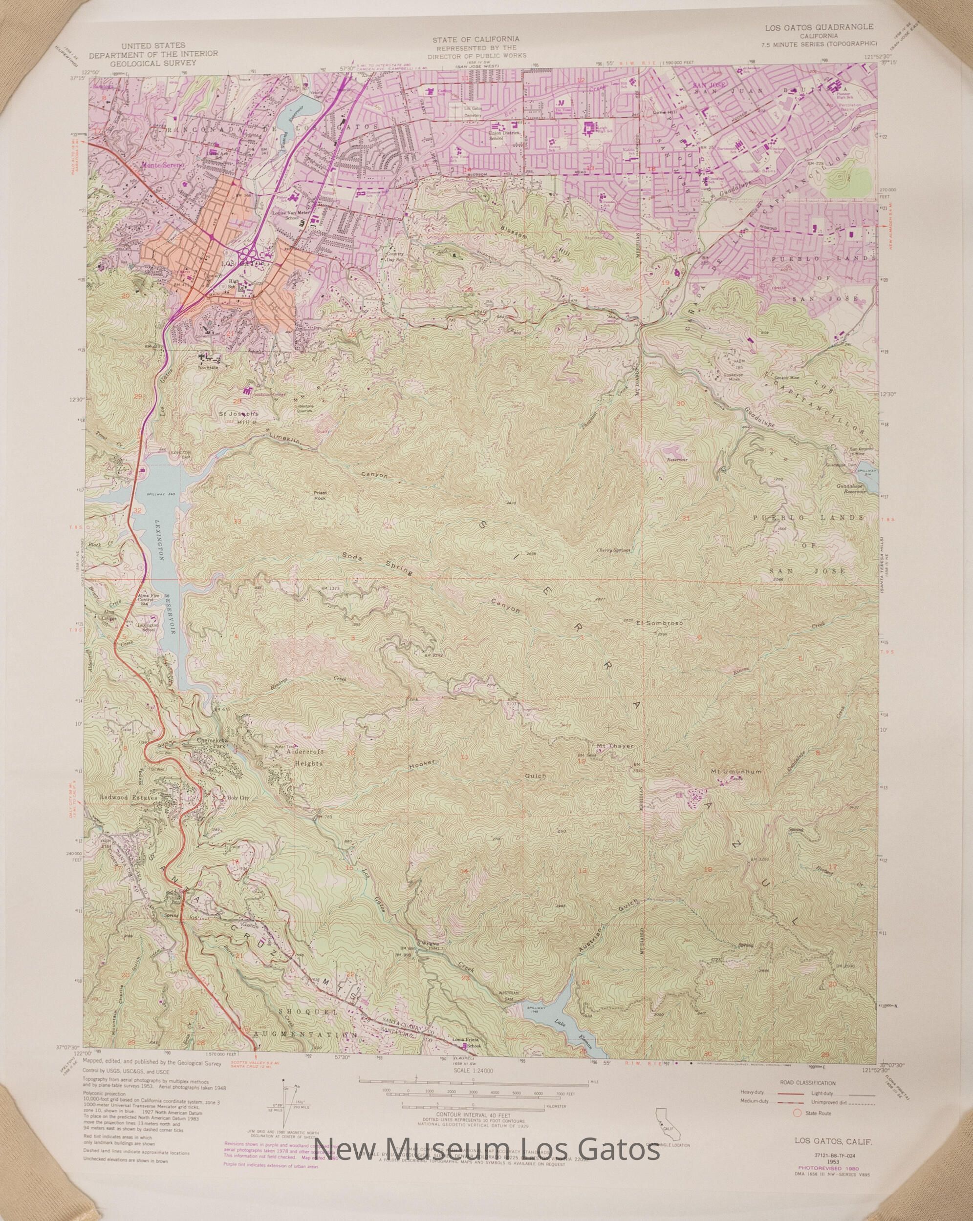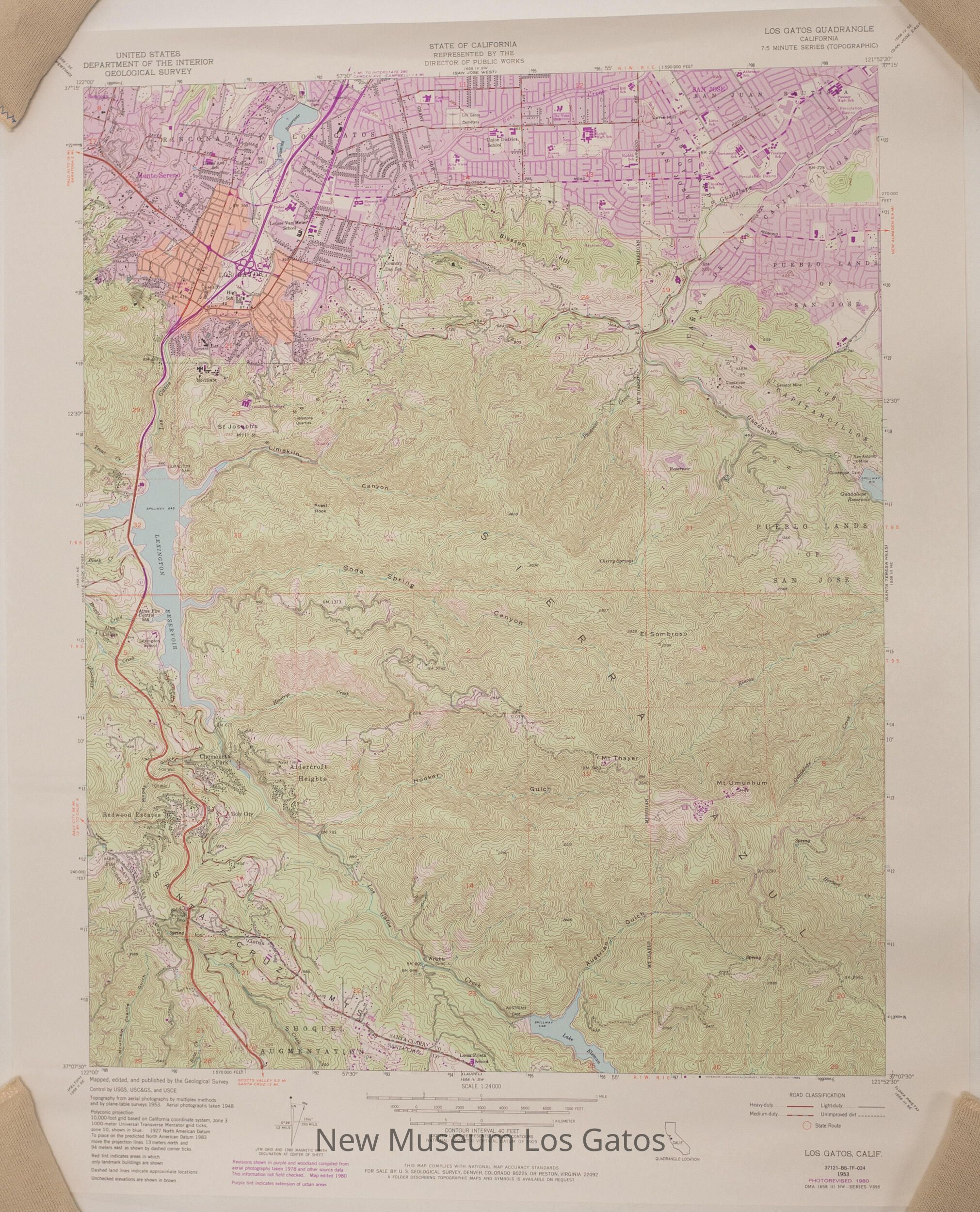 Two identical copies of a topographic, color map of the Los Gatos quadrangle in Santa Clara and Santa Cruz Counties, California.Collection