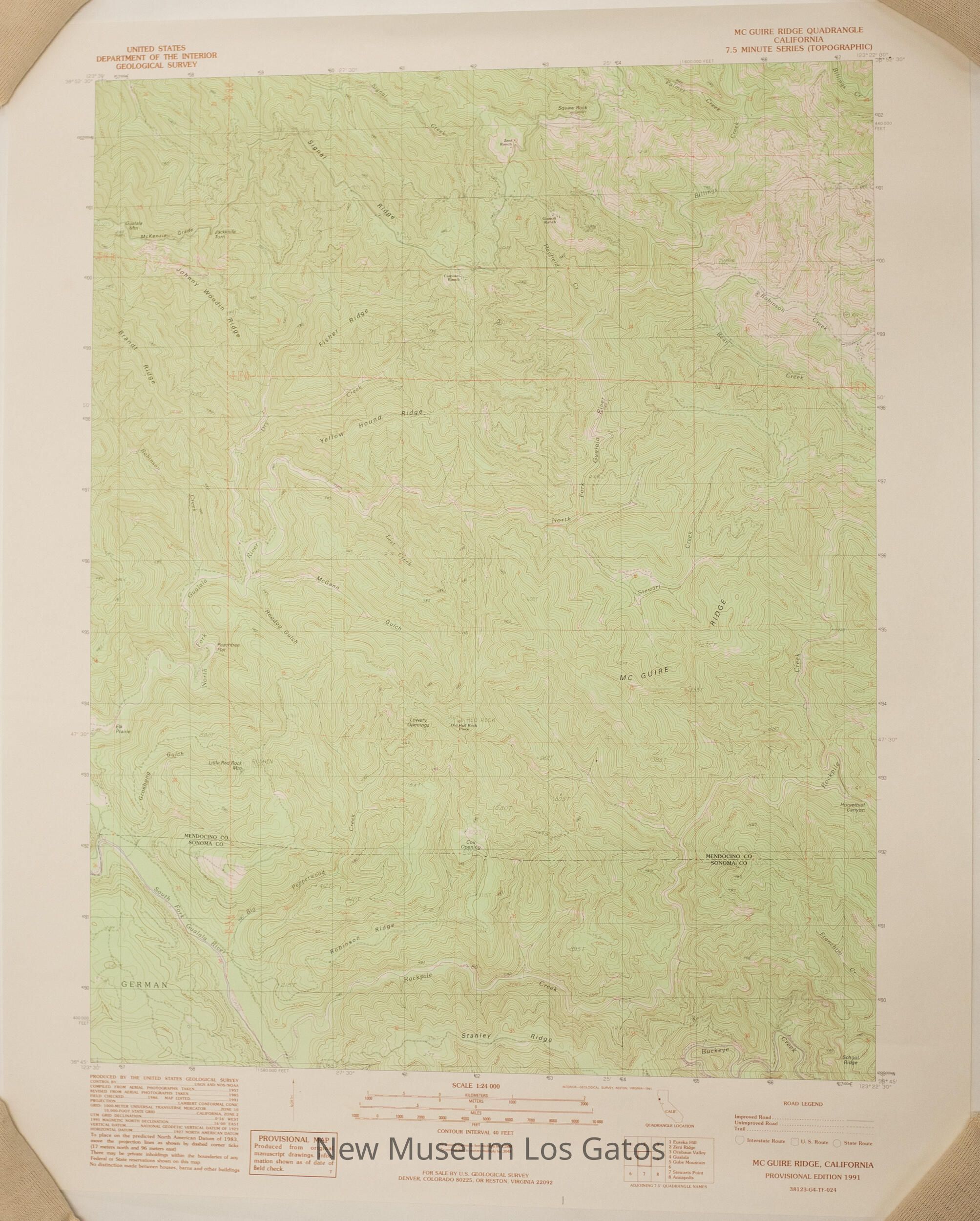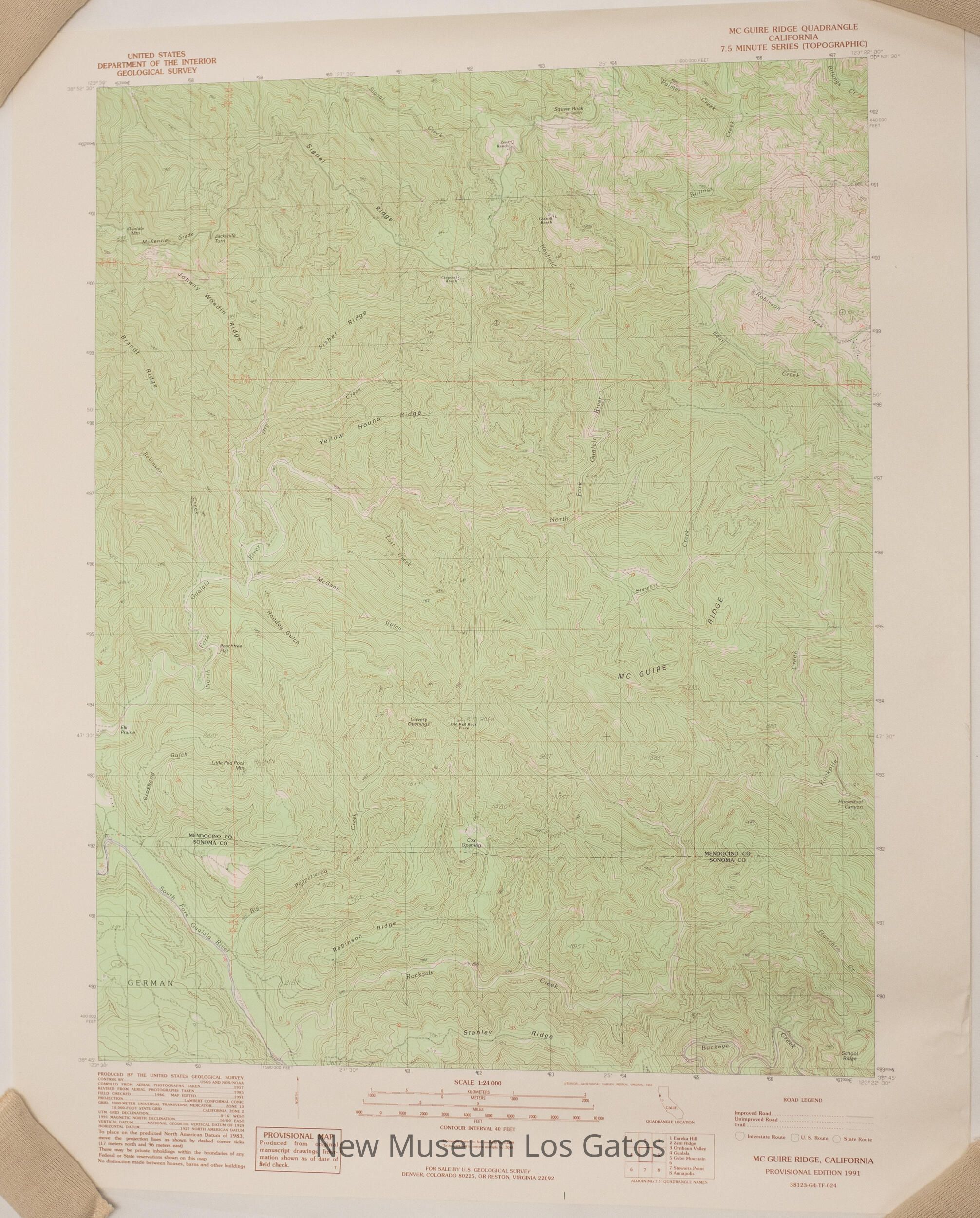Two identical copies of a topographic, color map of the McGuire Ridge quadrangle in Mendocino and Sonoma Counties, California.Collection