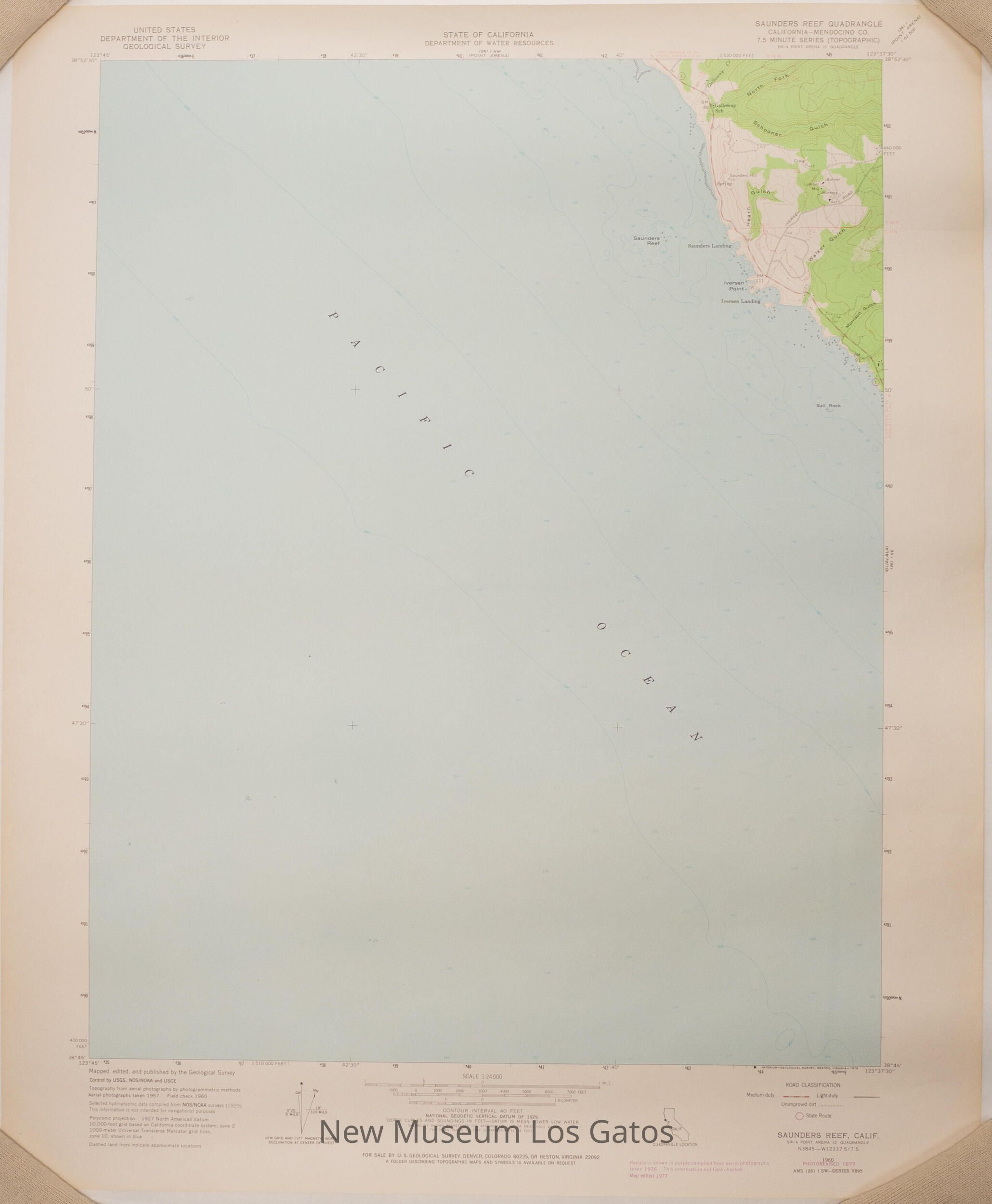 A topographic, color map of the Saunders Reef quadrangle in Mendocino County, California.Collection