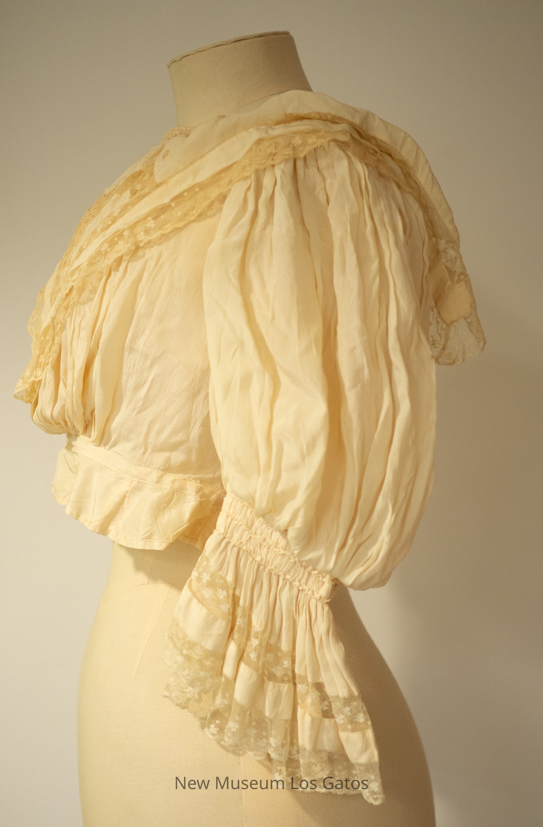 A two piece day dress, featuring a short, cropped cream-colored bodice. It has large puffy sleeves, ruching throughout the bodice and a decorative lace insertion on the chest. There is also lacing throughout the top as well. There are metal clasps on the back for closure.