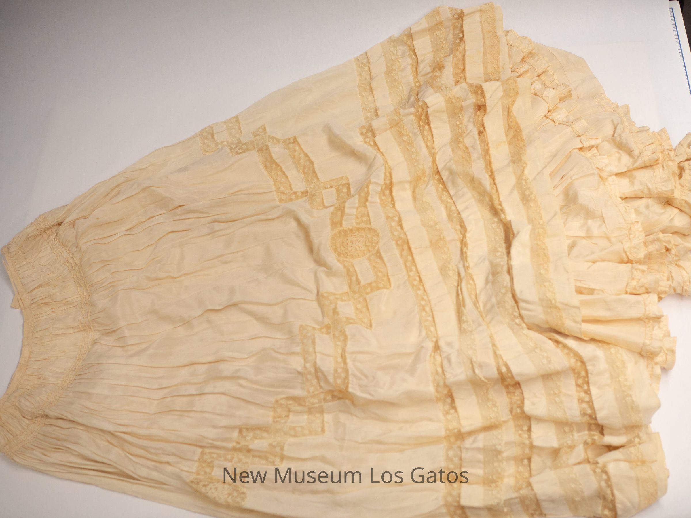 A matching long cream-colored skirt with a gathered waist line. It has a layered skirt hem and geometric decorative lace insertion and bands throughout the skirt. There are metal clasps for closure inside of the waistline of the skirt. There is a slight train, to be worn over a bum pad.Collection