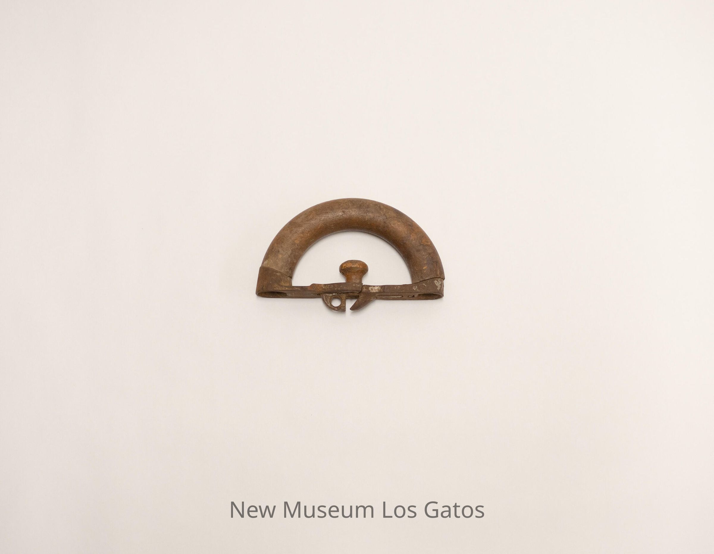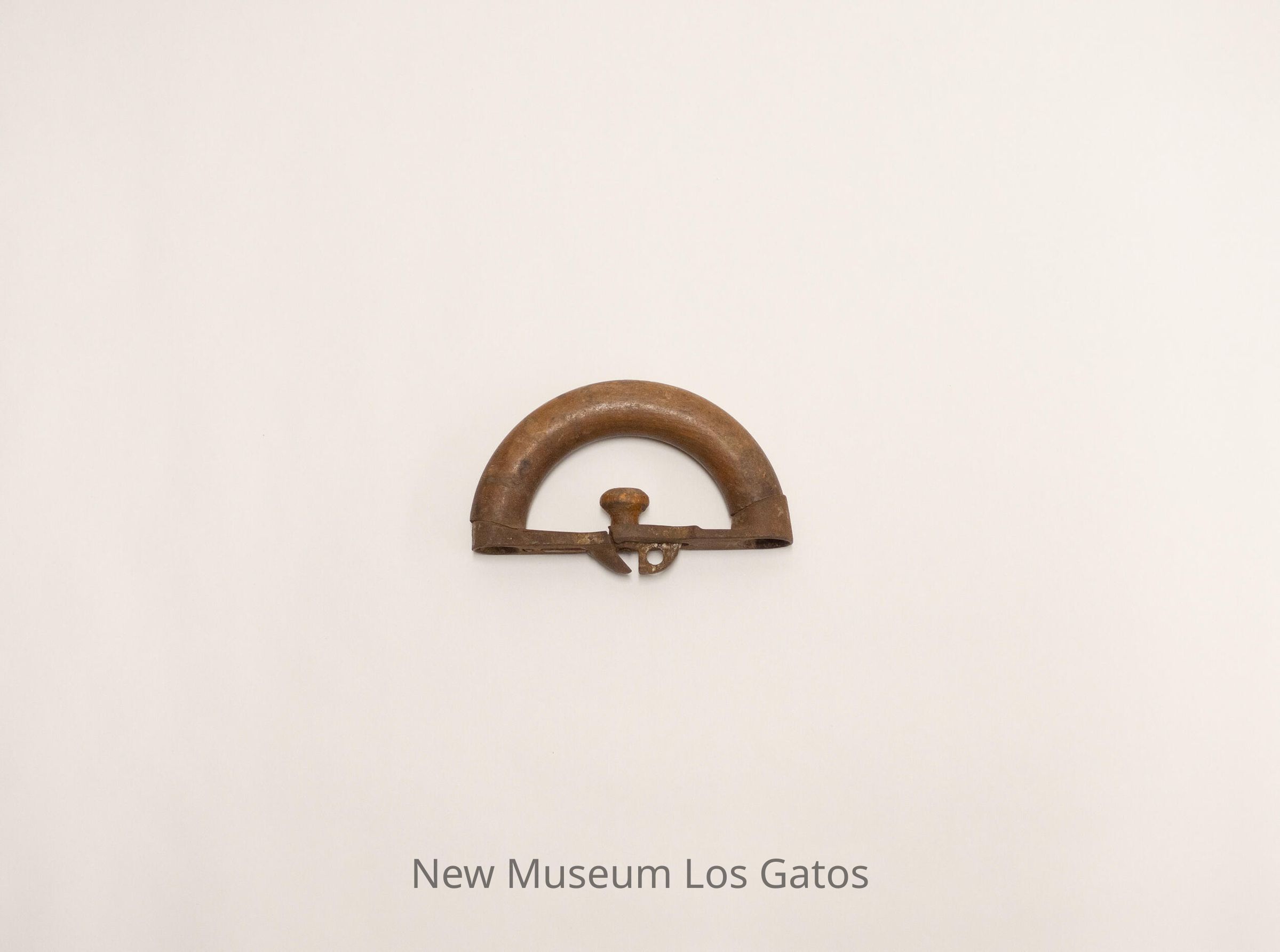 Wood and metal handle, in the shape of a half circle. A small wooden handle in the center partially lifts up the part of the metal portion, that would allow it to detach from the iron base.Collection