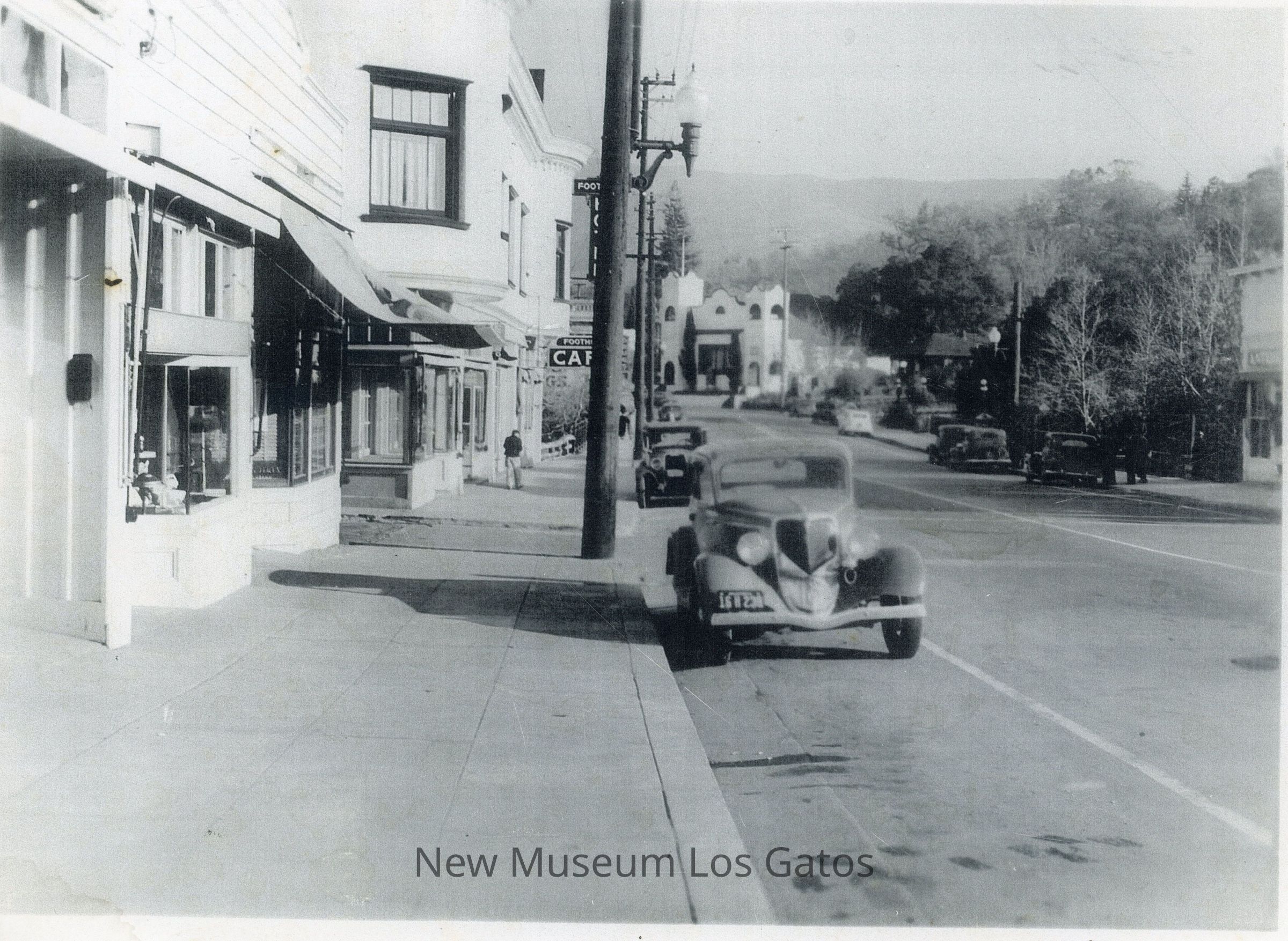 A black and white photograph, likely an enlargement, of the view down Main Street in Los Gatos, California. The photograph is taken from the edge of the sidewalk, with buildings and storefronts to the left, and the street to the right. There are numerous cars parked along the street.Photograph Details
