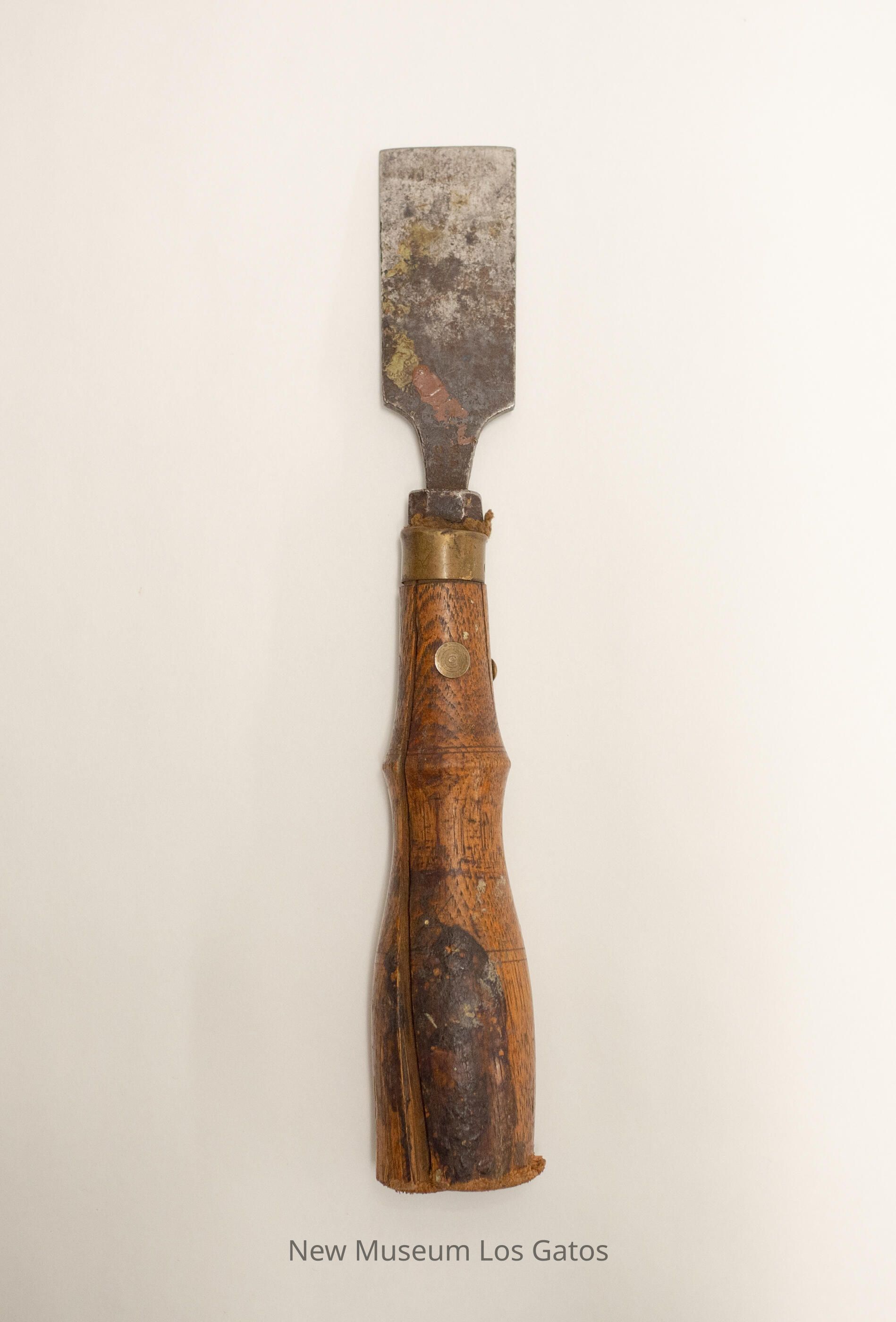 A large, broad metal blade attached to a large wooden handle. There is a strip of brass where the blade attaches to the handle, and two brass screws near the top of the handle.Collection