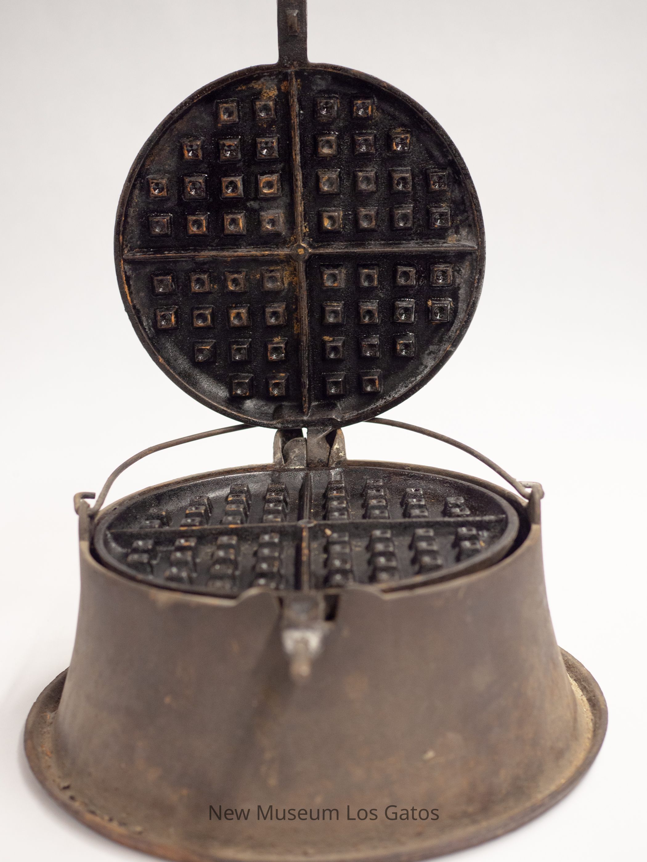 A large, cast iron waffle maker, that has a thin metal handle and a large metal base.The inside is black, with multiple small squares throughout the pan on the top and bottom. There is a ball hinge where the top and bottom of the waffle maker meet.