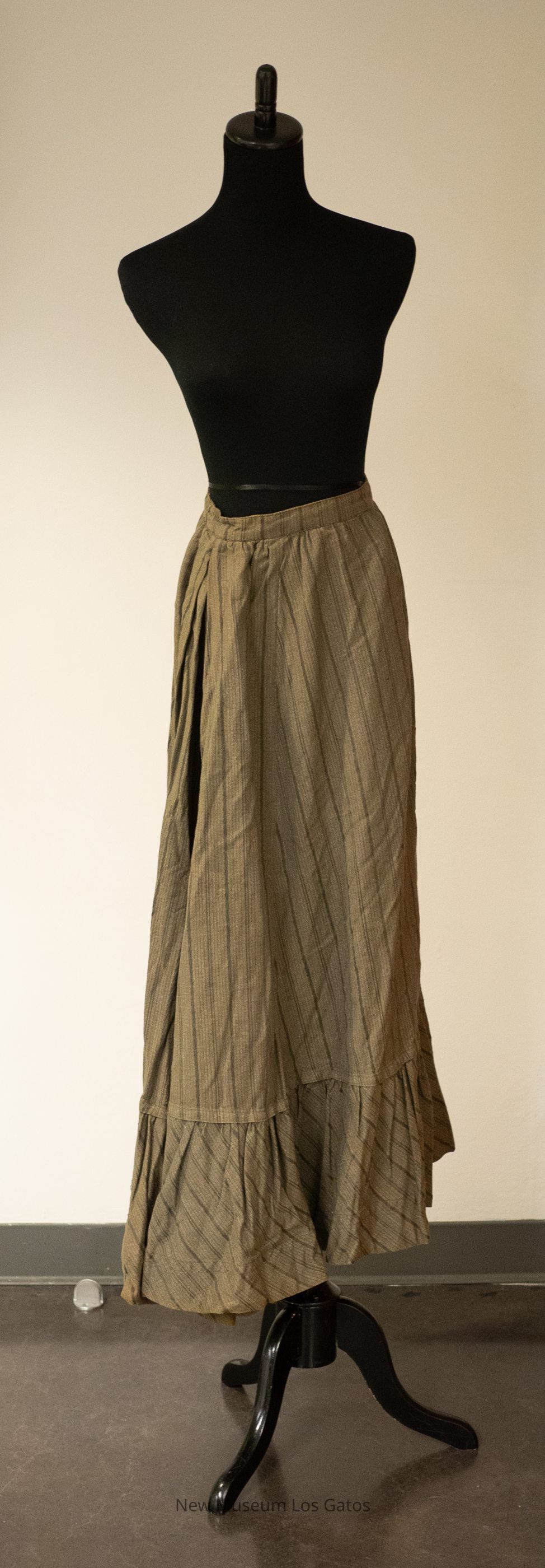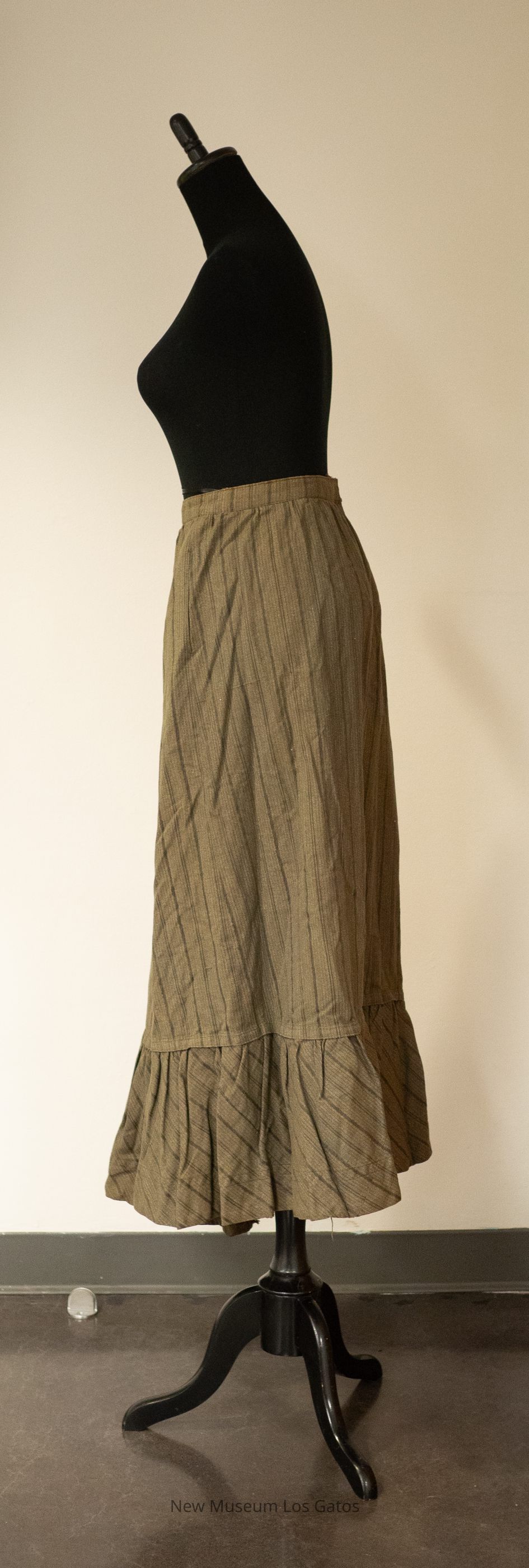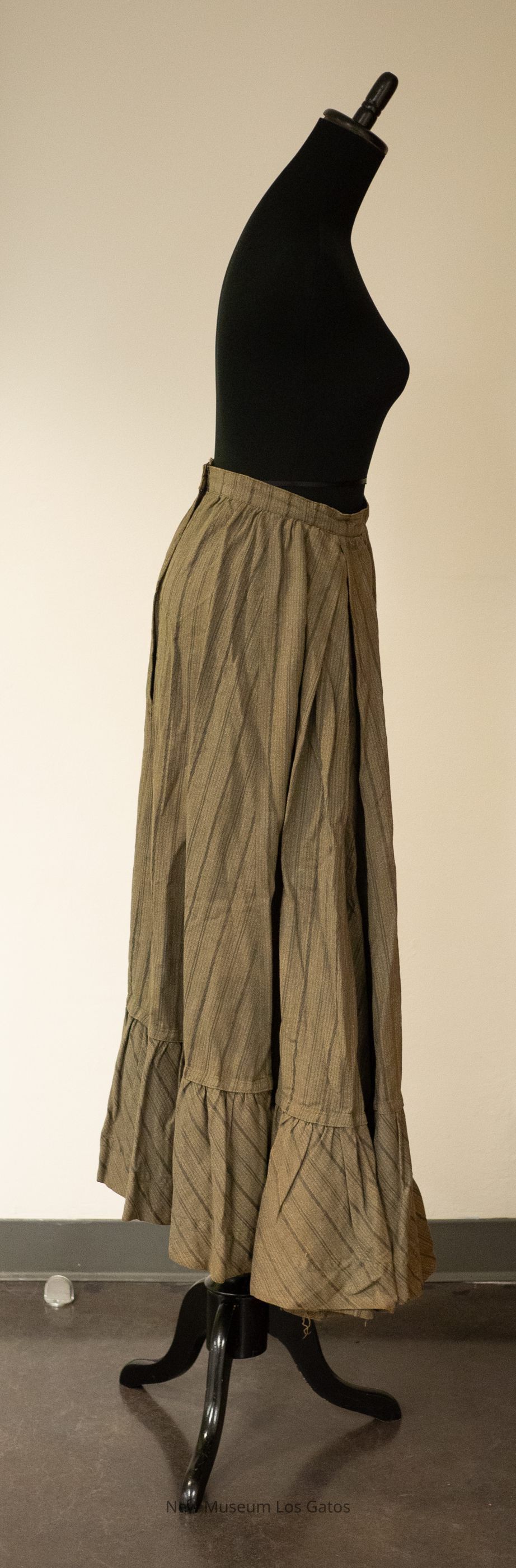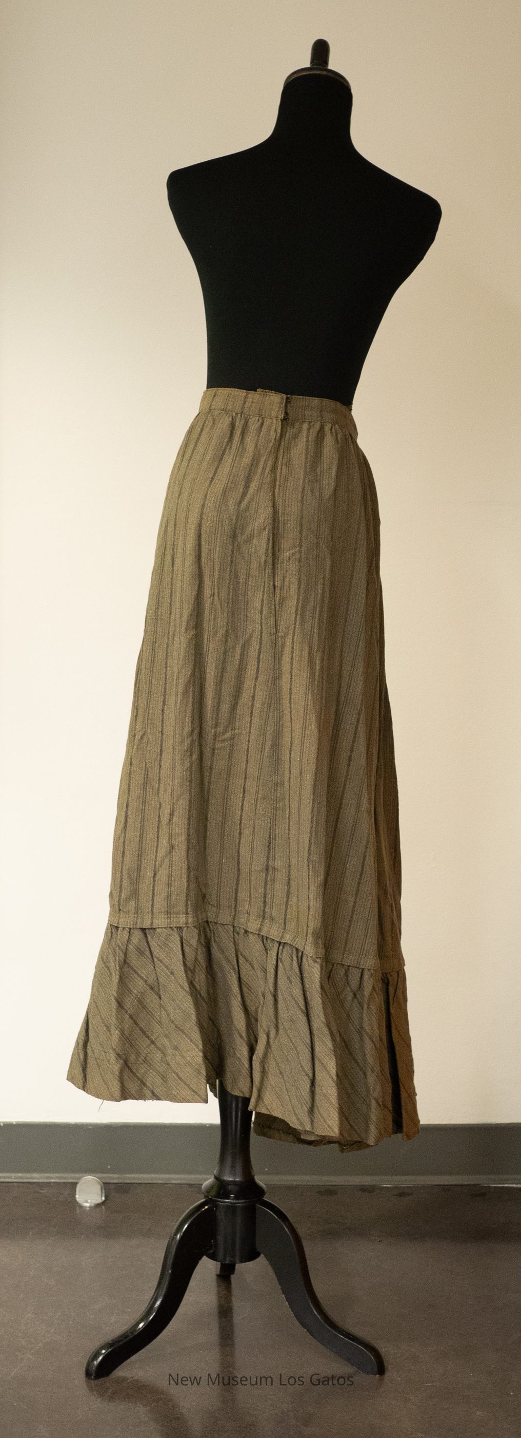 A long, olive-colored walking skirt. There are darker olive vertical stripes throughout the skirt. The skirt opens at the side, and closes with two hook-and-eye clasps.Collection