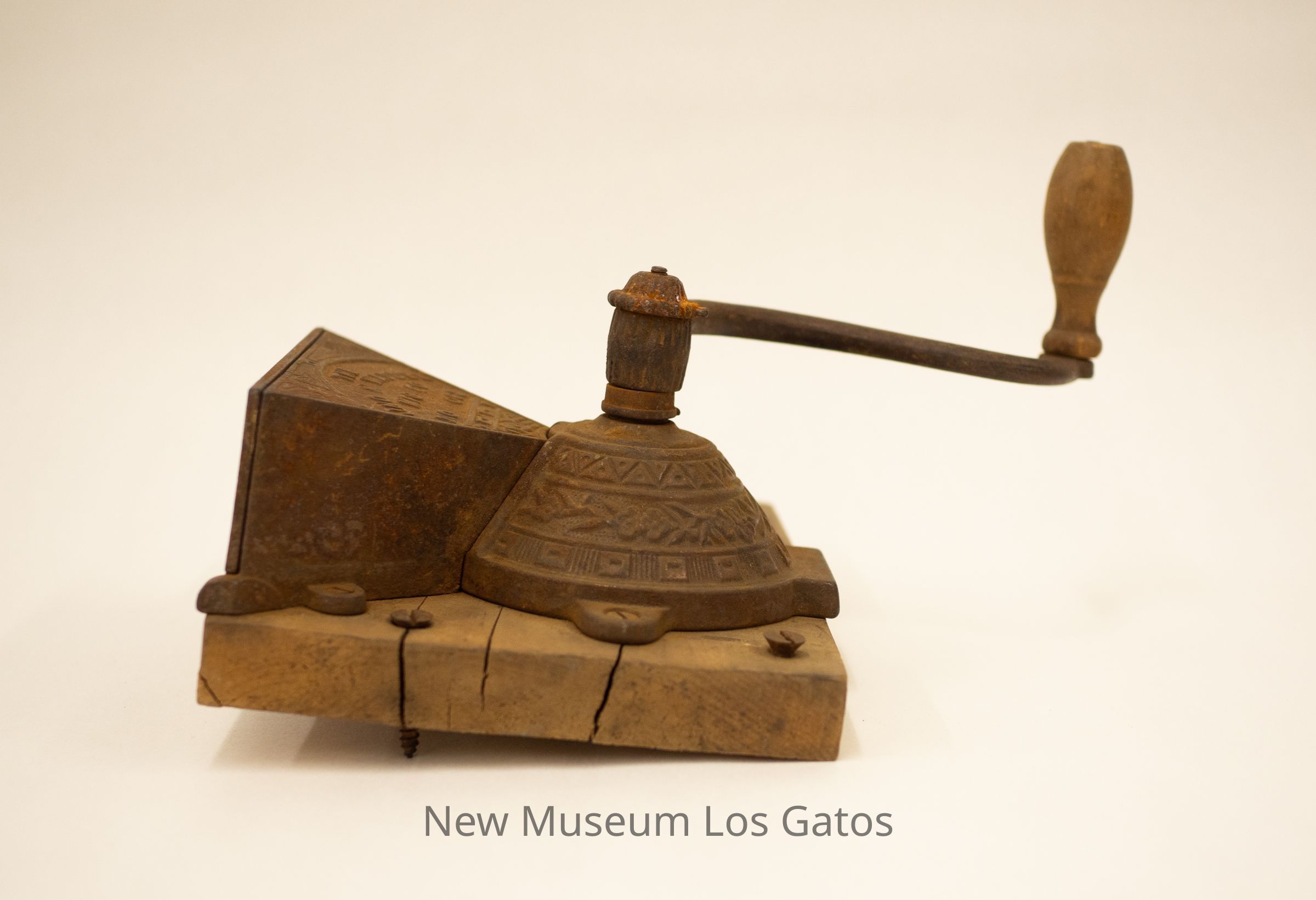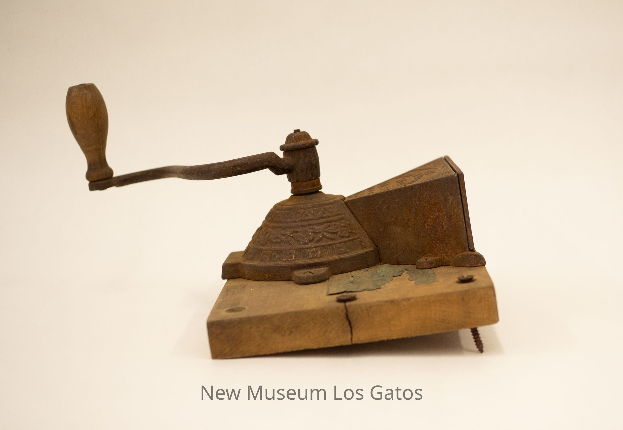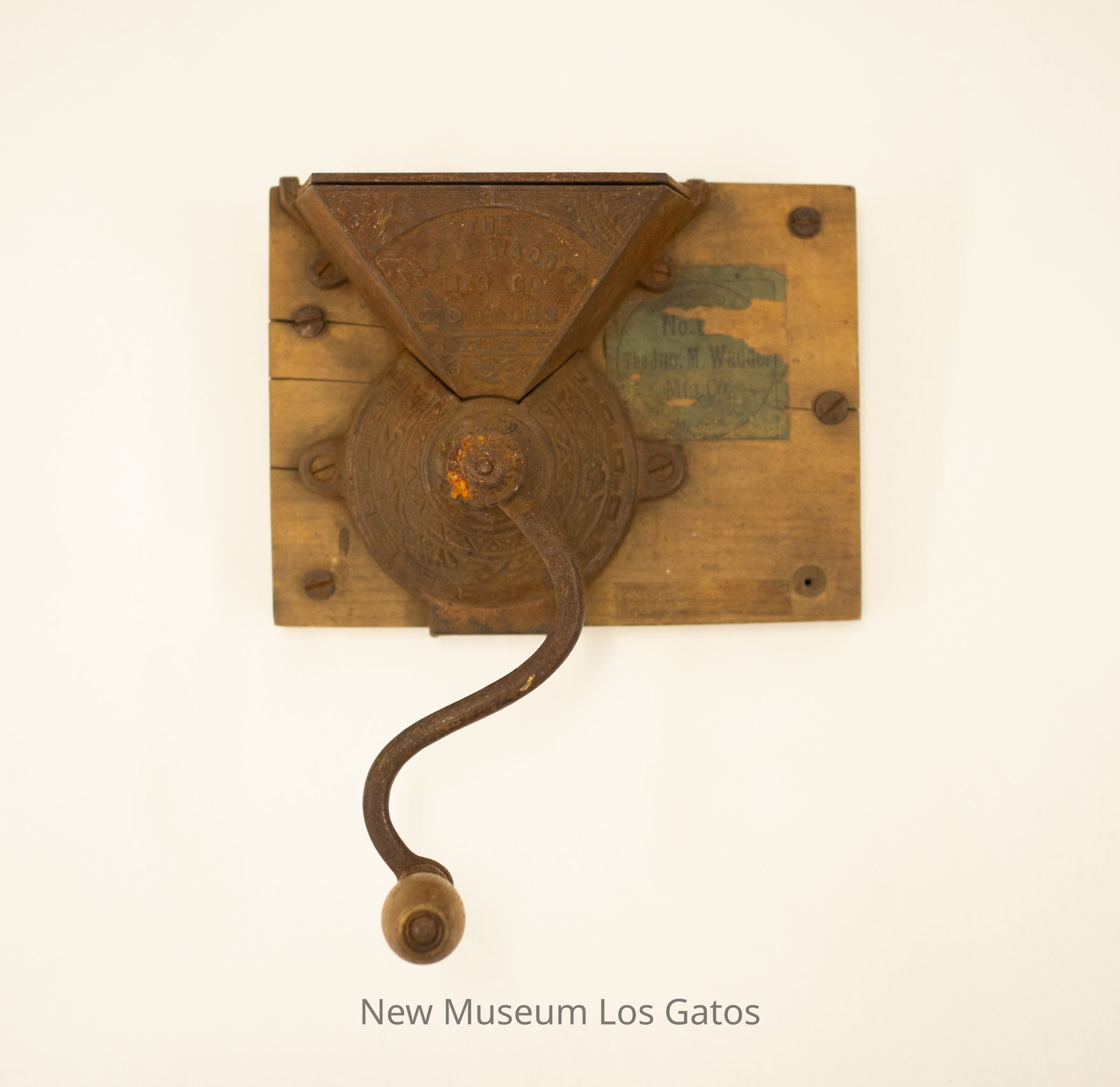 A metal coffee grinder, attached to a rectangular piece of wood that is intended to be mounted onto a wall. The coffee grinder itself consists of a funnel at the top with a hinged lid, that leads to a circular grinding mechanism. The grinding mechanism is operated by a curved metal arm with a wooden handle. At the bottom of the the grinding mechanism is a small rectangular opening, which allows the fresh coffee grounds to fall through. The grinder is secured to its wooden base with four screws; the wooden base also has four screws in it, for securing to to the wall.Collection