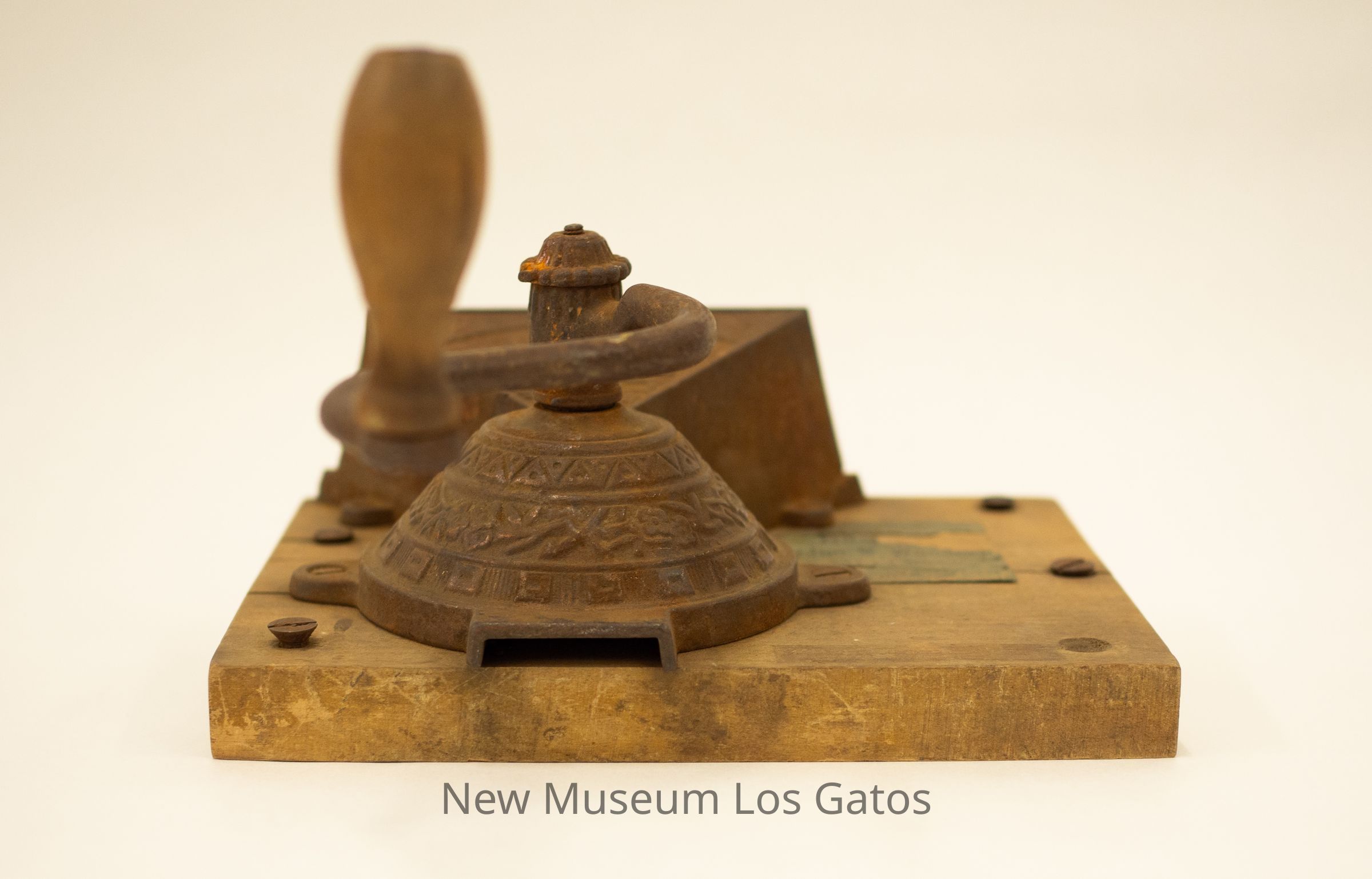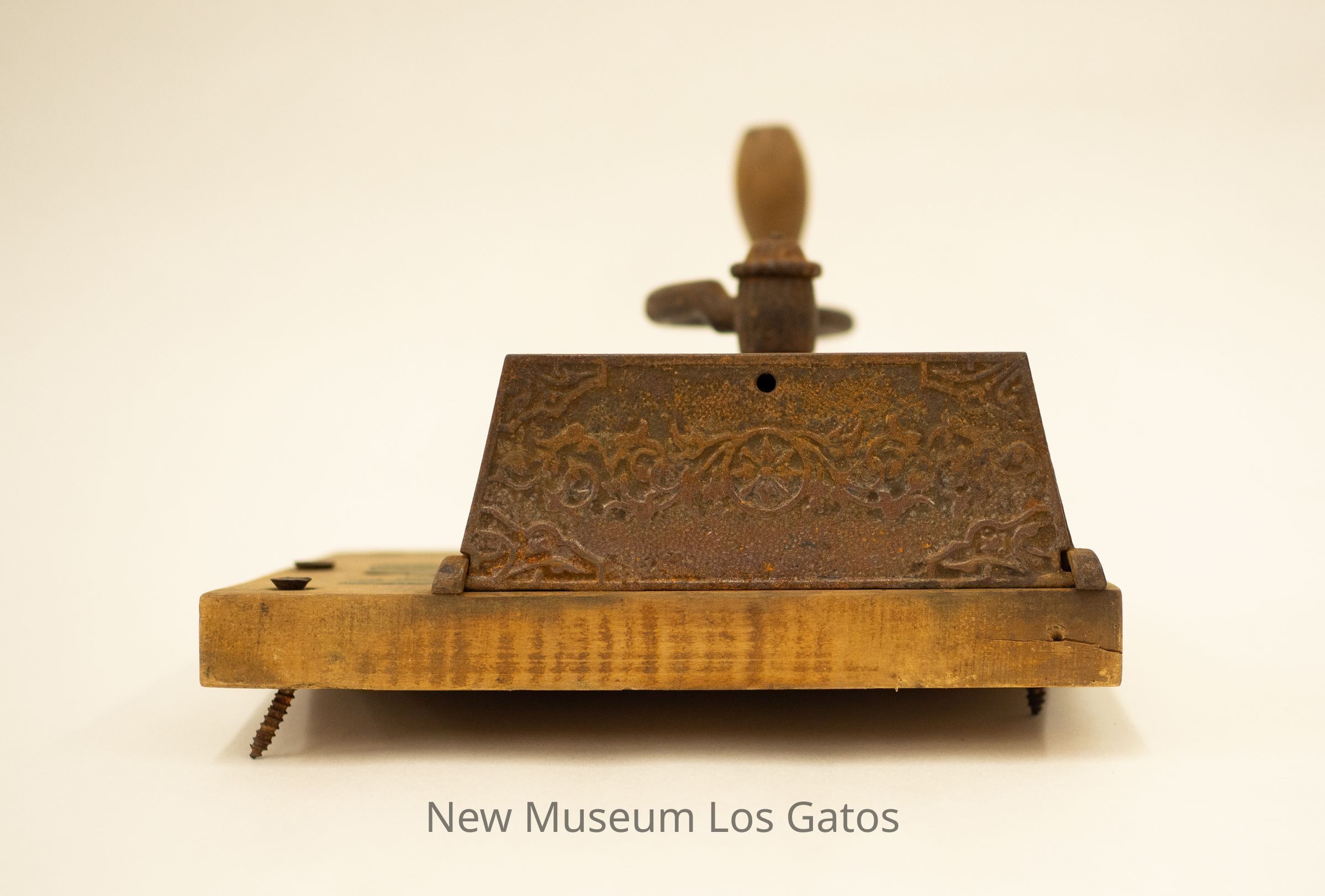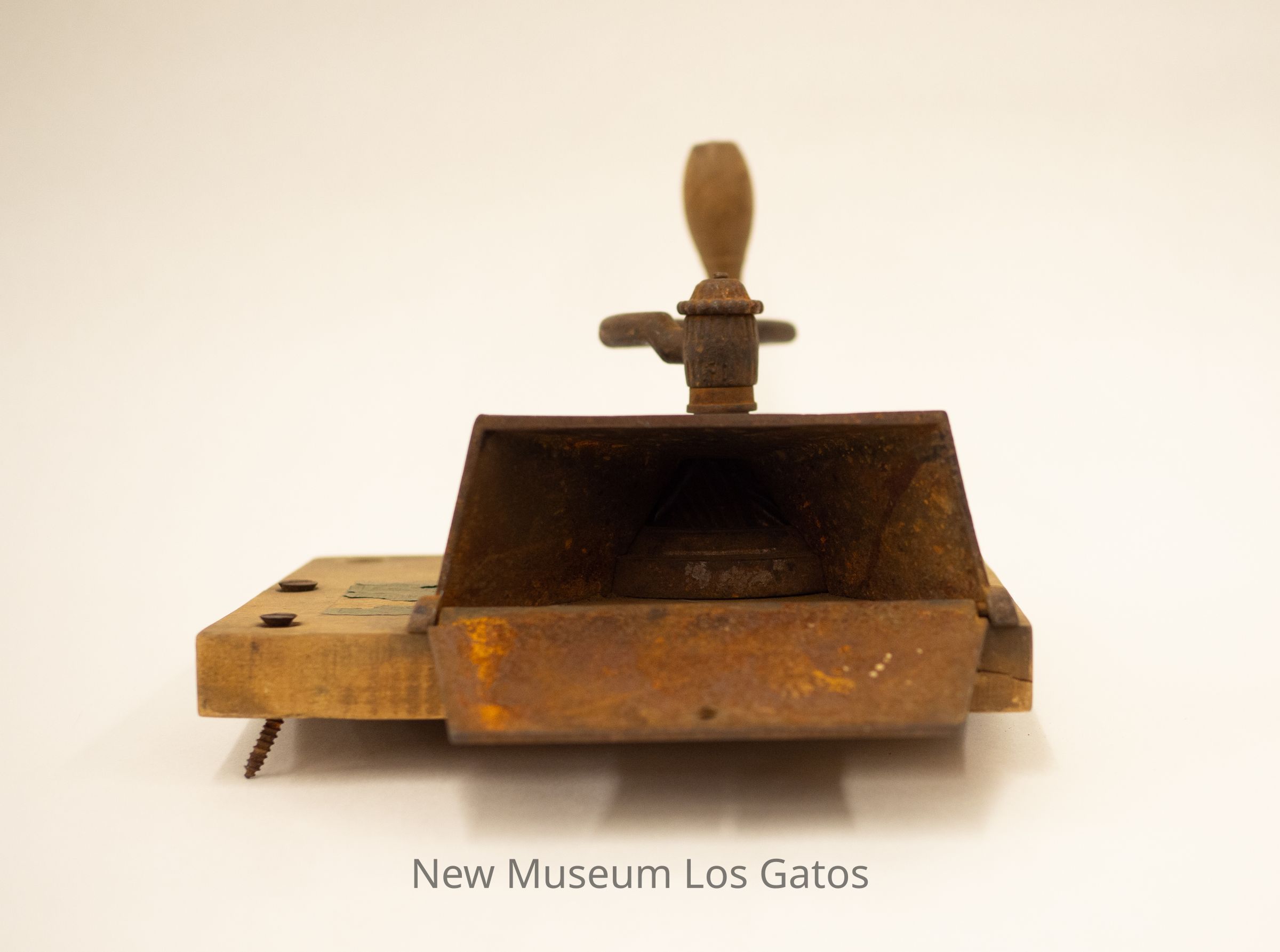 A metal coffee grinder, attached to a rectangular piece of wood that is intended to be mounted onto a wall. The coffee grinder itself consists of a funnel at the top with a hinged lid, that leads to a circular grinding mechanism. The grinding mechanism is operated by a curved metal arm with a wooden handle. At the bottom of the the grinding mechanism is a small rectangular opening, which allows the fresh coffee grounds to fall through. The grinder is secured to its wooden base with four screws; the wooden base also has four screws in it, for securing to to the wall.Collection