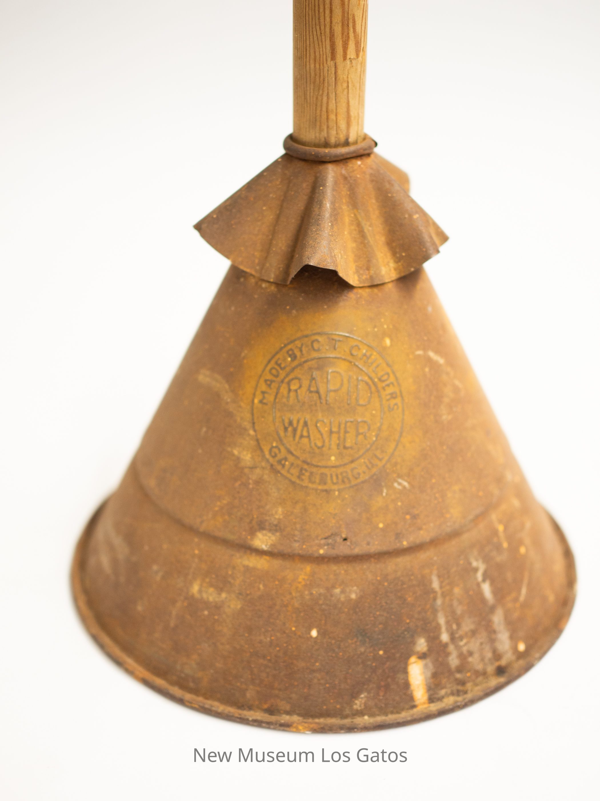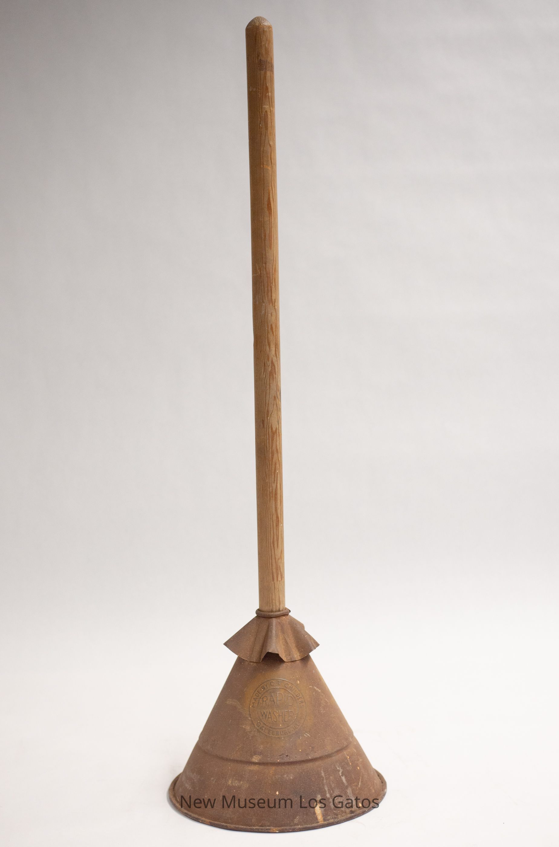 A plunger, consisting of a long wooden shaft connected to a metal conical cylinder.Collection