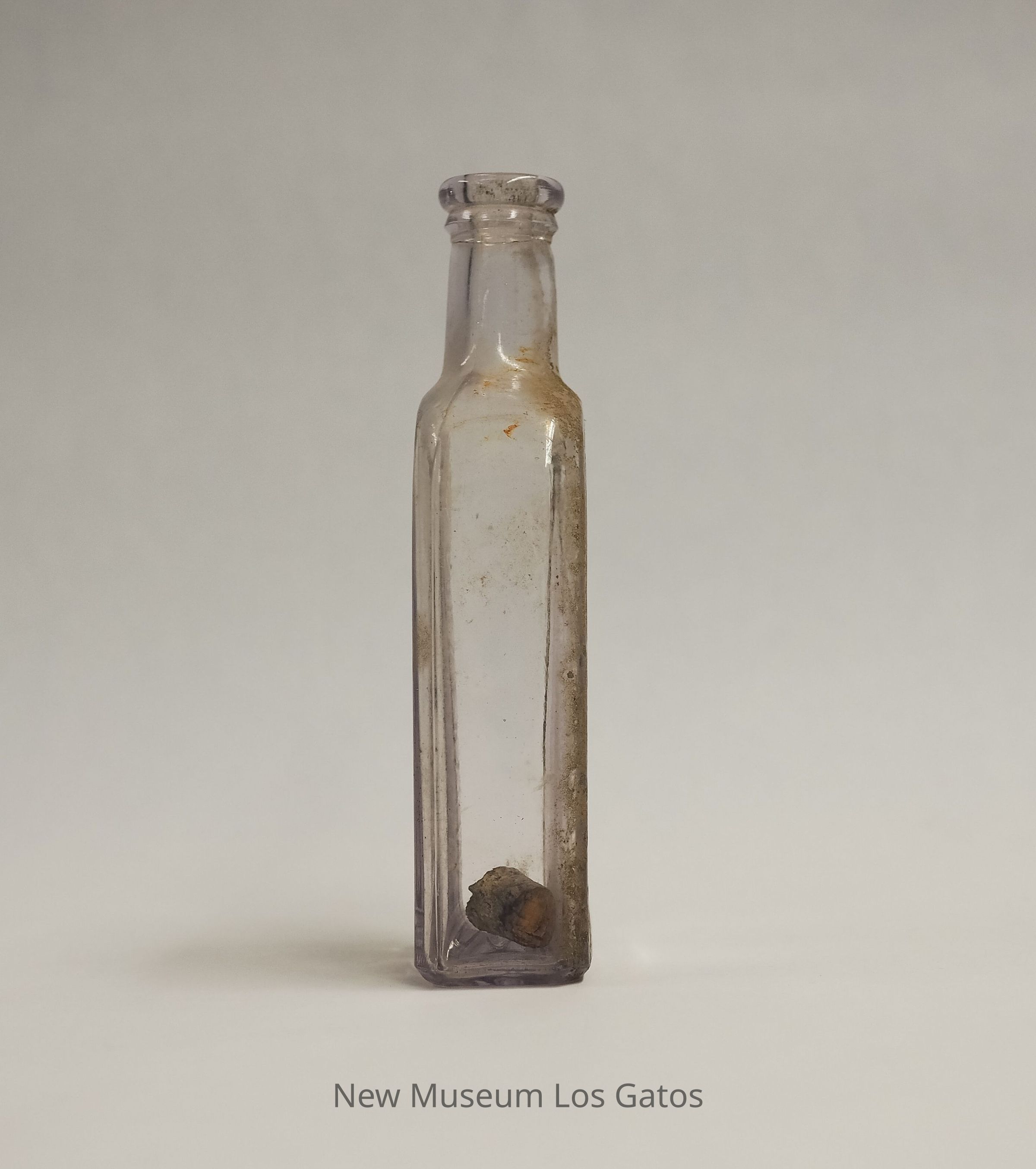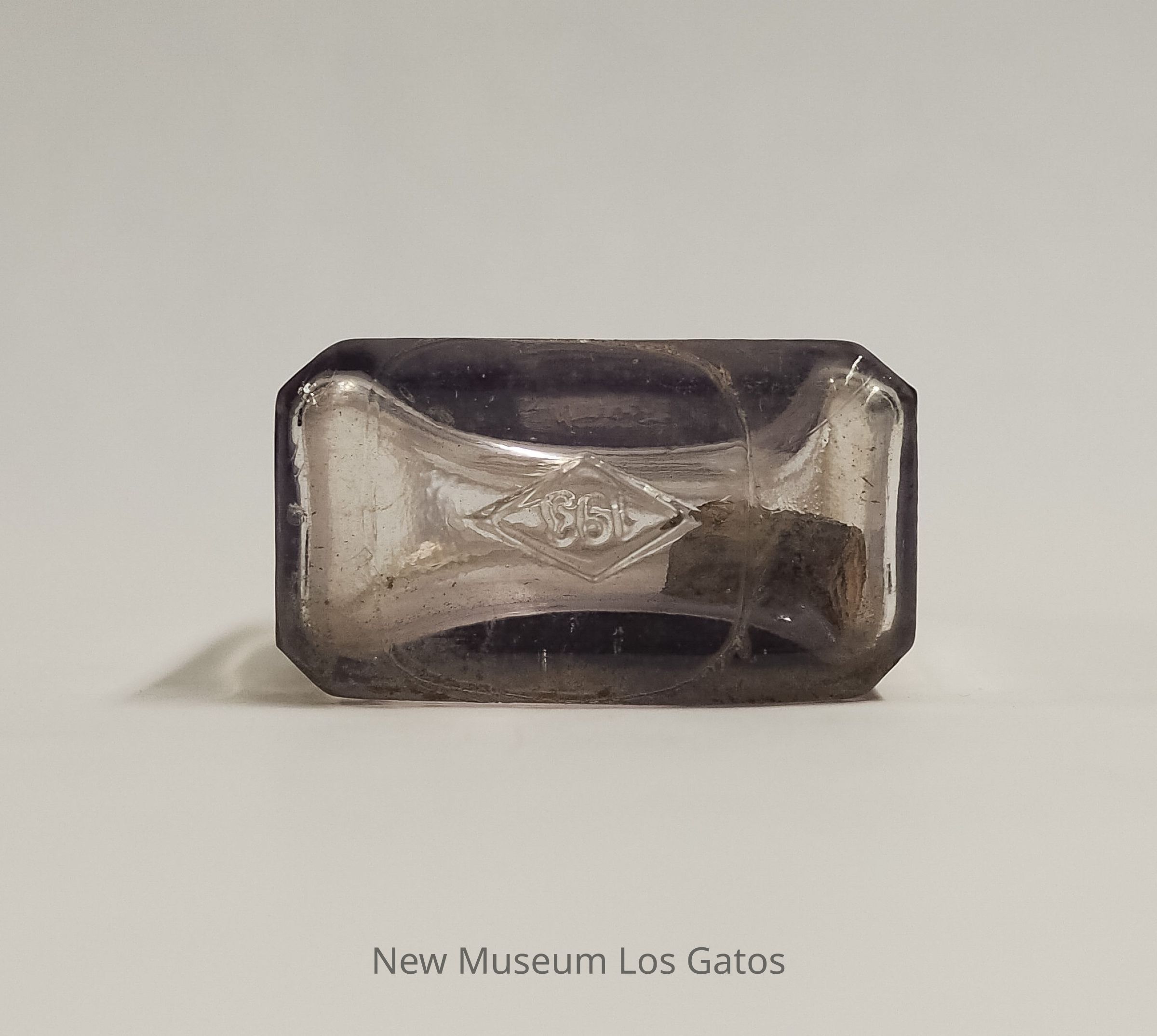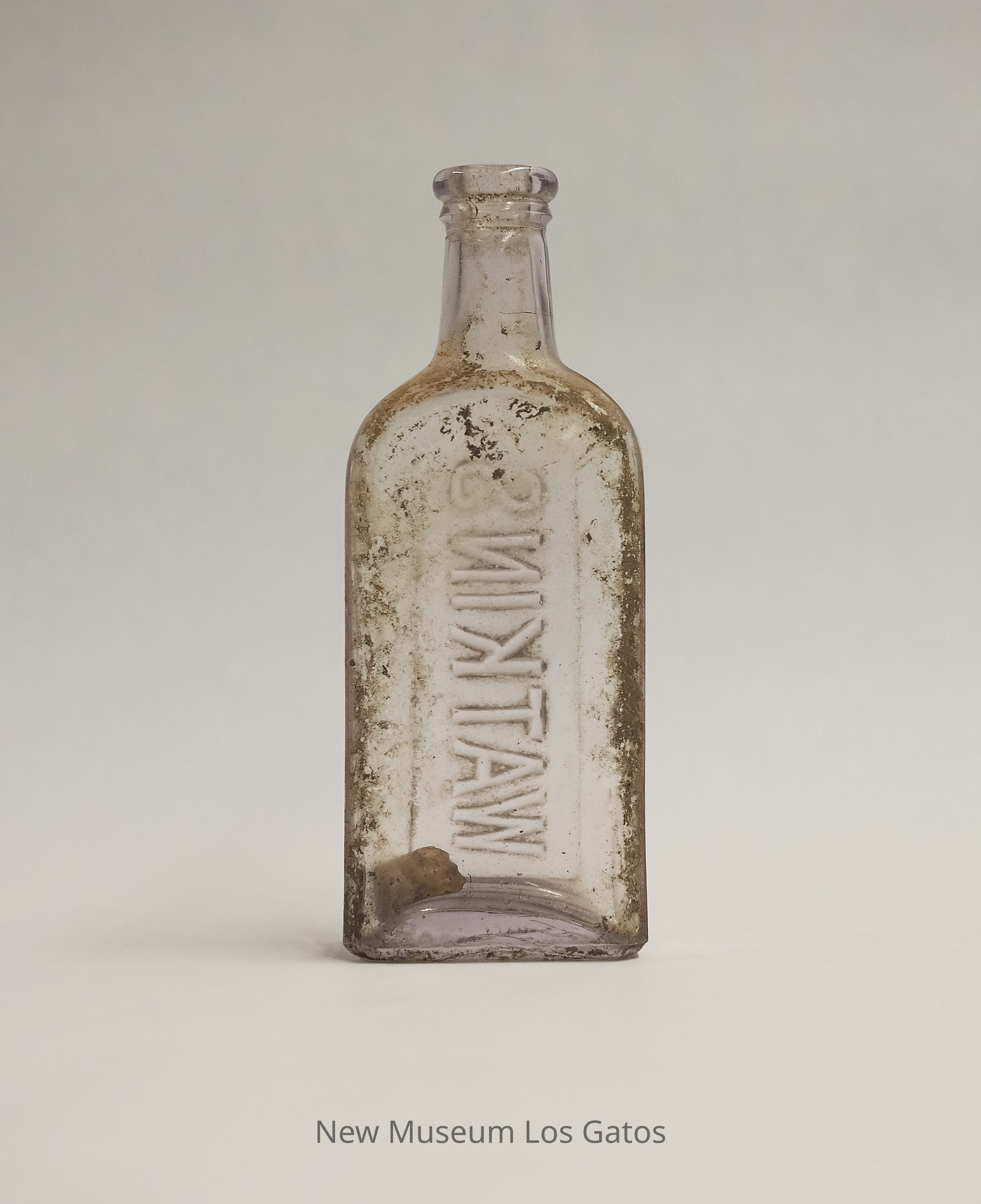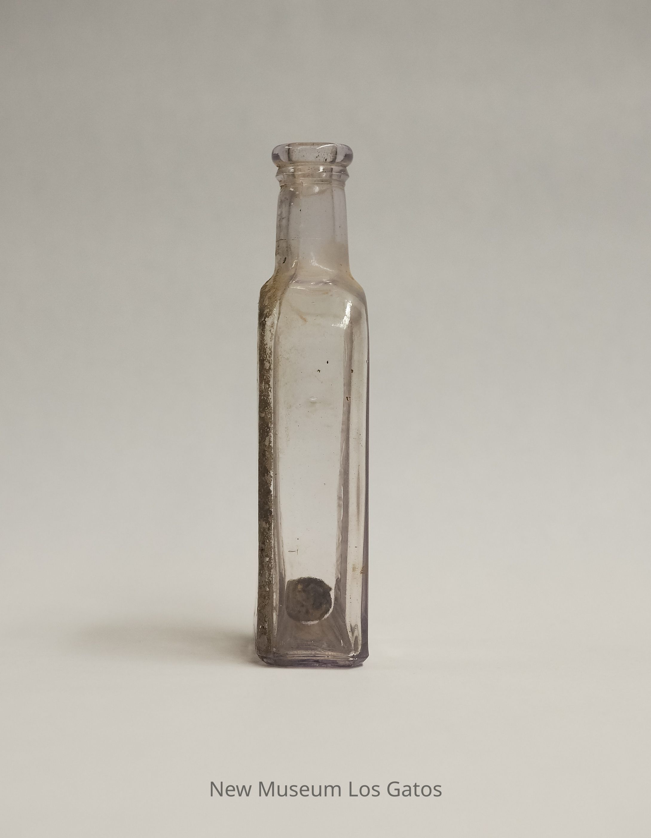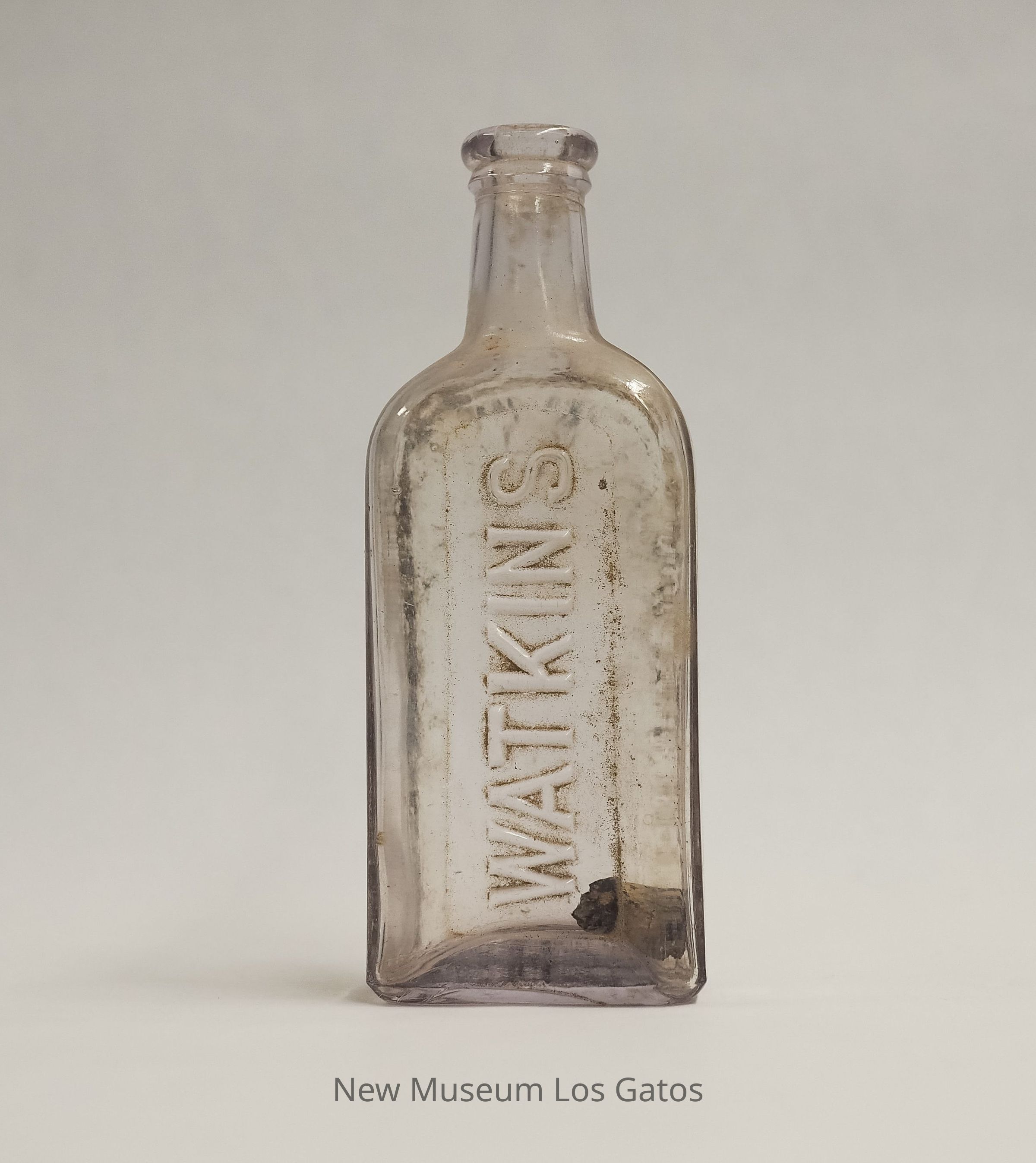 A clear, rectangular glass bottle with a purple tint, labelled "Watkins." This likely contained flavoring or extract originally.Collection