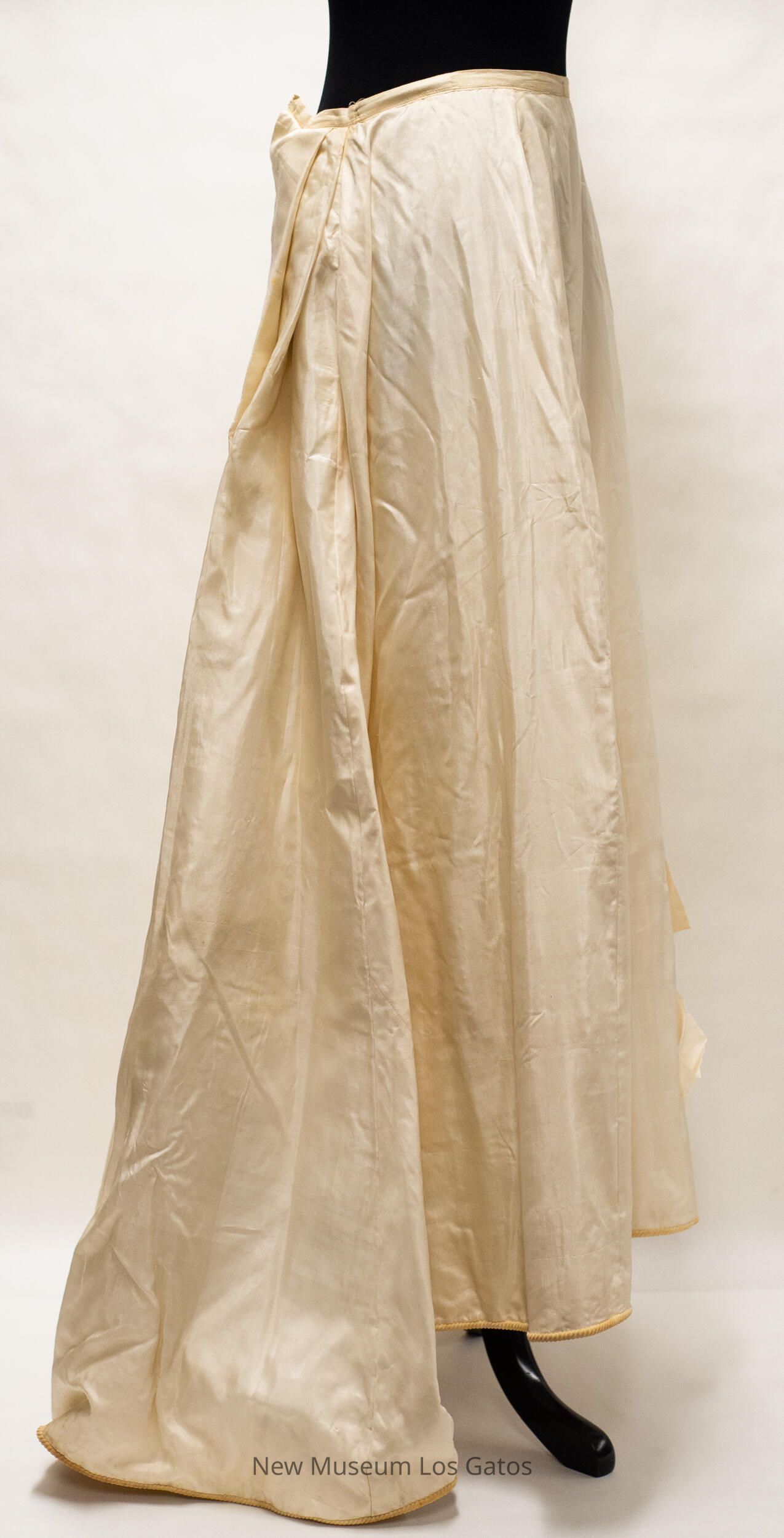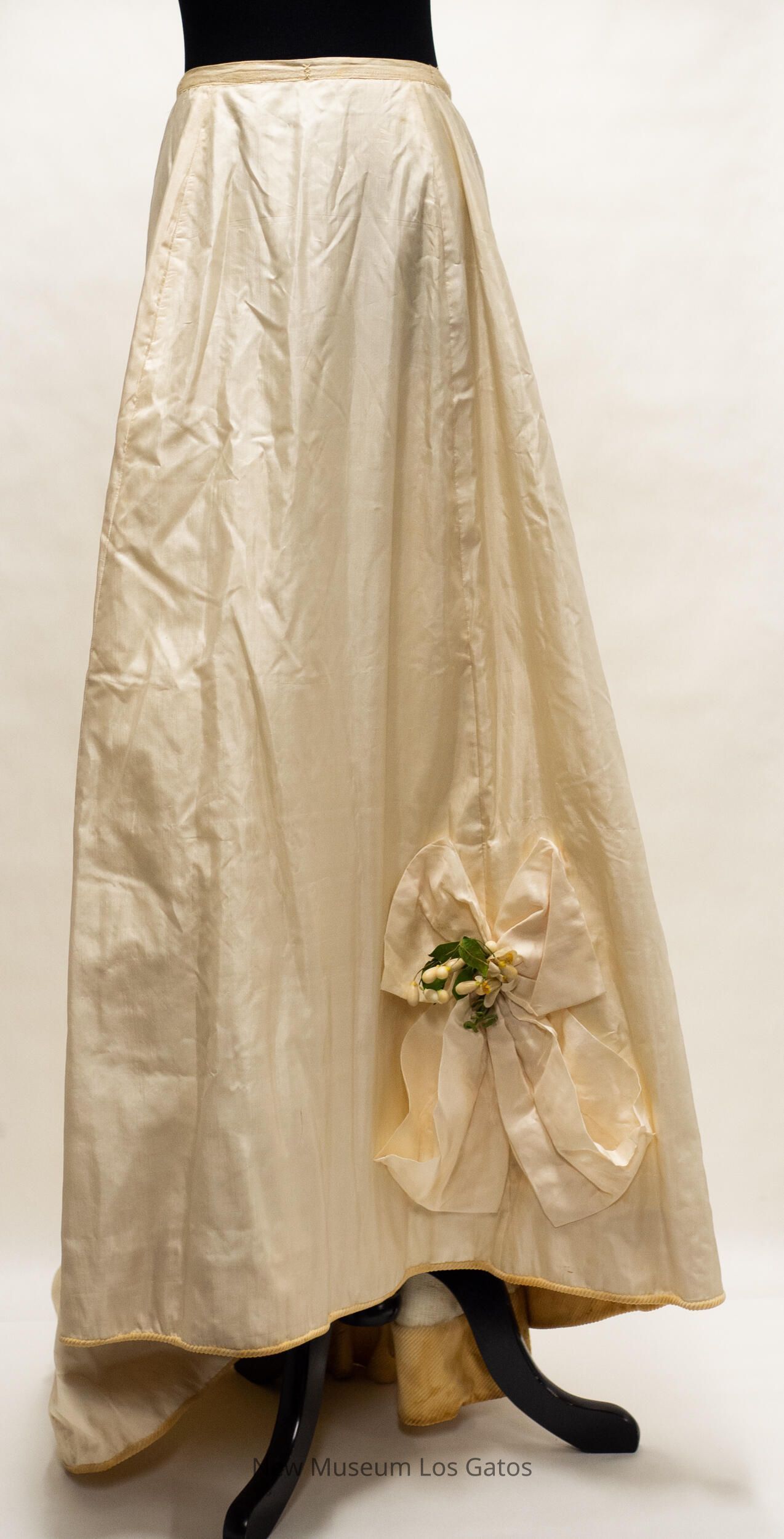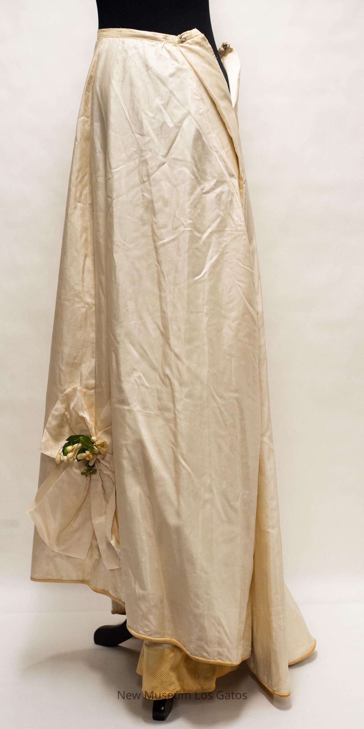 A long, light cream colored skirt. The skirt opens part way in the back, towards the top, and closes with two hook-and-eye clasps. The hem of the skirt is lined with a heavy, darker cream colored corduroy-like fabric. On the lower left of the front of the skirt is a decorative bow with artificial leaves and white flowers.Collection