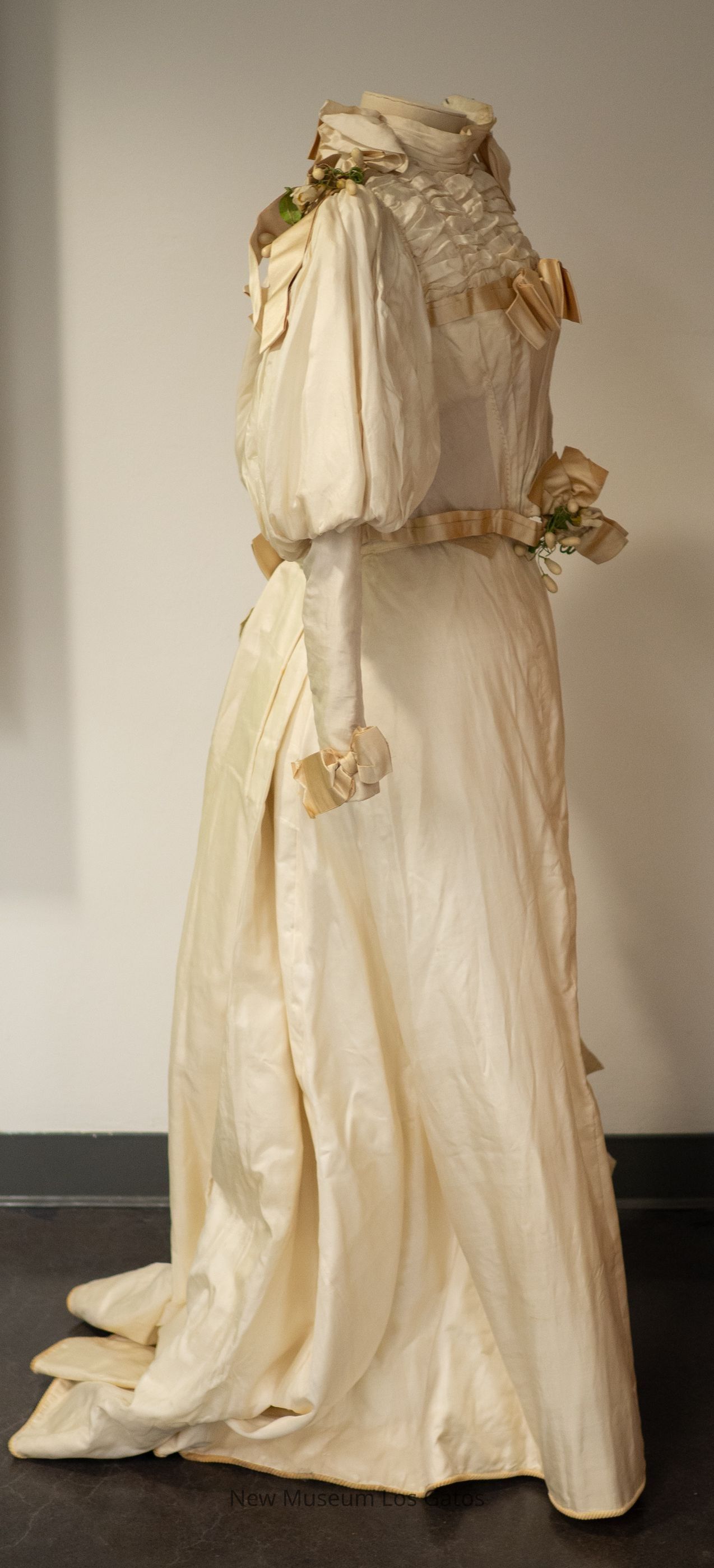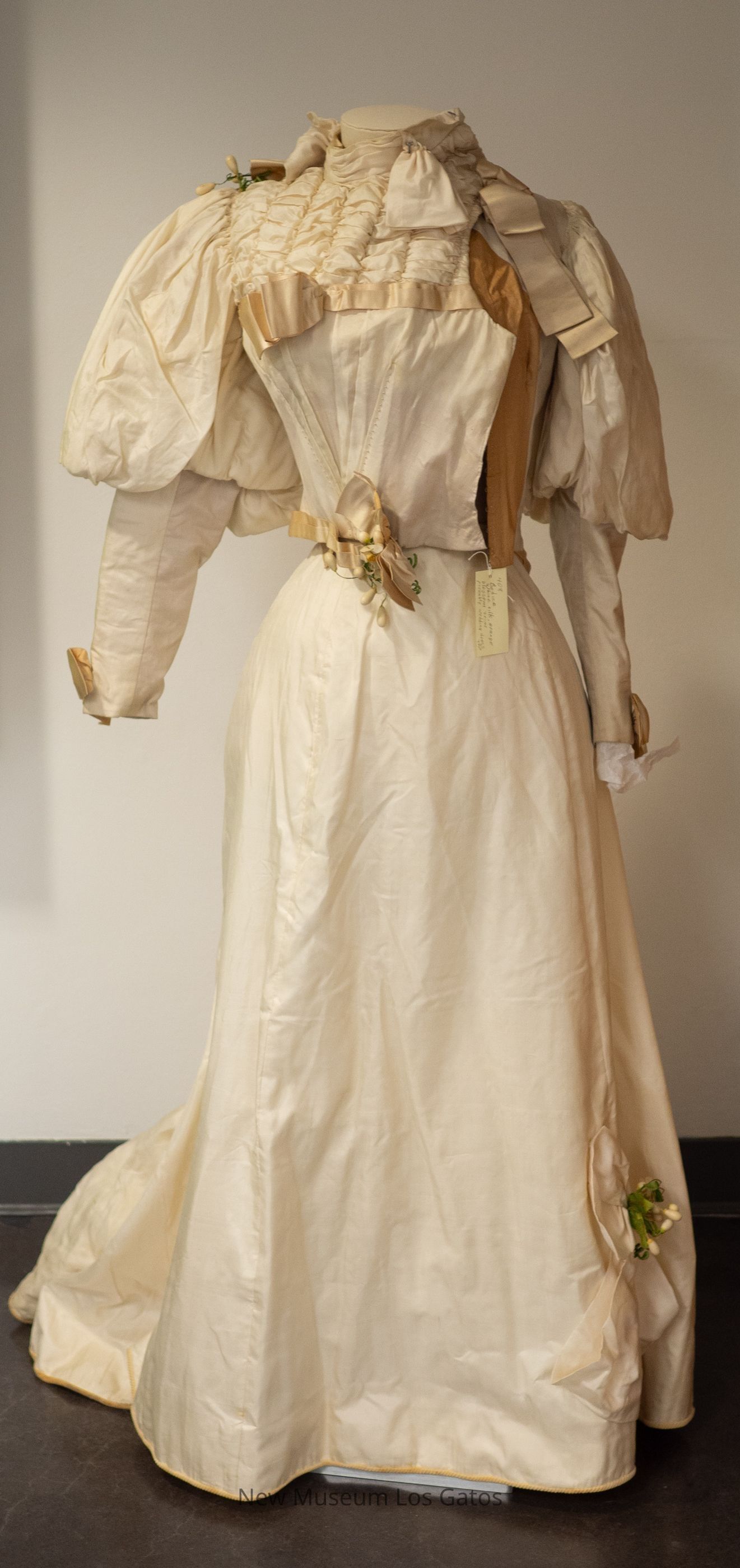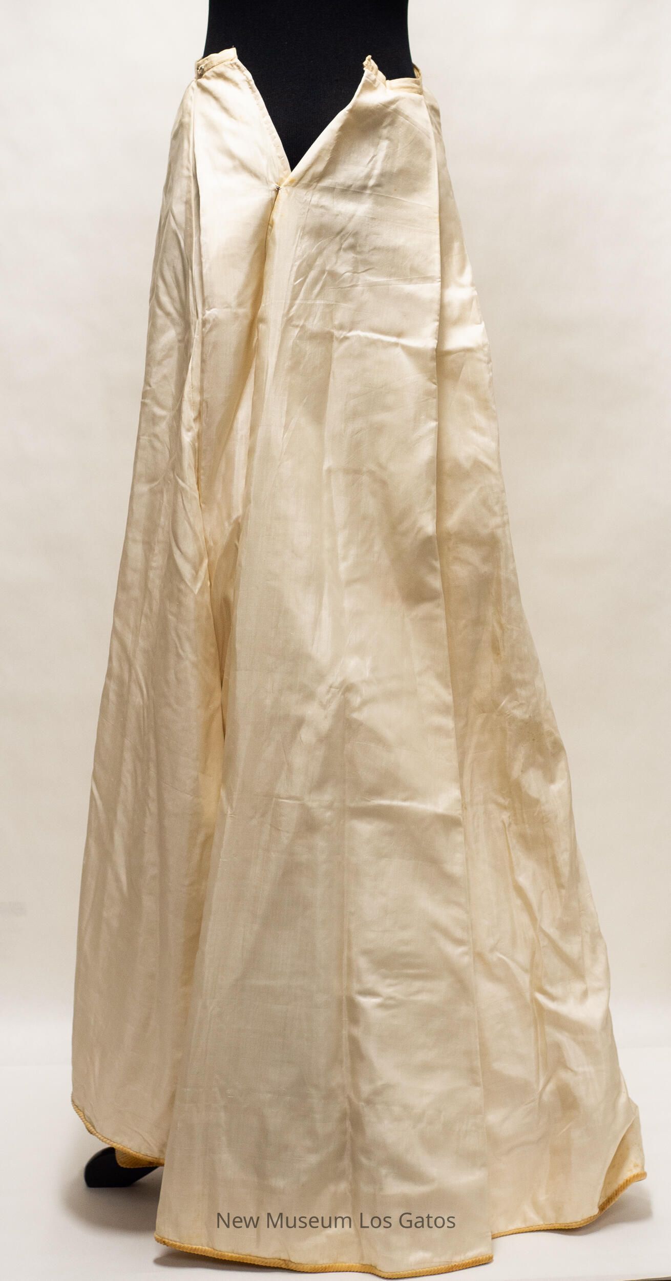 A long, light cream colored skirt. The skirt opens part way in the back, towards the top, and closes with two hook-and-eye clasps. The hem of the skirt is lined with a heavy, darker cream colored corduroy-like fabric. On the lower left of the front of the skirt is a decorative bow with artificial leaves and white flowers.Collection