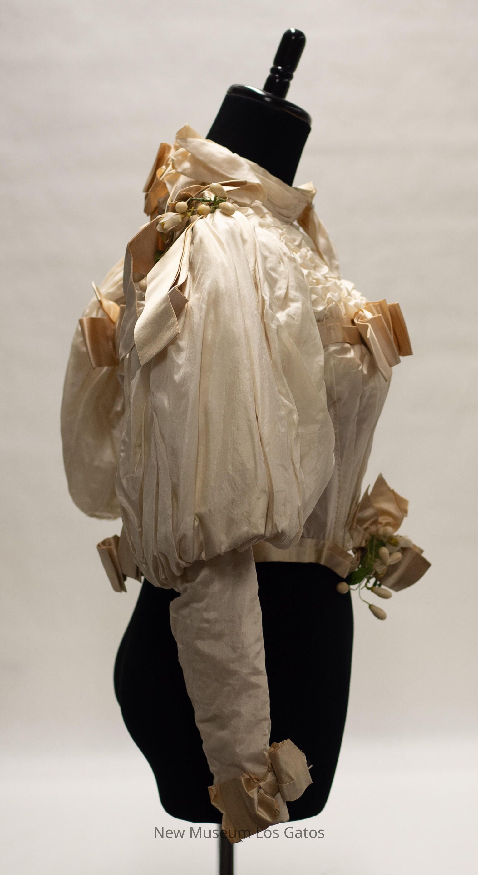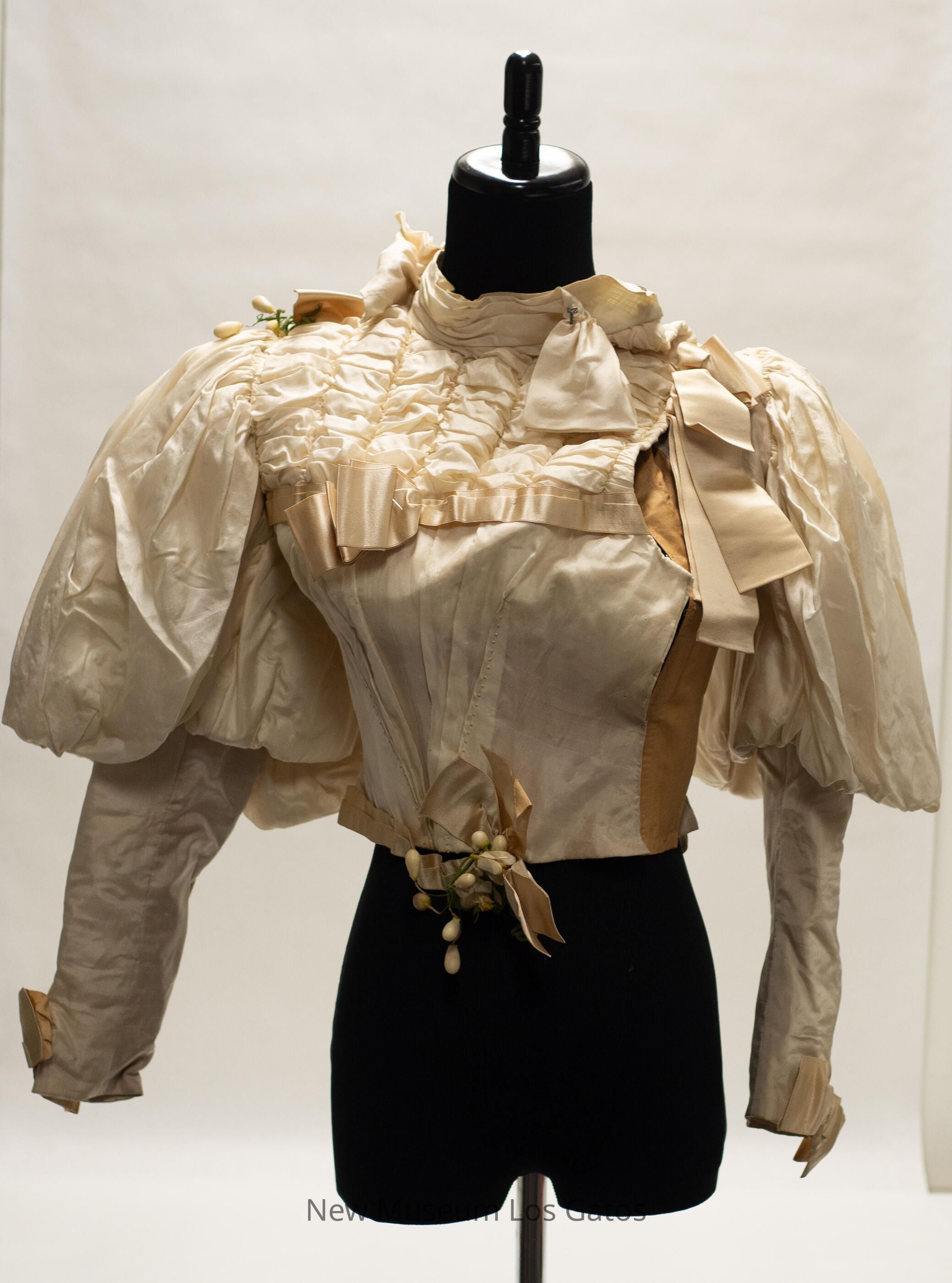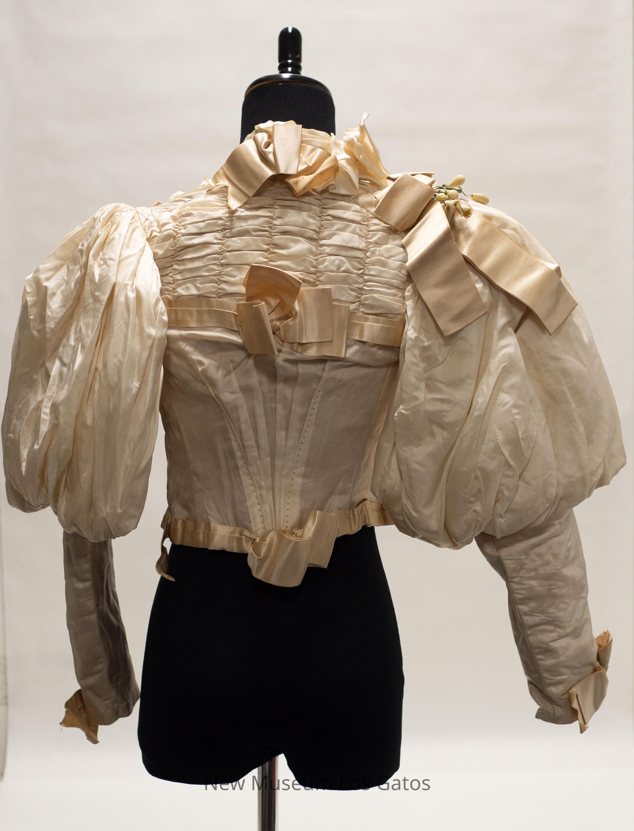 A cream-colored silk bodice, with large puffy sleeves. There are cream-colored ribbon bows at the bottom of the sleeves, and ribbon around the waist of the bodice, with a bow near the front. There is also ribbon at the chest, with a bow in front, along the back, with a bow in the middle, and at both shoulders, with bows. There is decorative ruching along the yoke, as well as the upper back. There are two synthetic flower/leaf decorations, one at the waist and one on the right shoulder. The bodice opens at the front, down the left side, and closes with metal hook-and-eye clasps.Collection