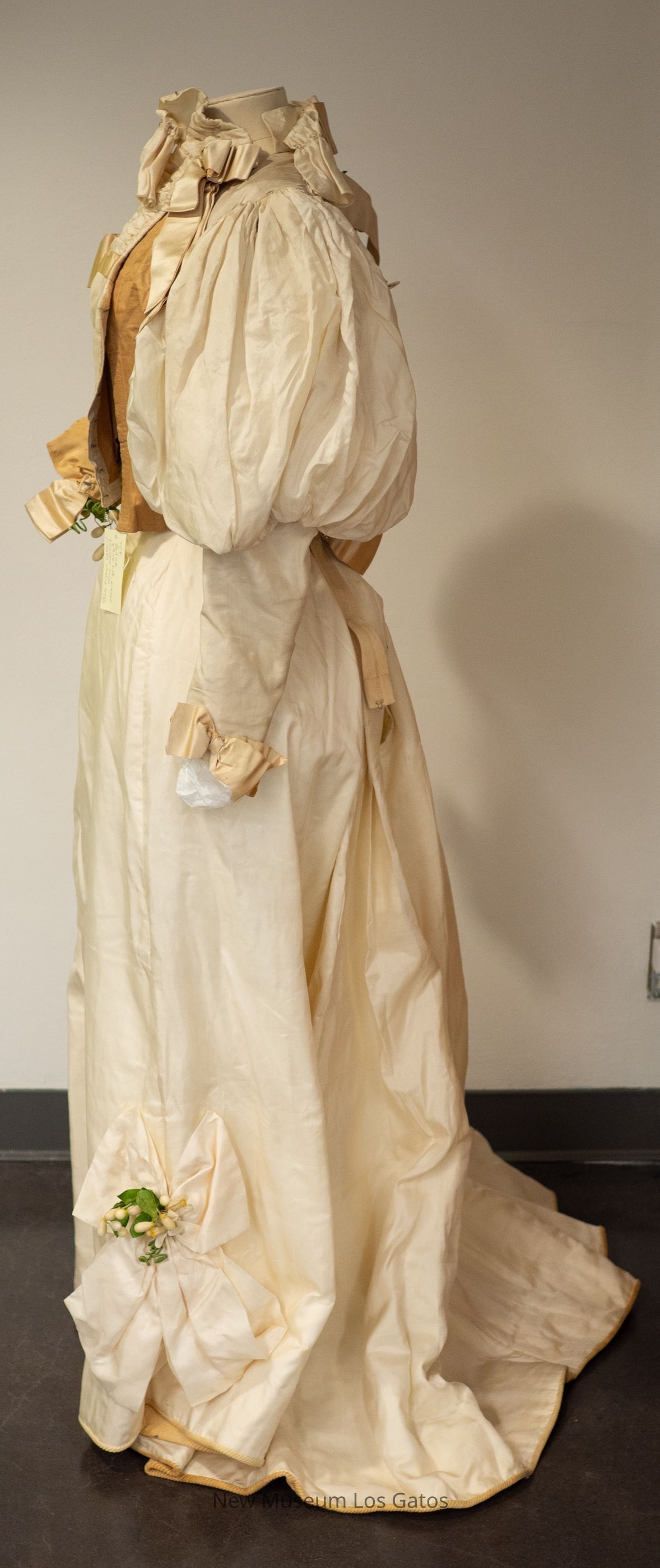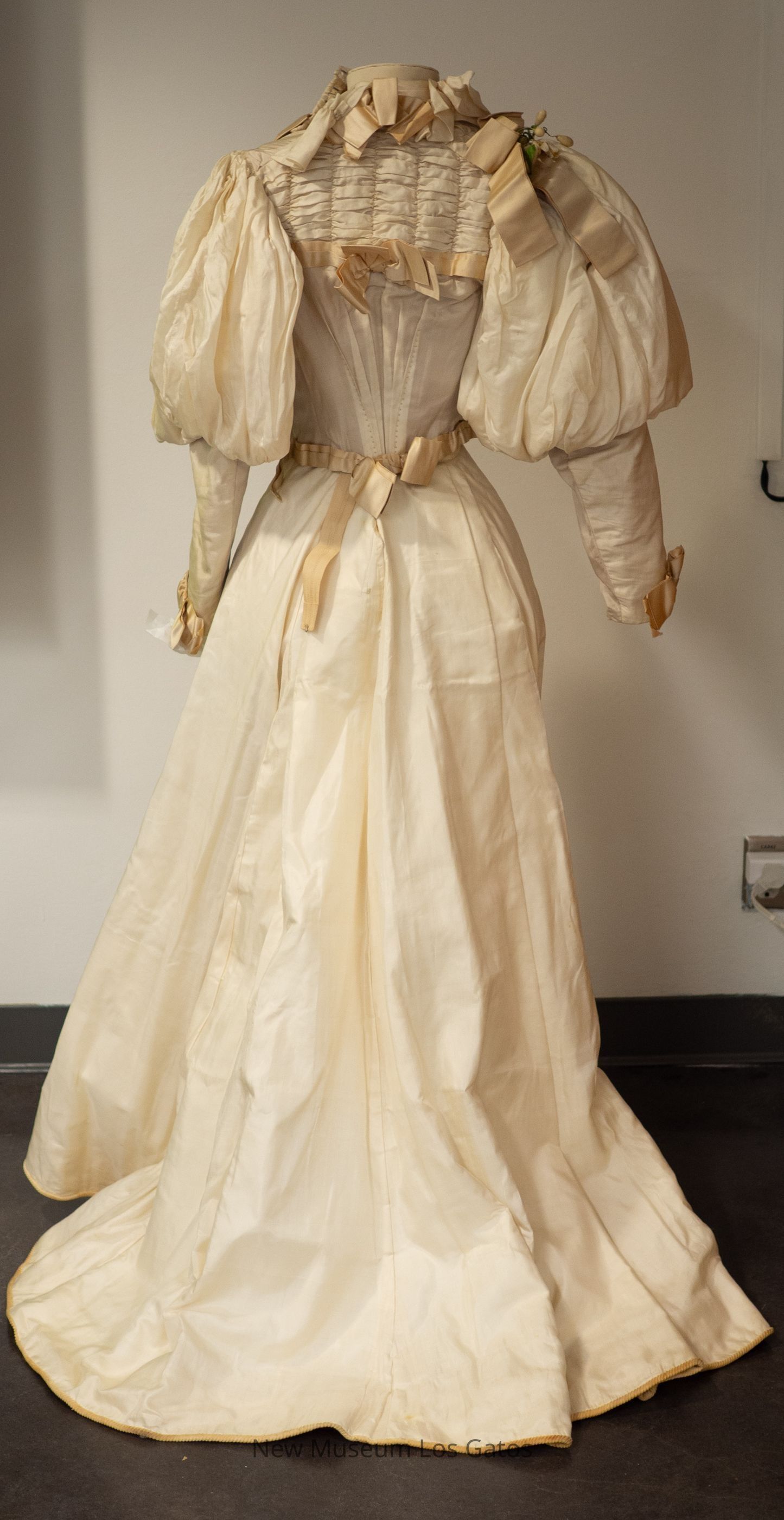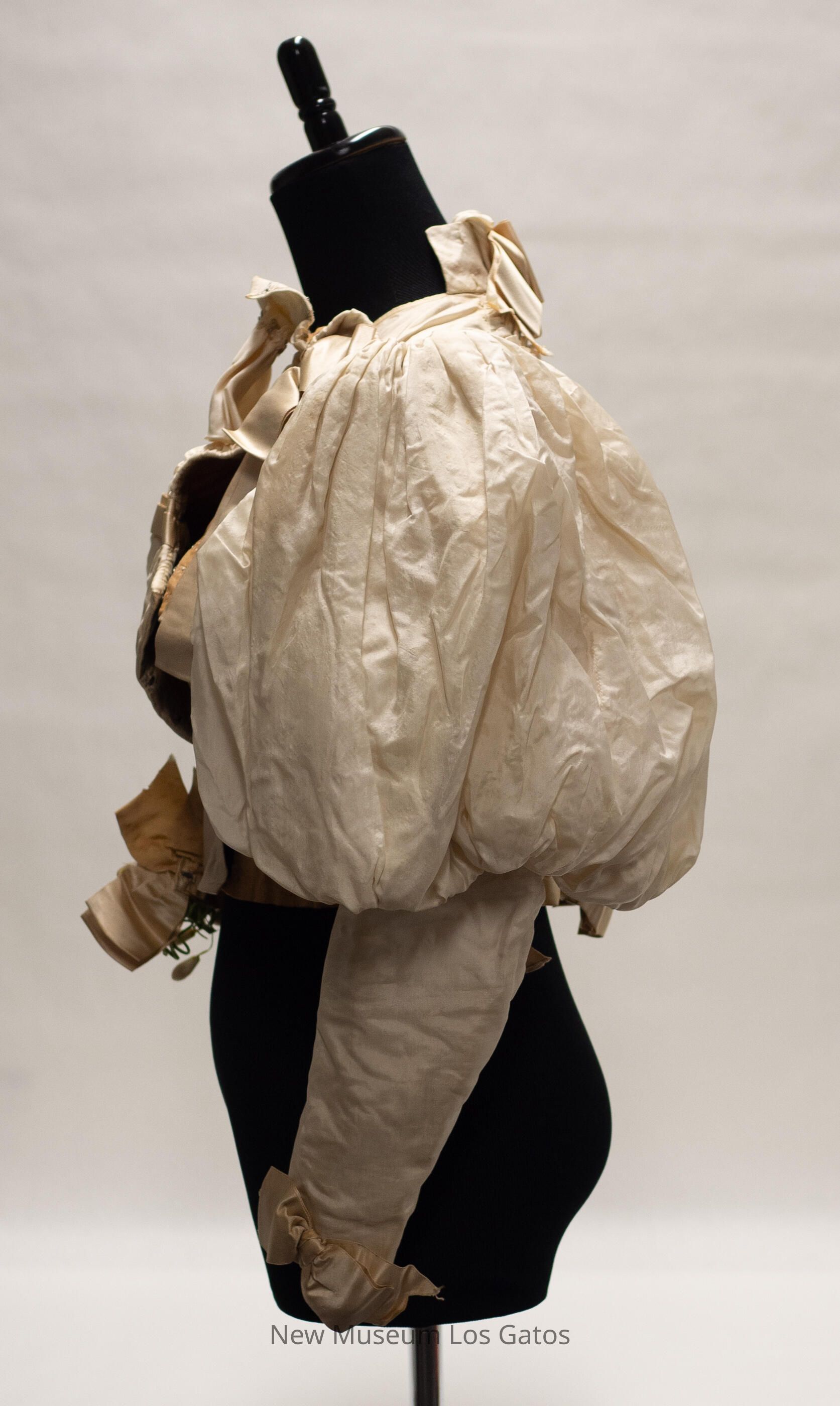A cream-colored silk bodice, with large puffy sleeves. There are cream-colored ribbon bows at the bottom of the sleeves, and ribbon around the waist of the bodice, with a bow near the front. There is also ribbon at the chest, with a bow in front, along the back, with a bow in the middle, and at both shoulders, with bows. There is decorative ruching along the yoke, as well as the upper back. There are two synthetic flower/leaf decorations, one at the waist and one on the right shoulder. The bodice opens at the front, down the left side, and closes with metal hook-and-eye clasps.Collection