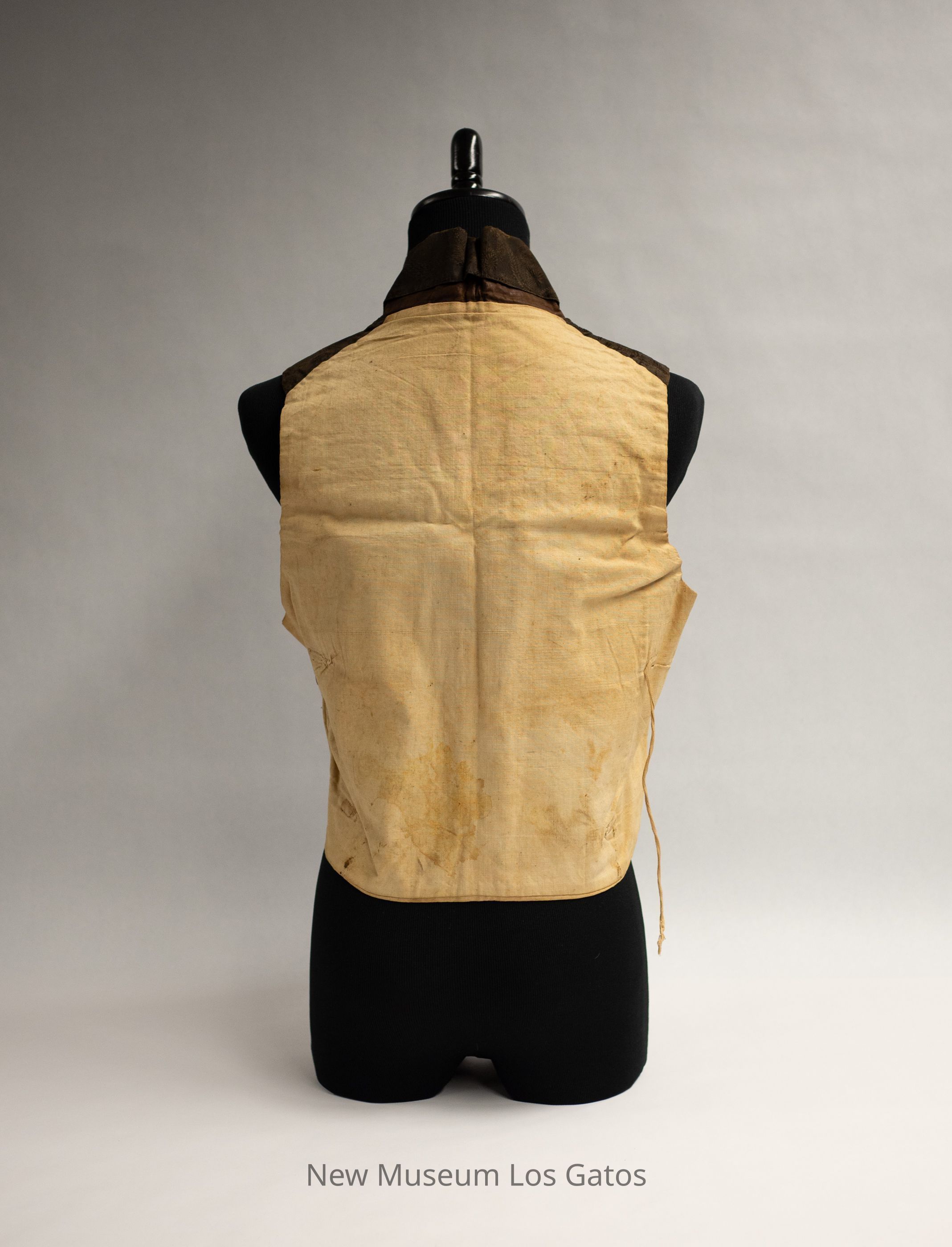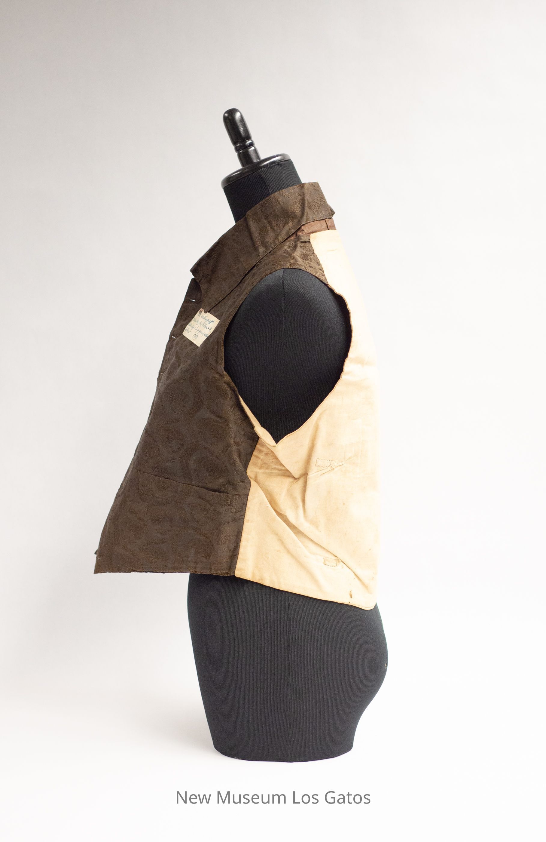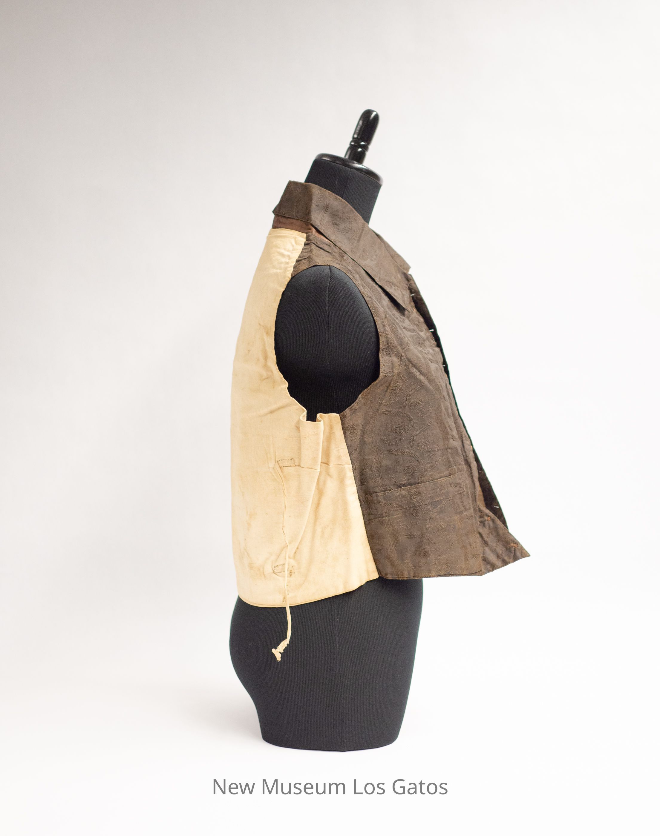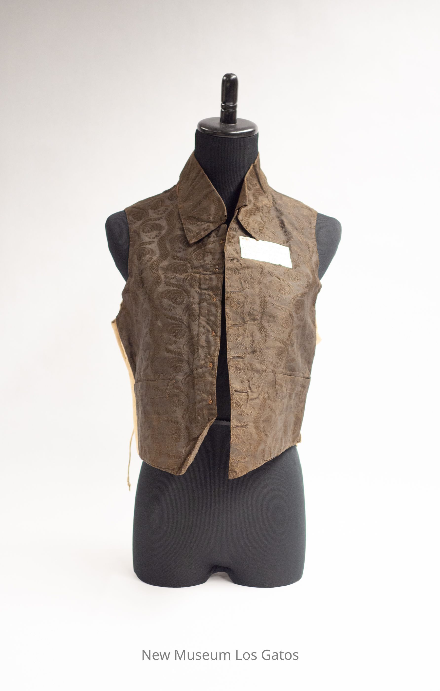 A brown silk vest, with linen backing. The front of the vest and collar is made out of brown silk, and has embroidered floral detailing in brown thread. The lining and backing of the vest is a plain, tan-colored linen with two short linen ties in the back. The vest opens in the front, and closes with eight buttons (buttons missing). There are two pockets on either side of the front, both towards the bottom of the vest.Collection