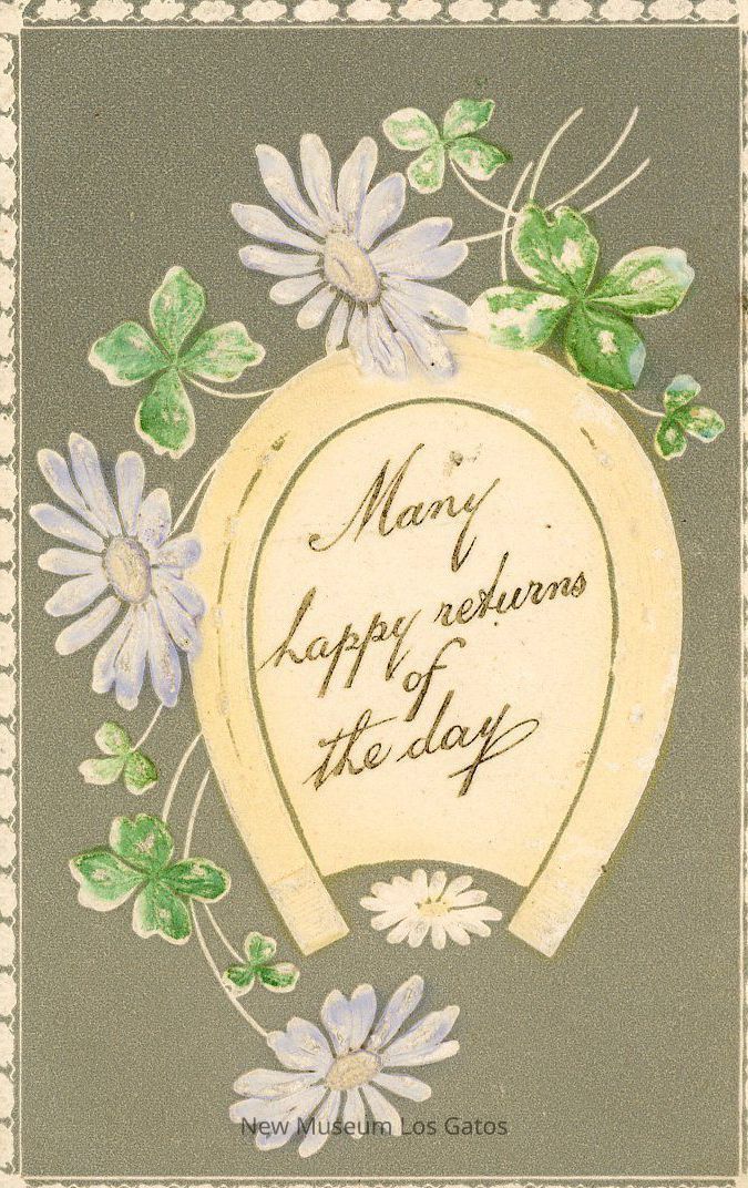 A postcard featuring illustrated blue flowers and green clovers. There is also a horseshoe in the middle, with a grey background.Collection