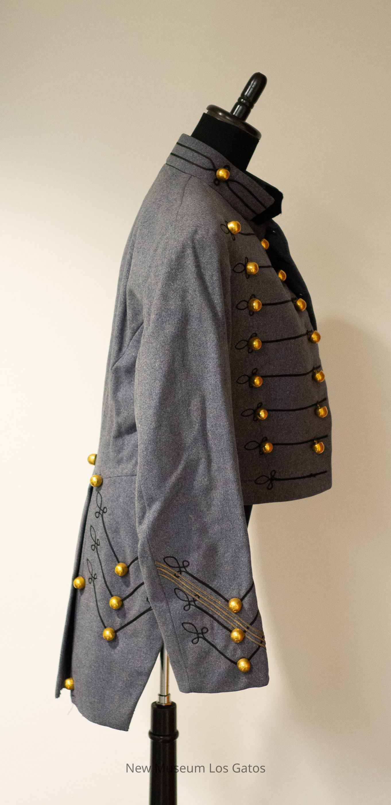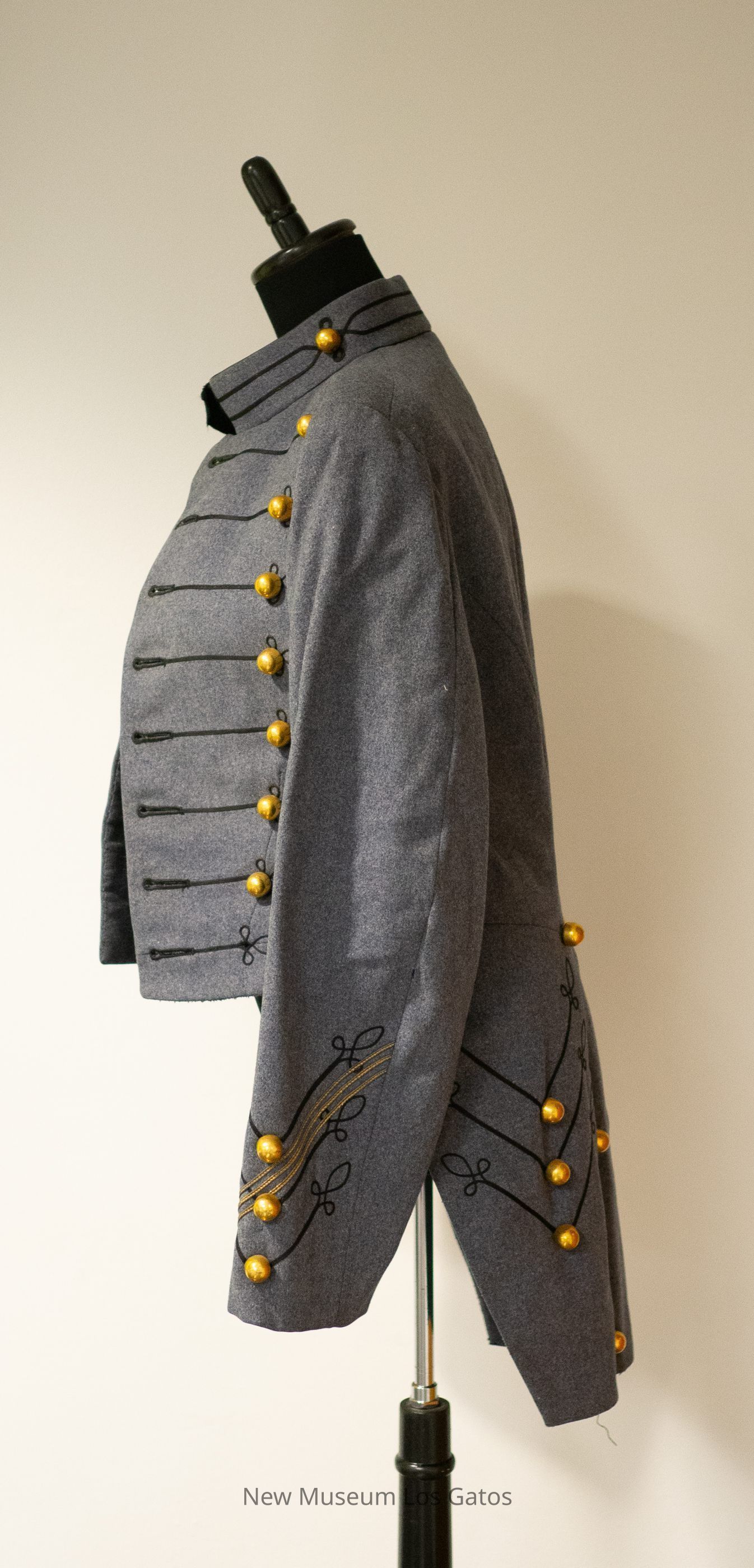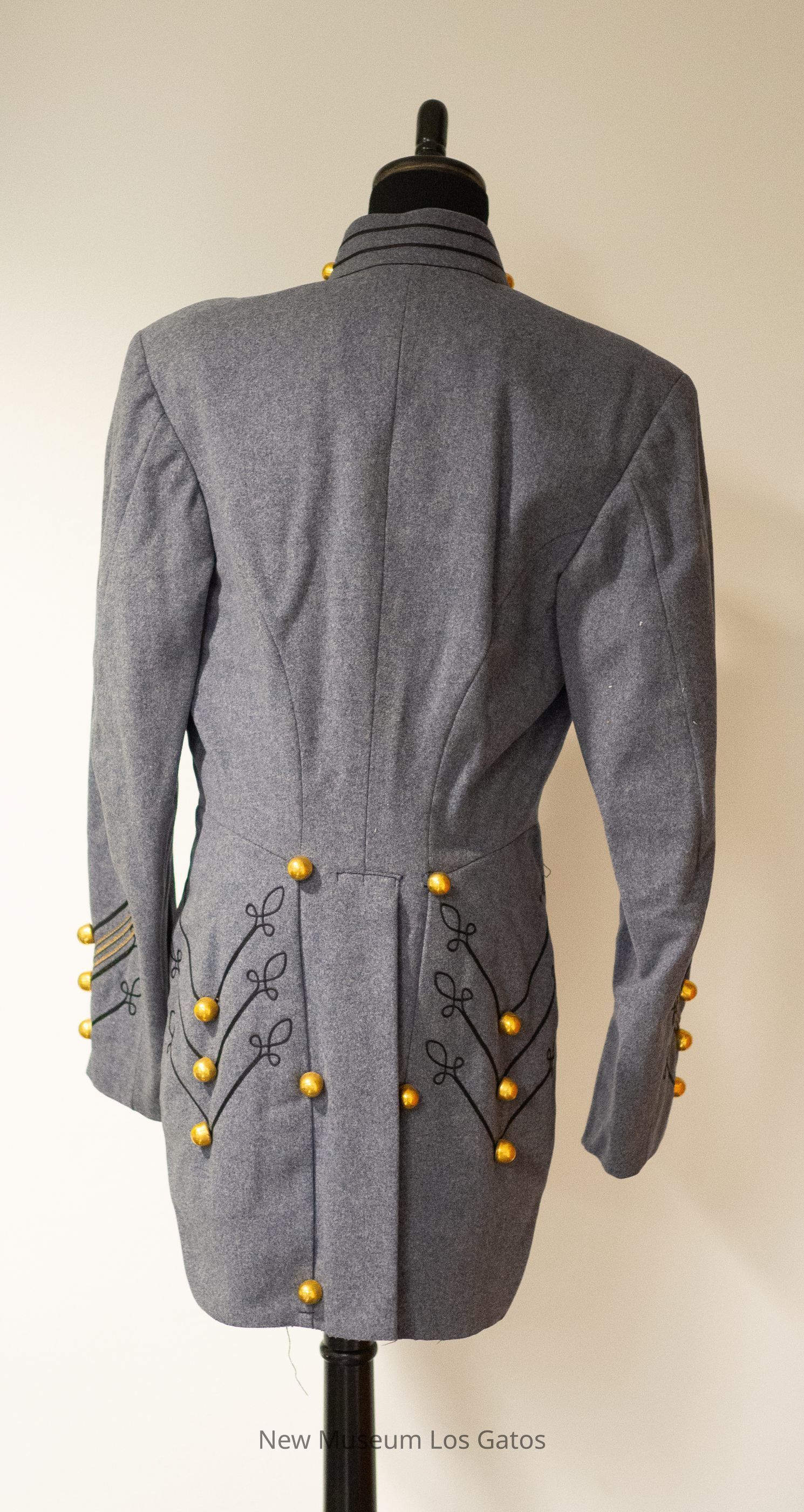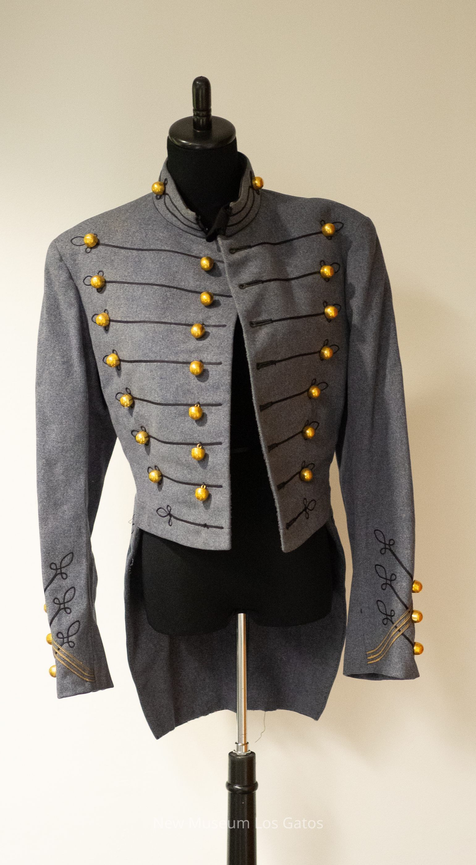 A blue wool jacket, part of the dress uniform for a West Point cadet. The jacket has three columns of large brass buttons on the front, with three more brass buttons on each sleeve, and two brass buttons on the collar. There is black decorative embroidery near all the buttons, and additional gold embroidery near the buttons on the sleeves. The jacket also has short tails on the back.Collection