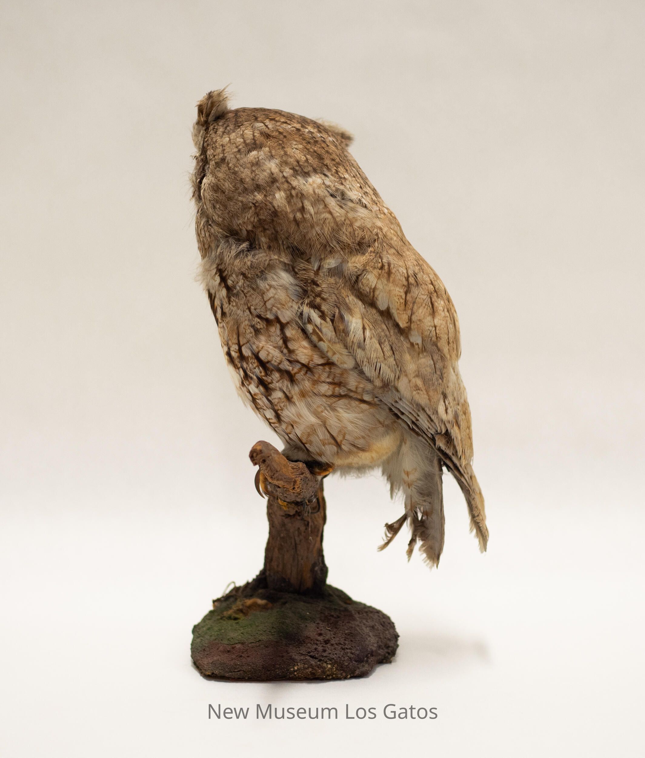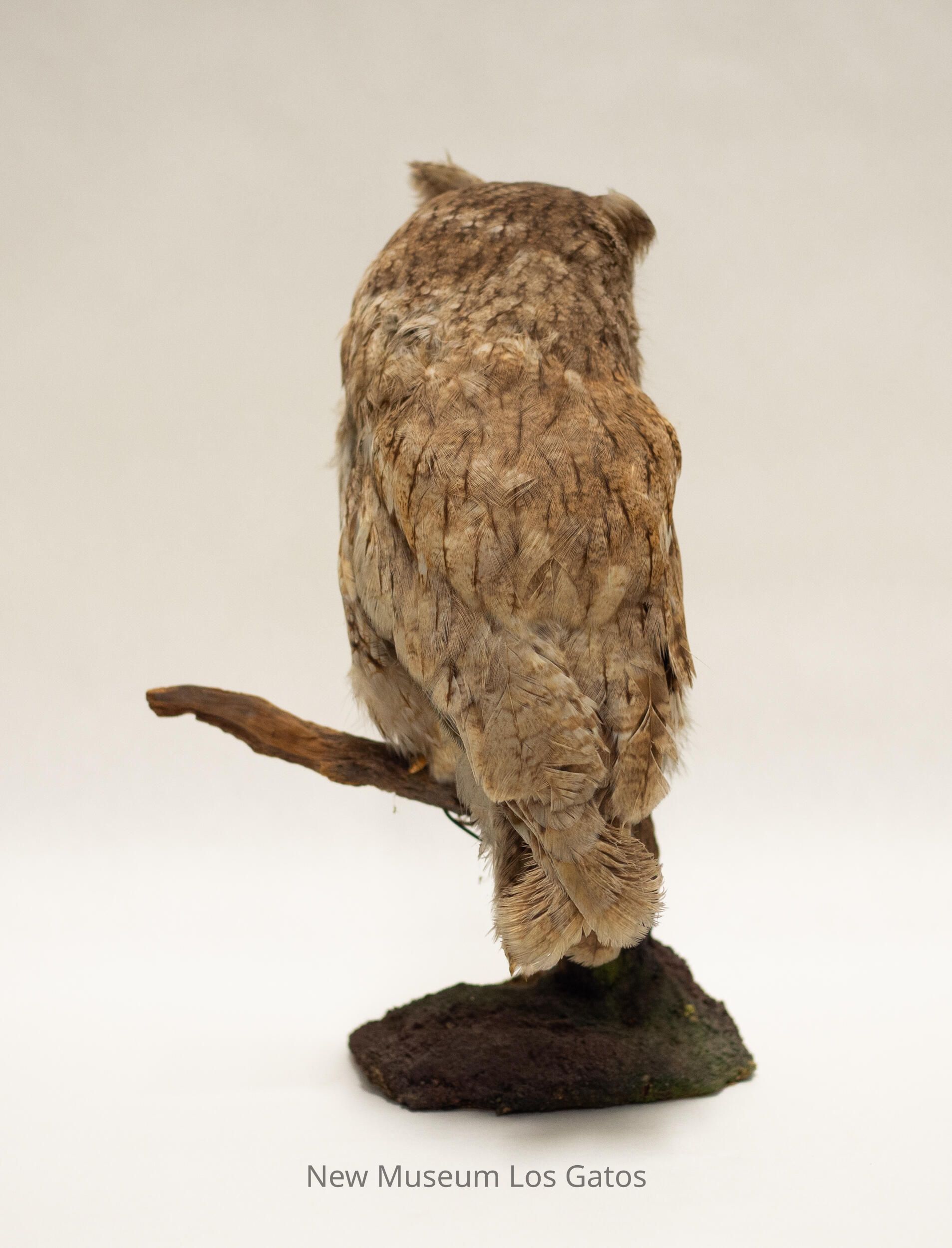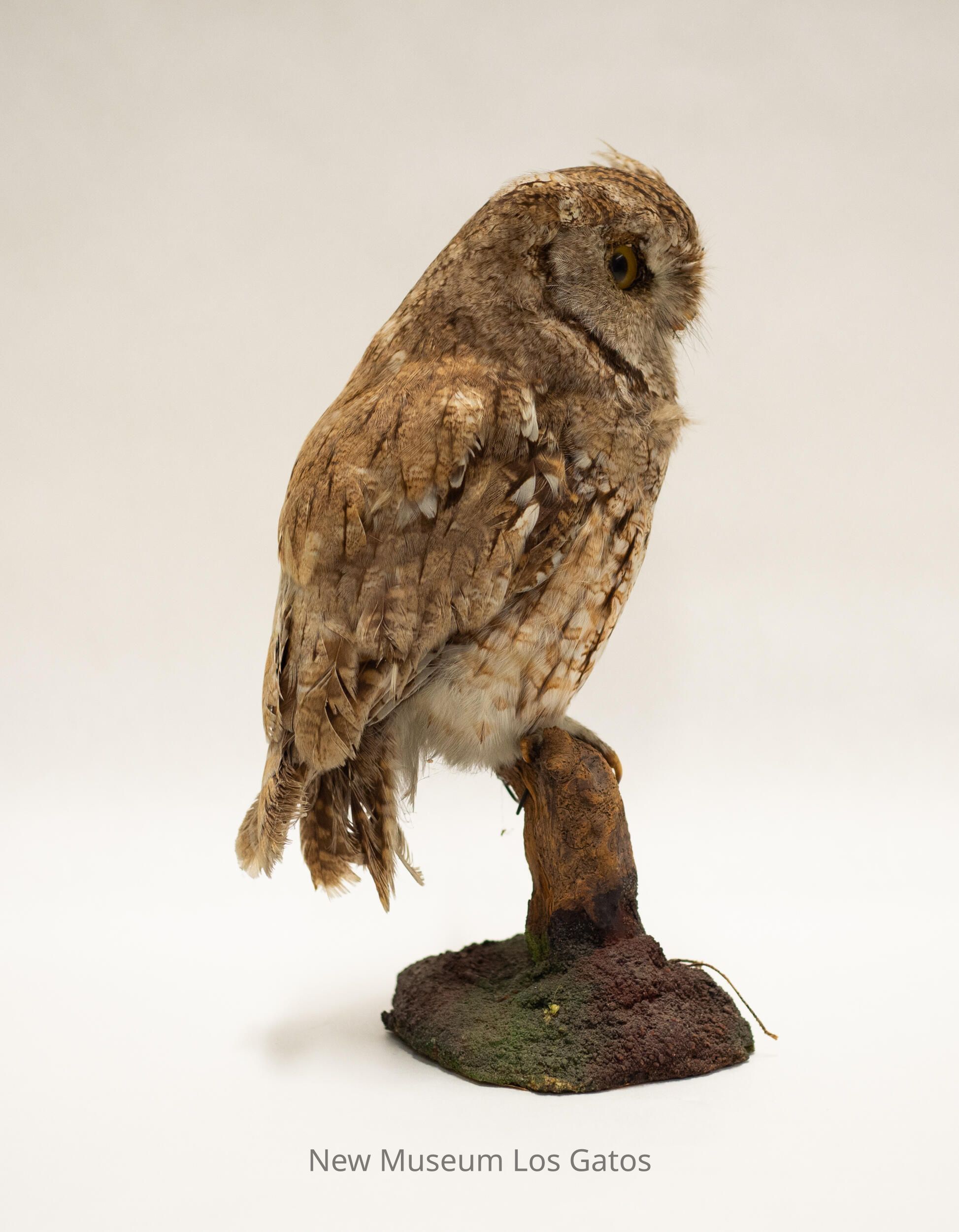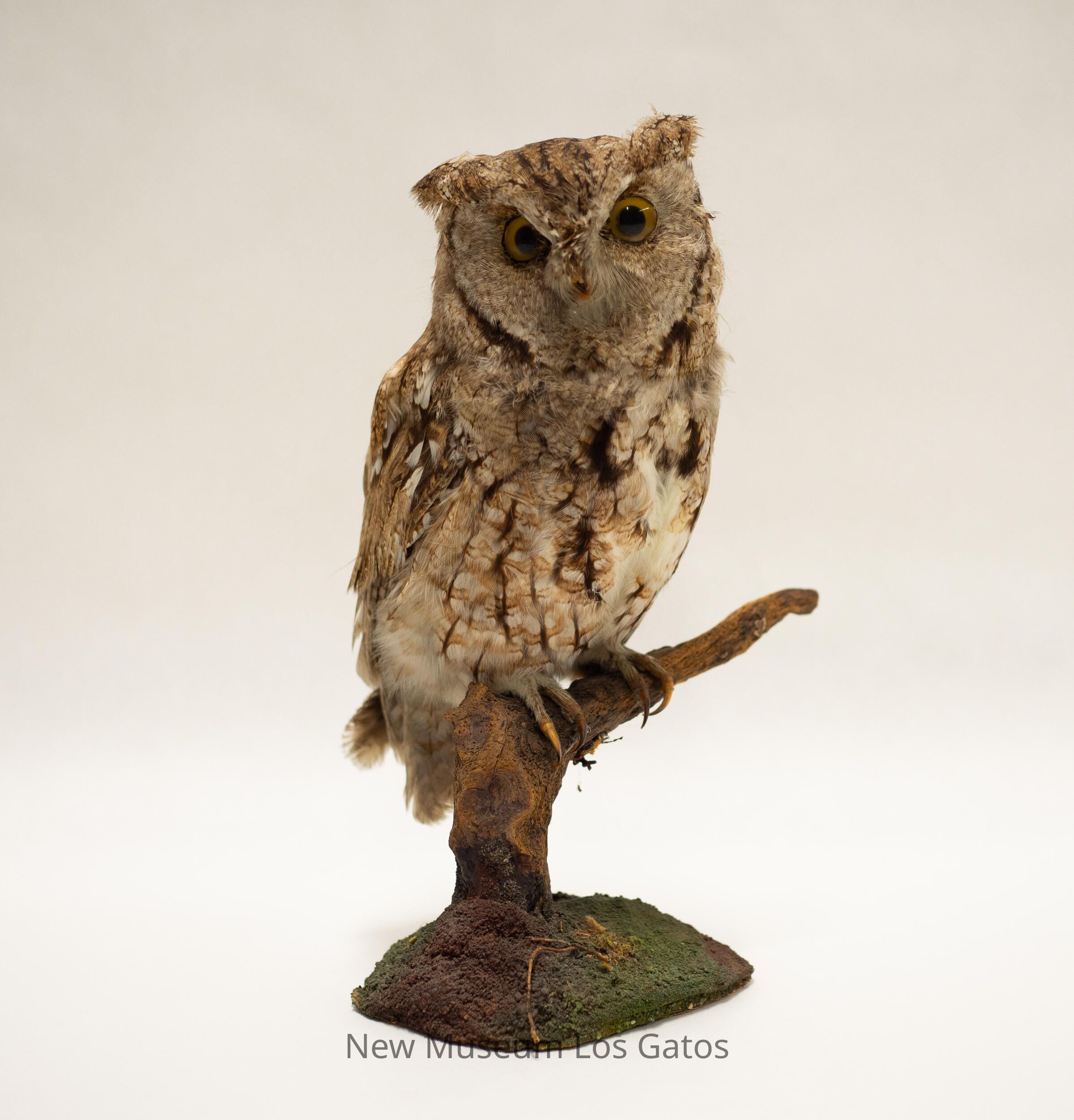 A taxidermied specimen of a Western Screech Owl, or Megascops kennicottii. The owl is perched on a tree branch, that is mounted into a base made to look like grass. The owl's wings are closed, and its head is turned so that it is looking off to its right. Family: Strigidae Genus: Megascops Species: M. kennicottii