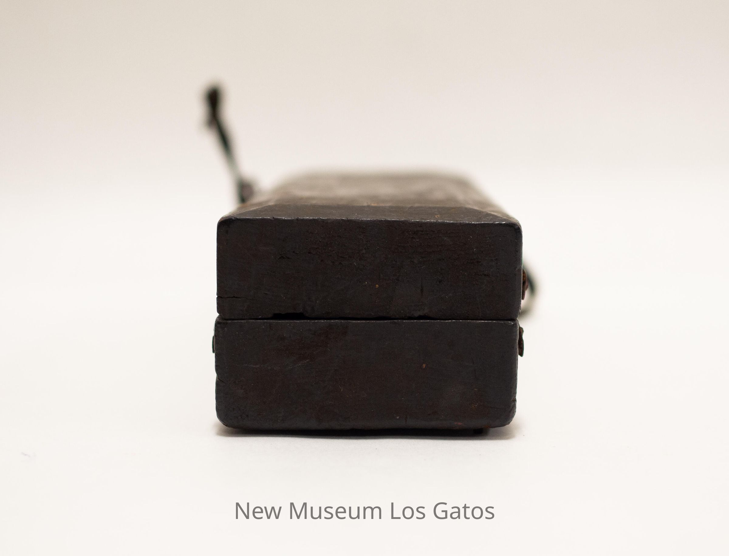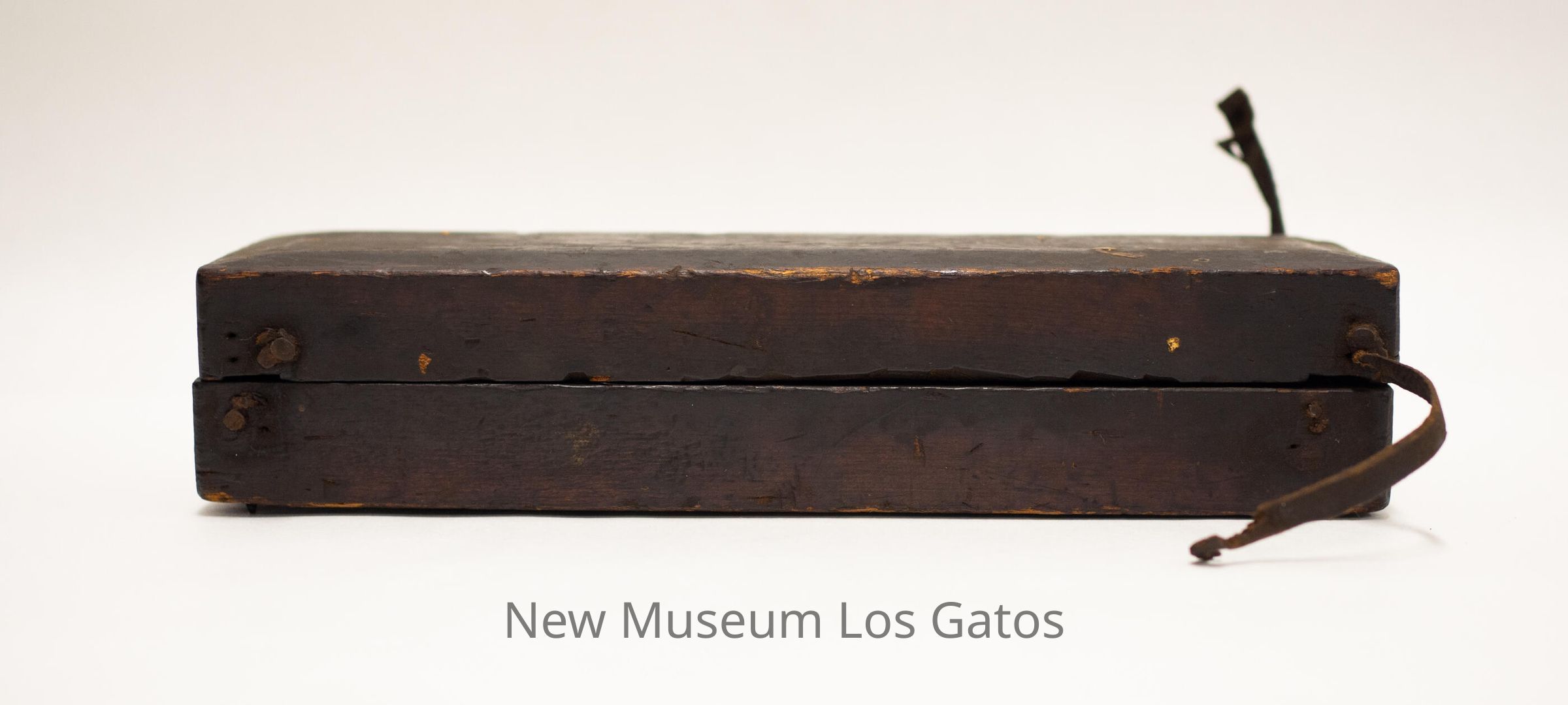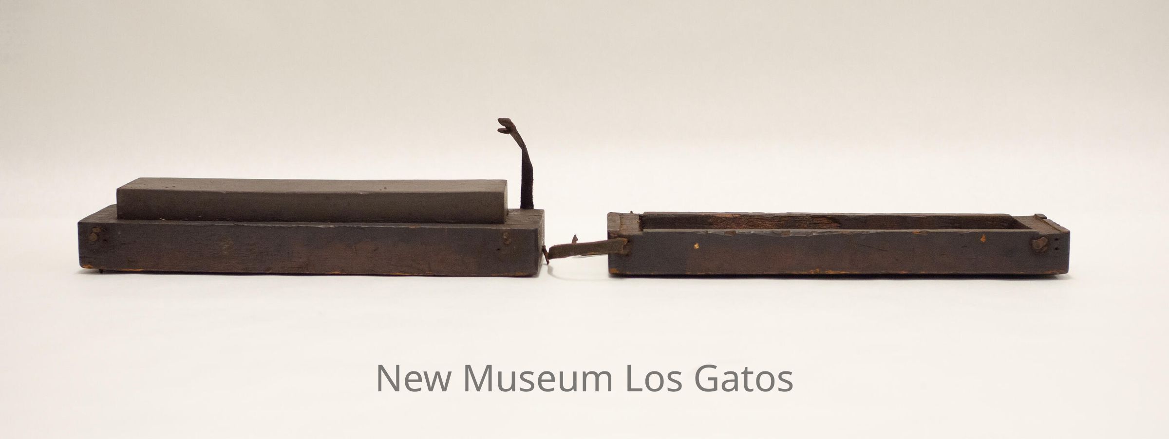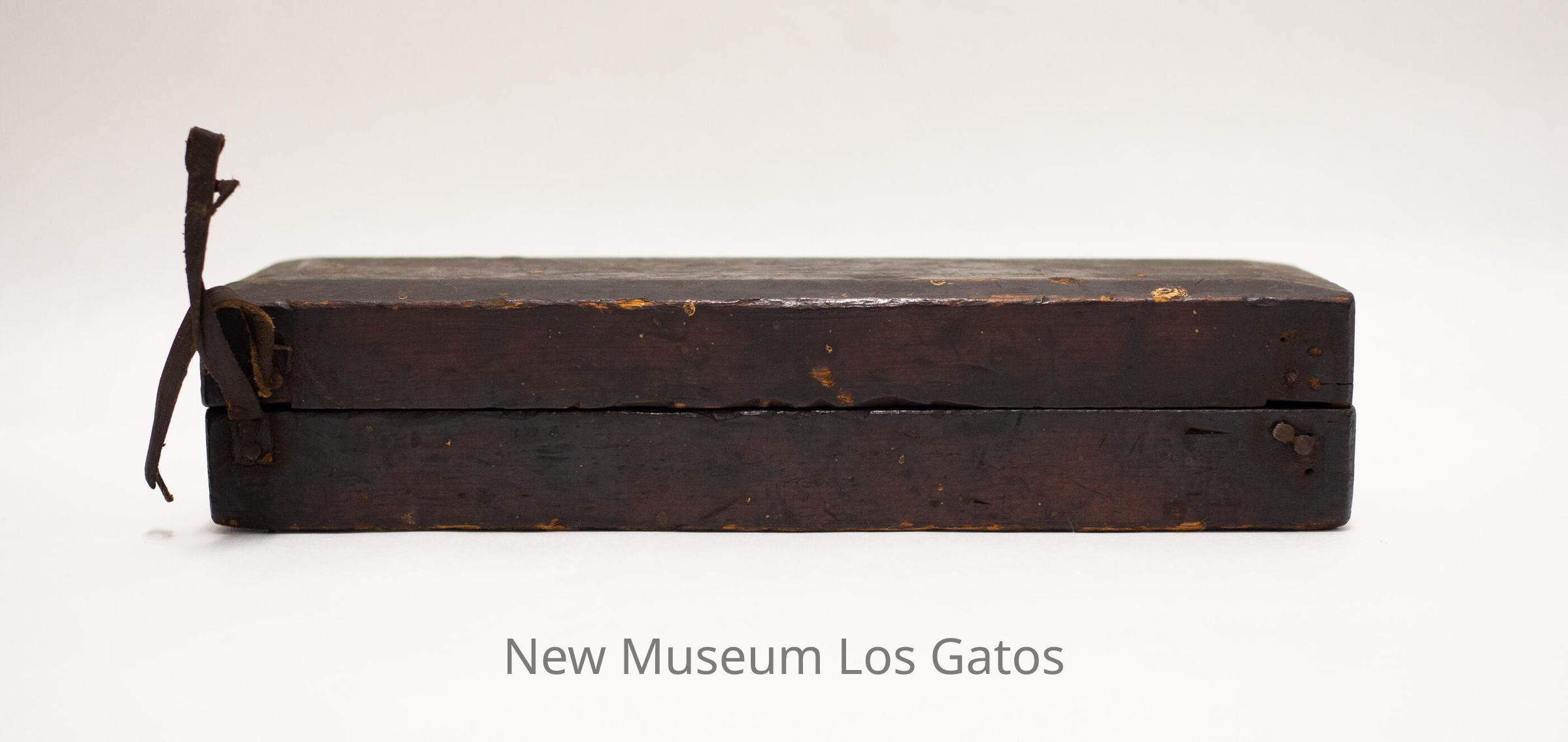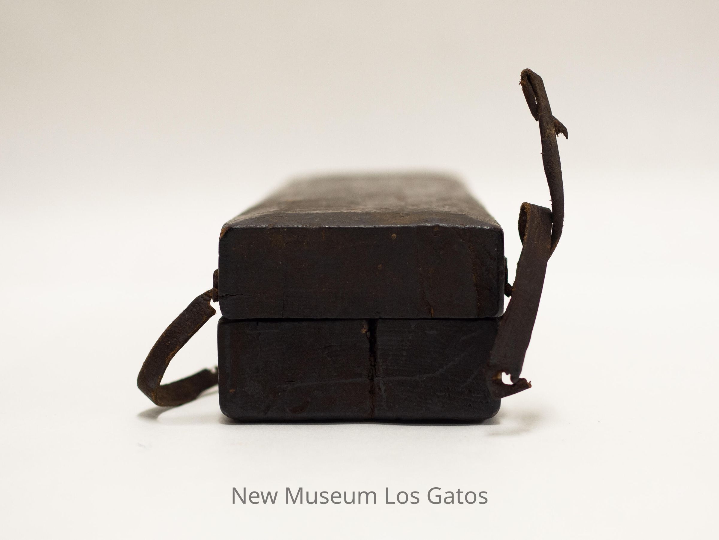 A rectangular whetstone inside of a wooden box. The whetstone is attached to the base of the box, with a removable wooden lid. There is one leather strap attached to the base, with two leather straps attached to the lid.Collection