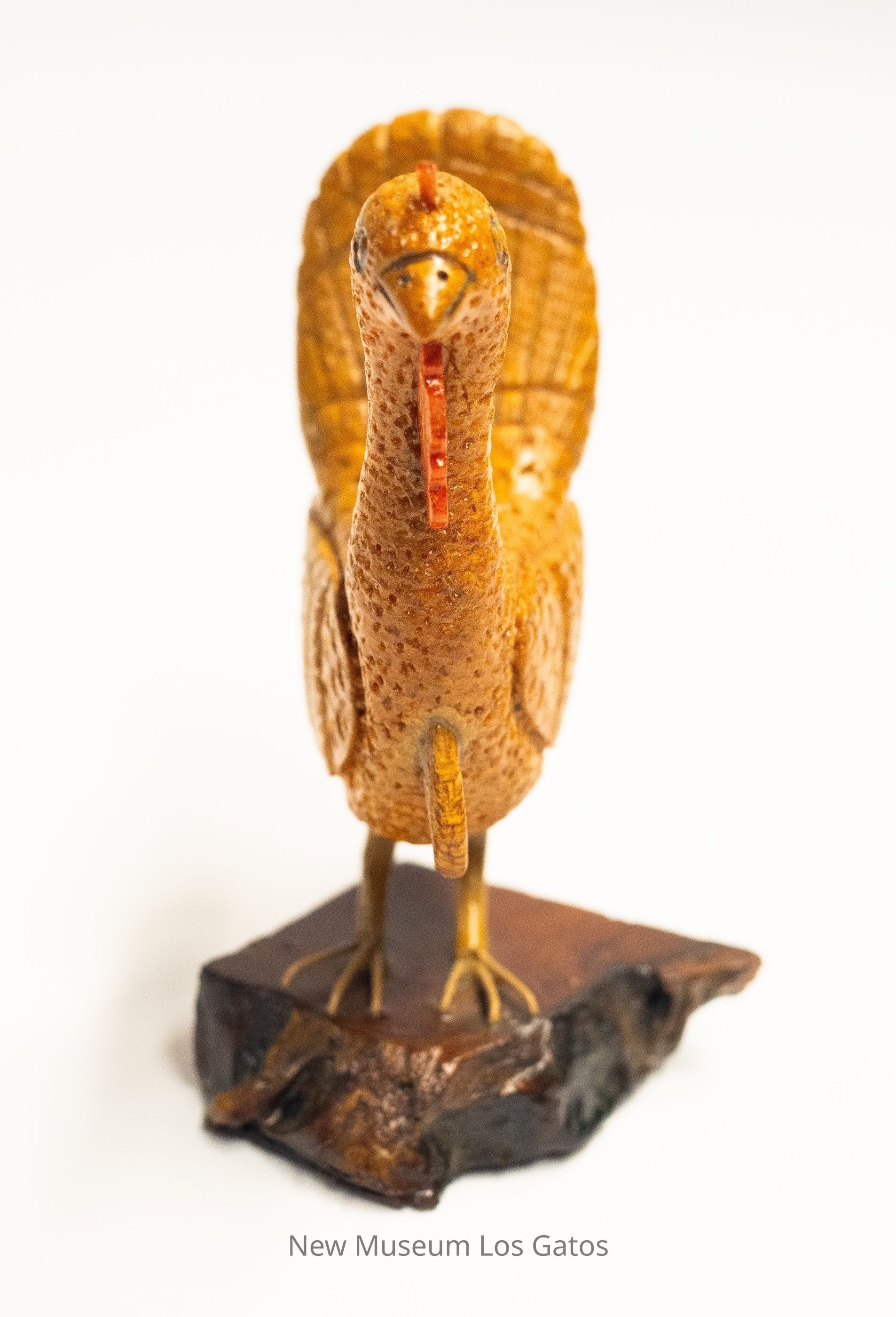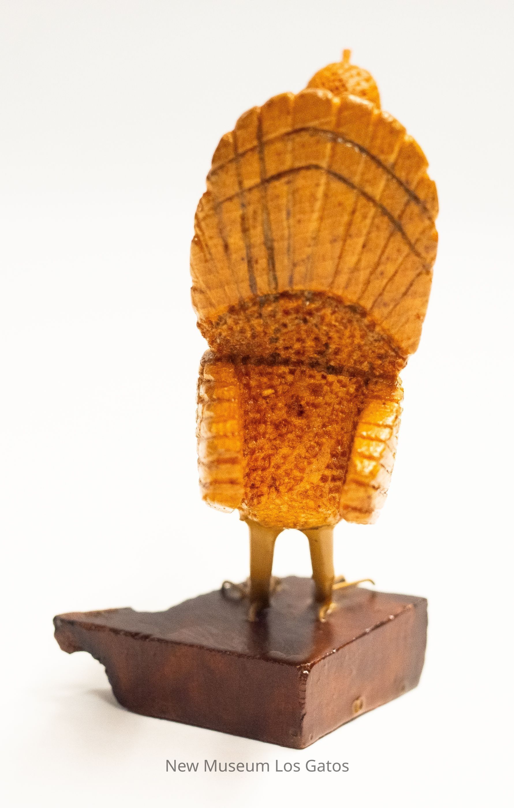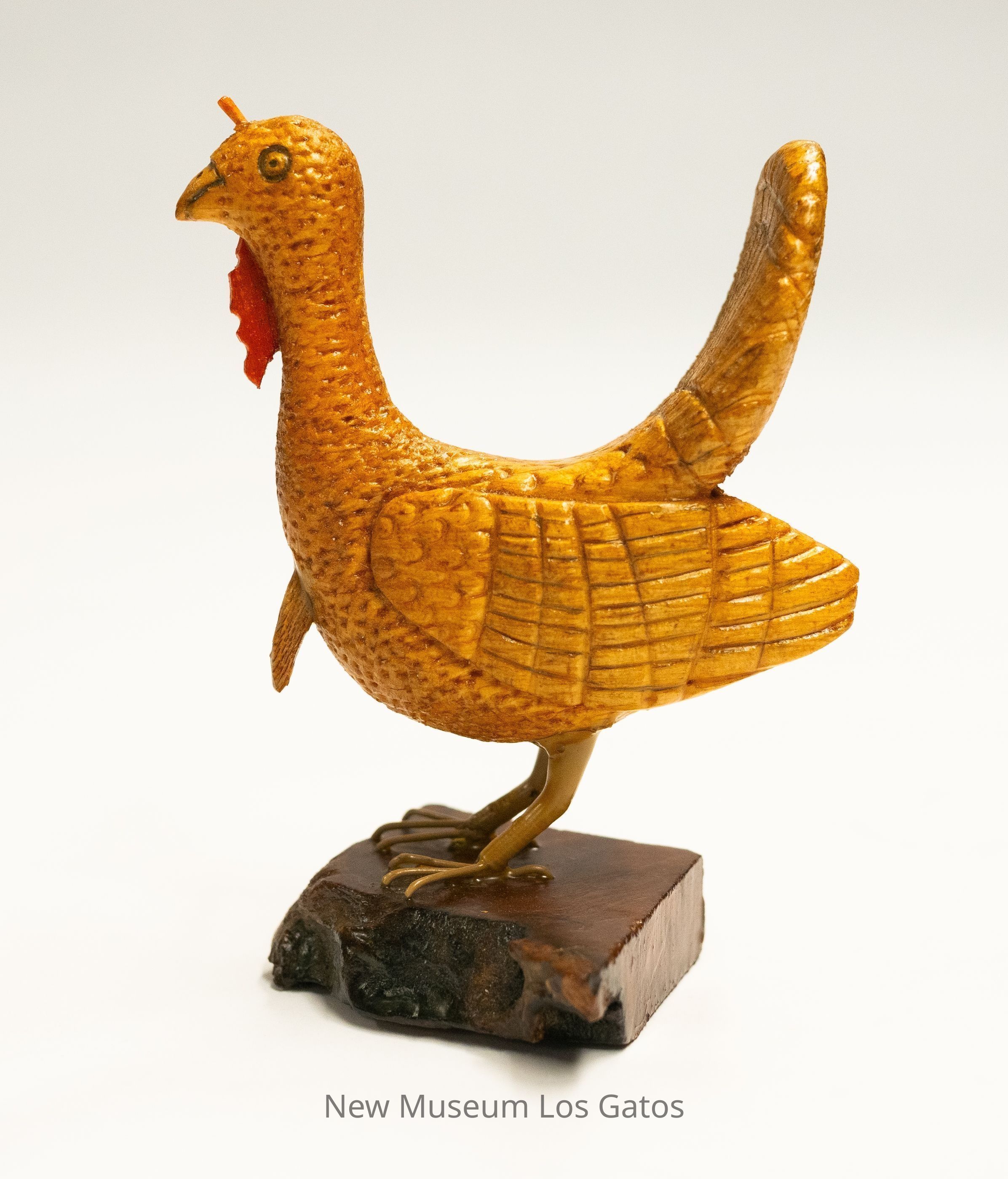A light yellow hand-carved wooden sculpture of a White House turkey, with yellow legs, on a dark brown base. The turkey has a red snood and wattle, with a light yellow beard. The tail feathers are angled upward, and the beak is closed.Type of Sculpture