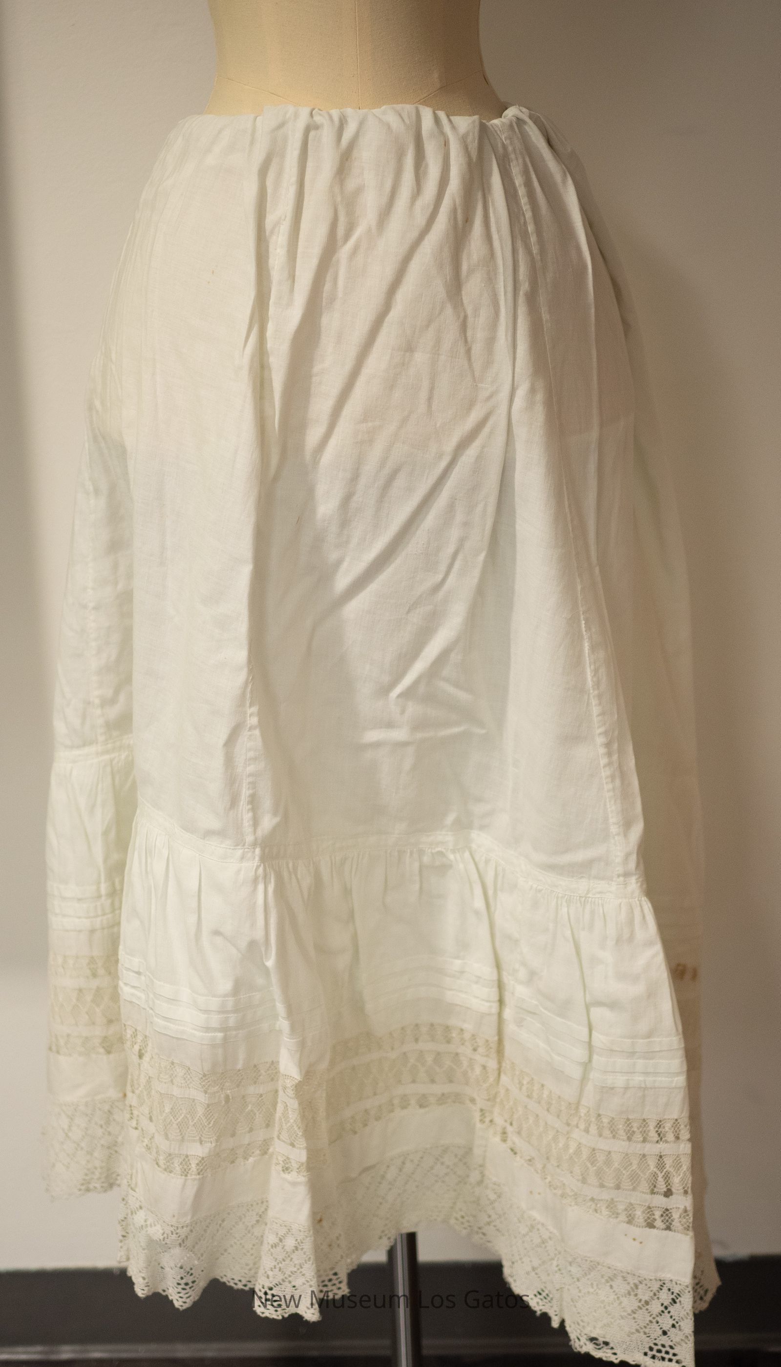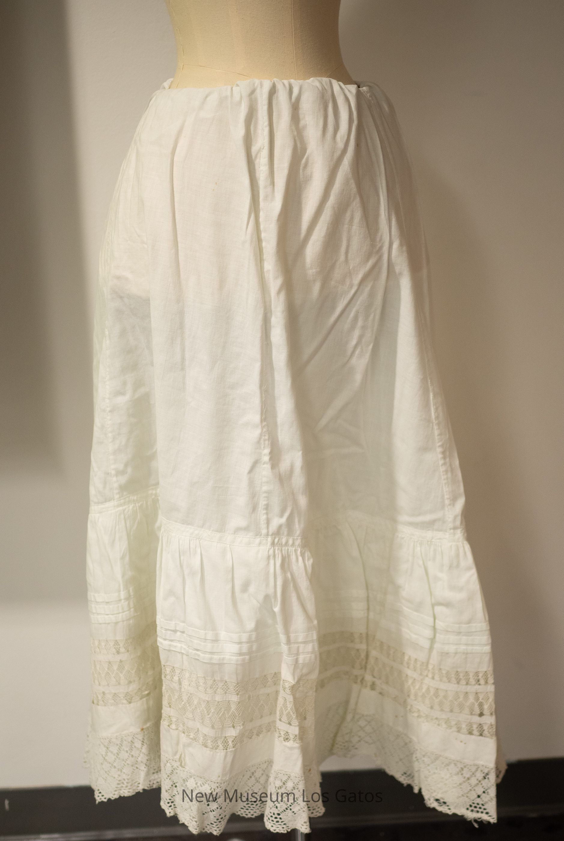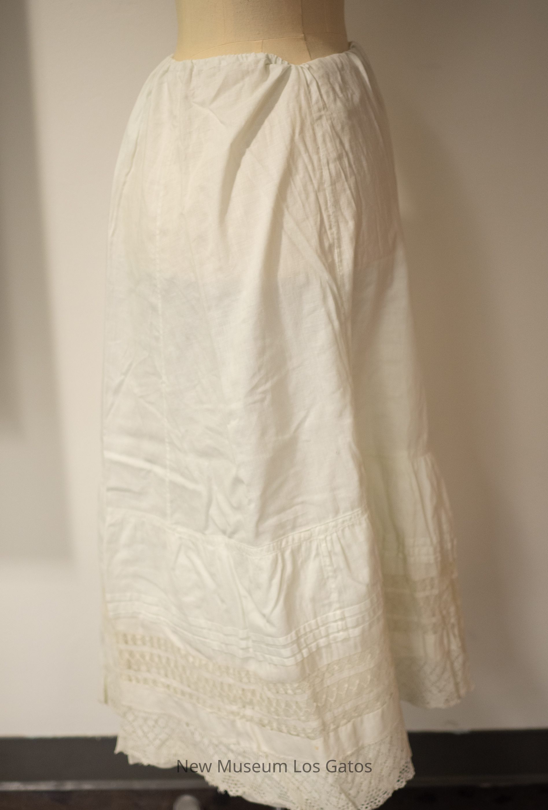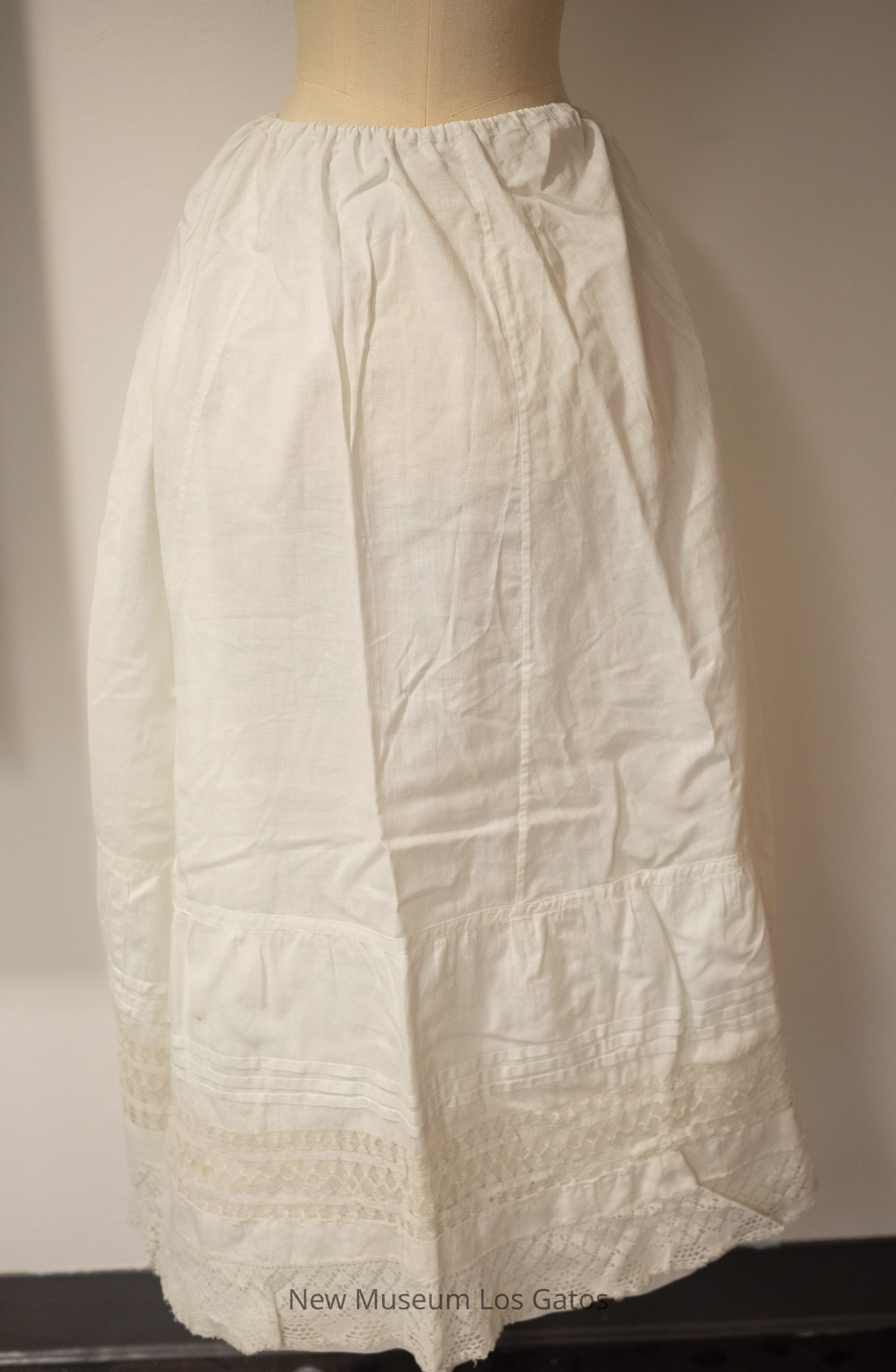 A large, white female petticoat with a drawstring waist, three rows of grow tucks, and a decorative machine-made lace hem.Collection