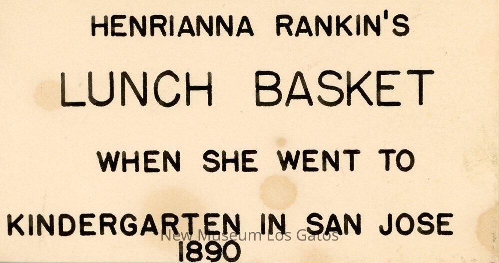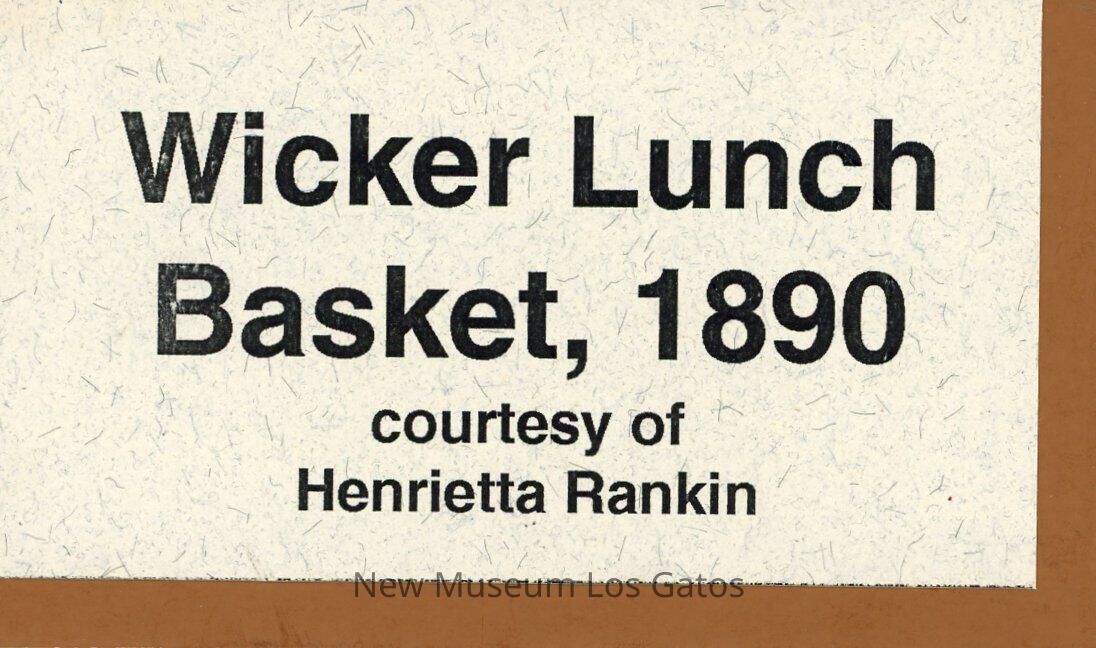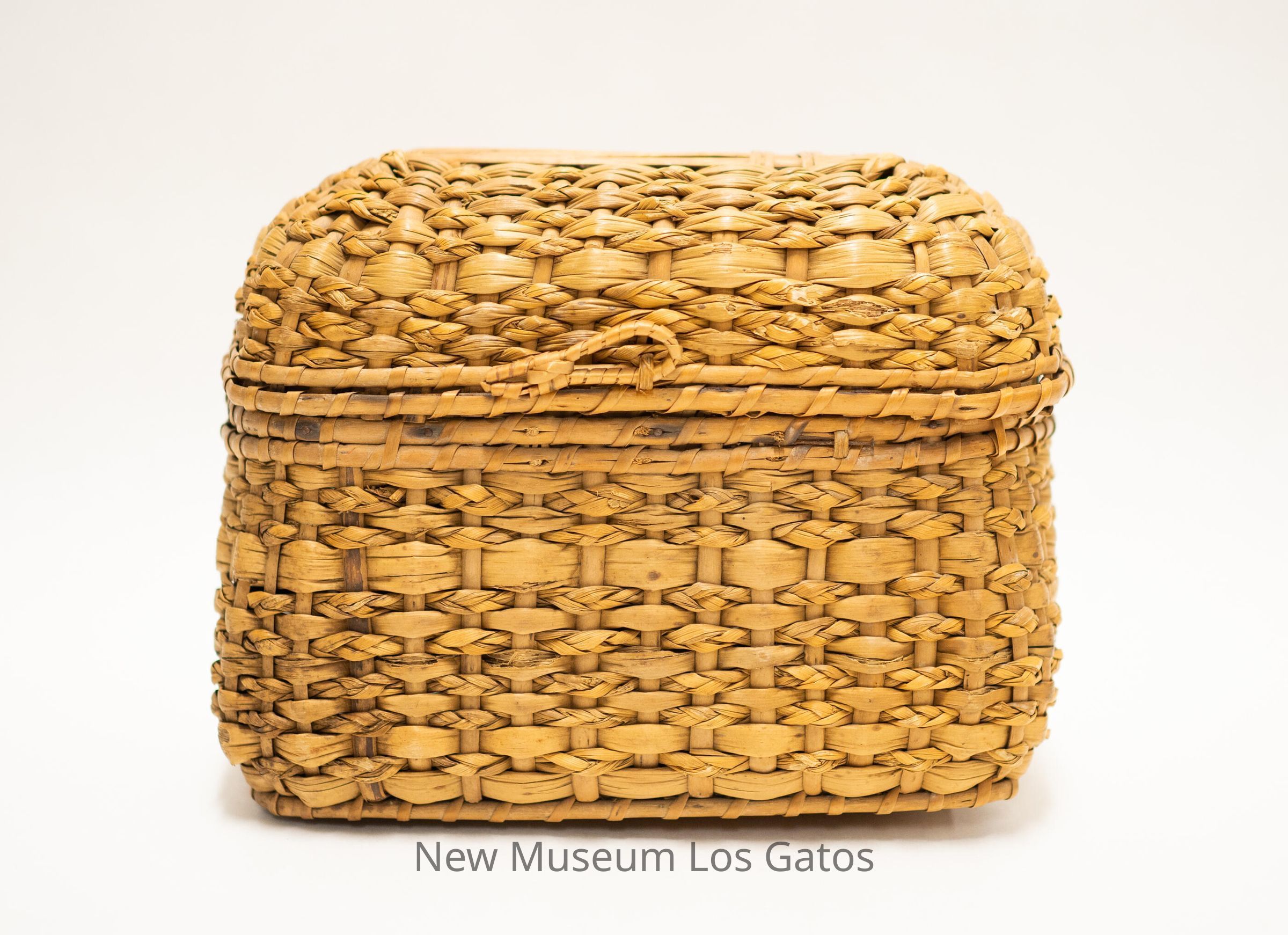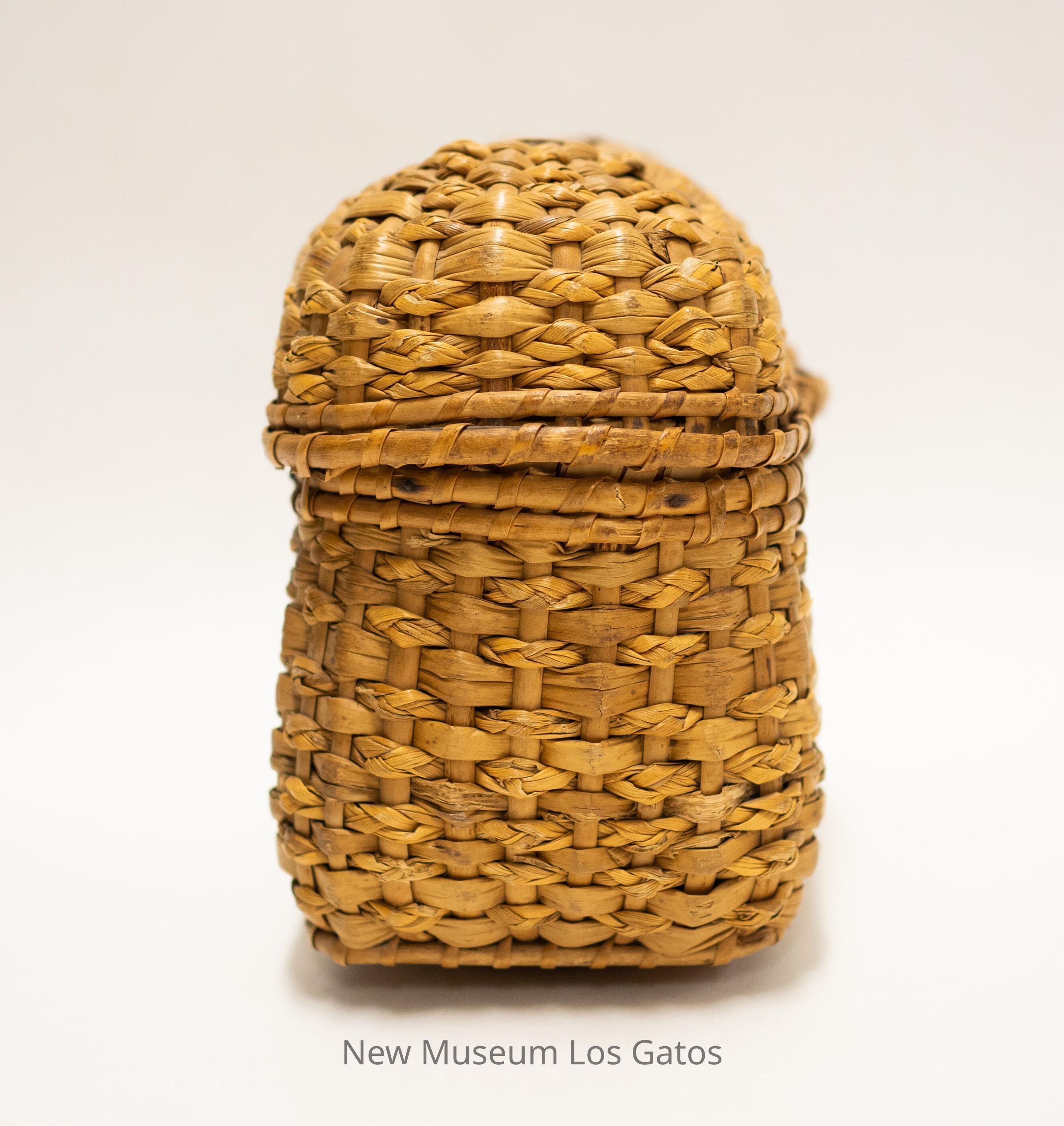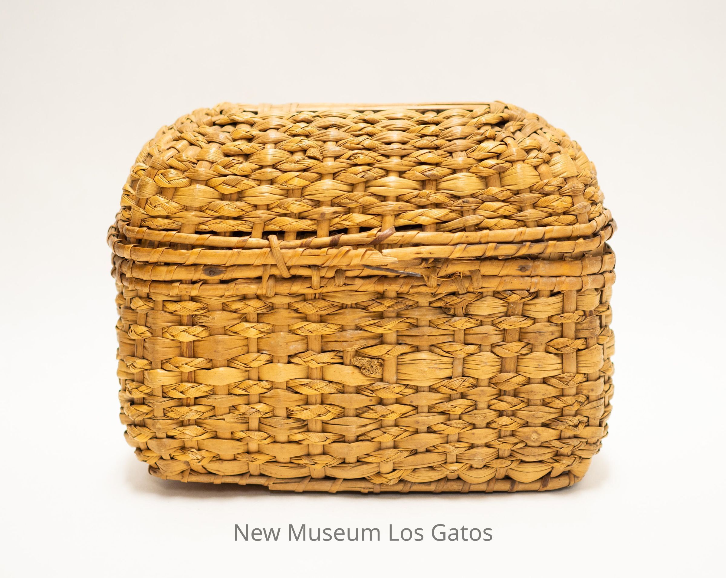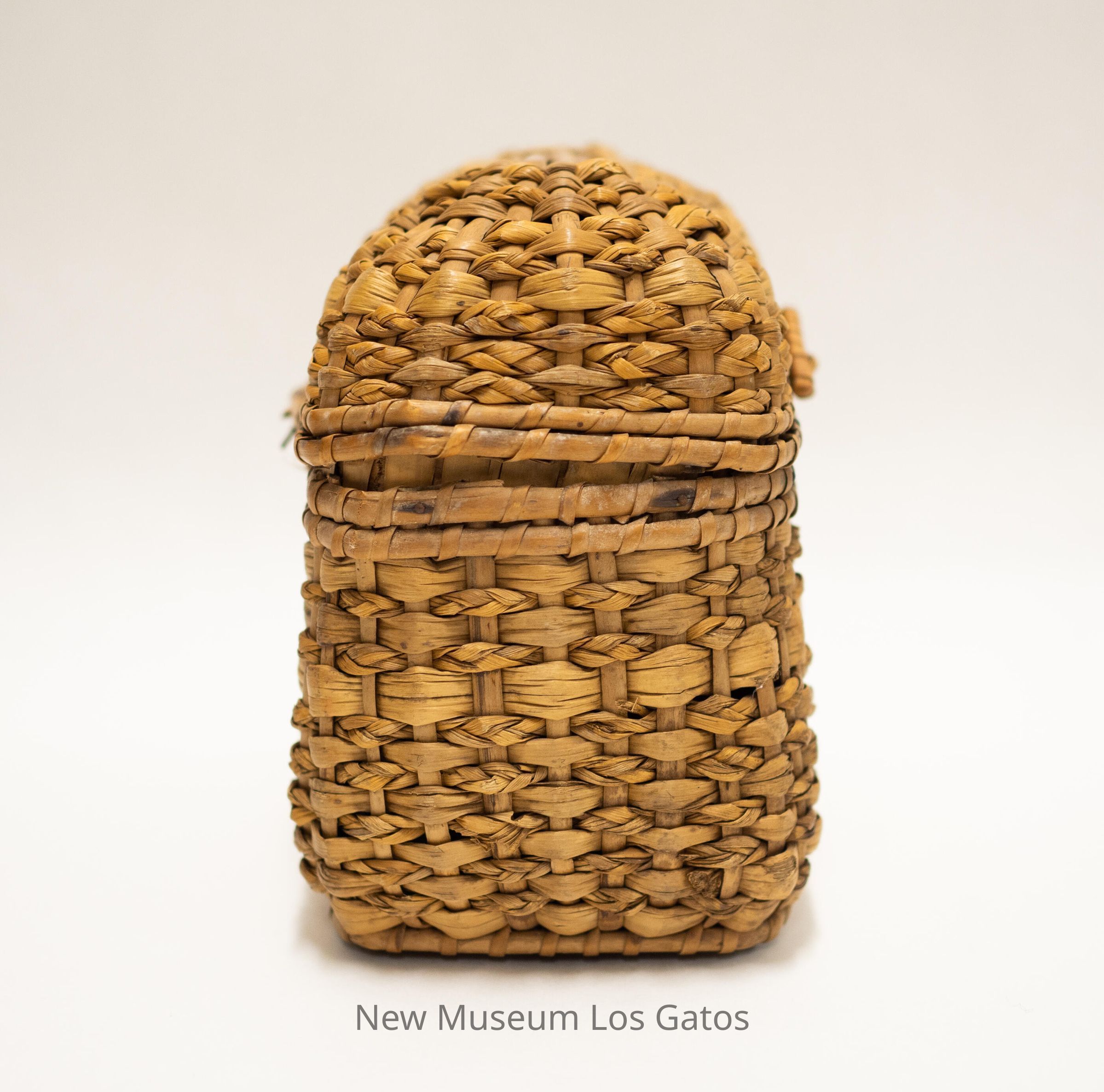 A small, rectangular, light brown woven wicker basket. The lid is attached to the basket along one of the long sides, and flips up to open. There is a small woven loop on the unattached side of the lid, most likely to close the basket. Inside the basket is a red piece of cloth, that might have been used as a napkin.Collection