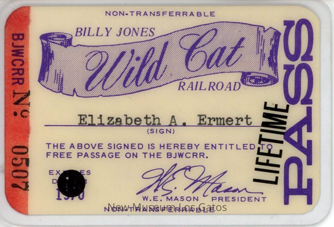 A single, laminated lifetime pass for the Wildcat Railroad, belonging to Elizabeth A. Ermert. The front of the card features the details and terms of the pass, while the back features the illustrated logo of the Wildcat Railroad.Collection