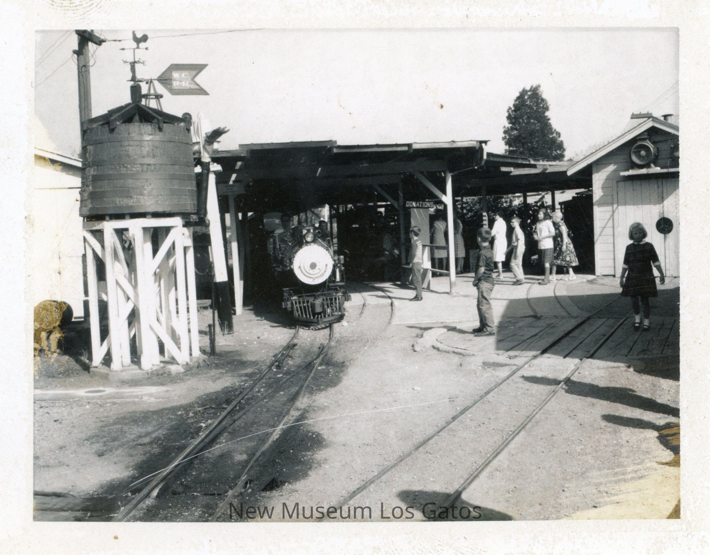 A black and white photograph featuring the Wildcat Railroad station. The engine is near the center of the image, underneath a roof, with a building off to the right side and a water tank off to the left side. There are numerous people standing off to the right side of the steam engine. The image is surrounded by a white border.Collection