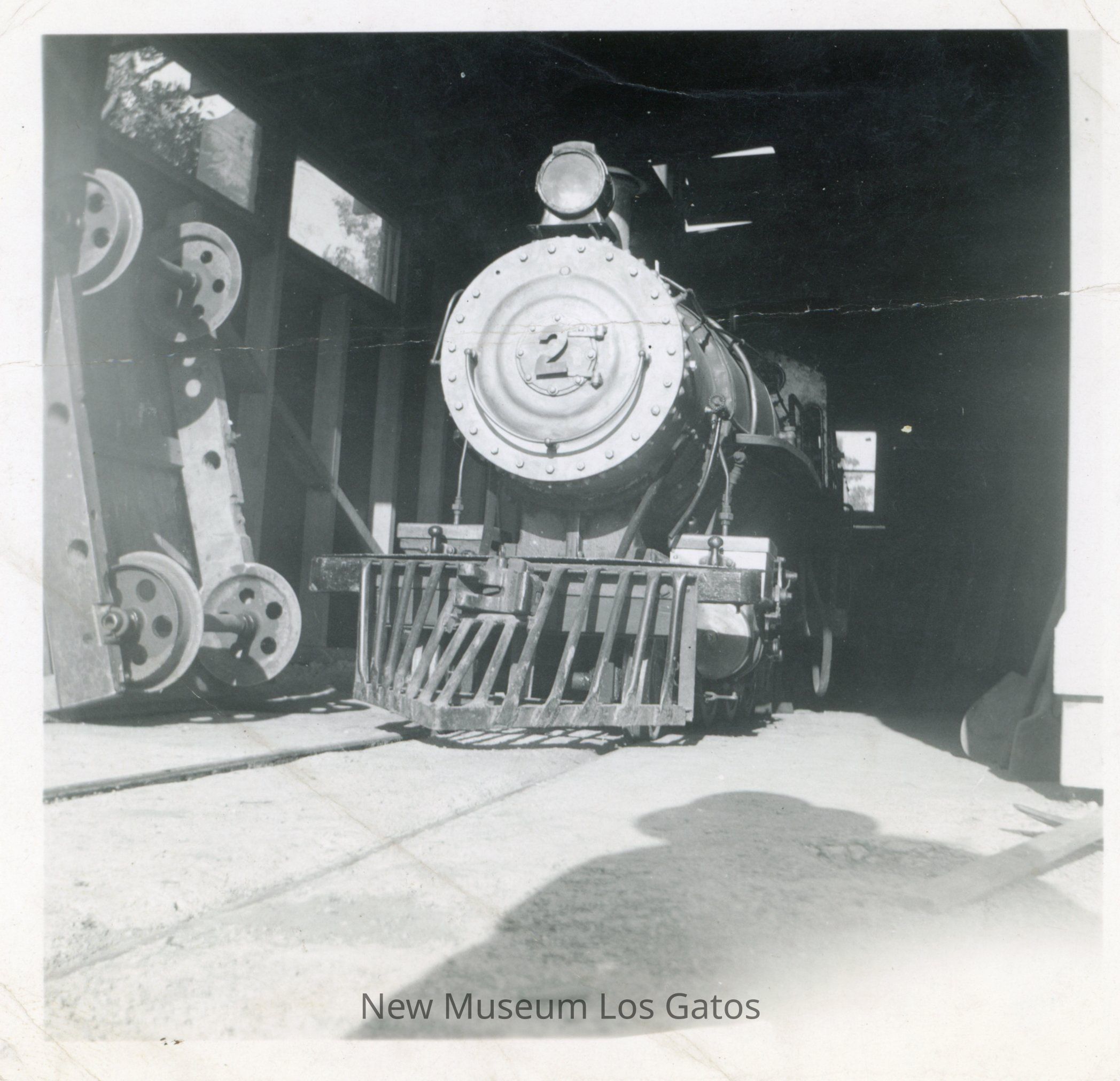 A black and white photograph featuring the Wildcat Railroad steam engine. The engine is inside a structure, which is mostly in shadow. The angle of the photo is low, almost from the ground, and the shadow of the person taking the photo is in the foreground.. The image is surrounded by a white border.Collection