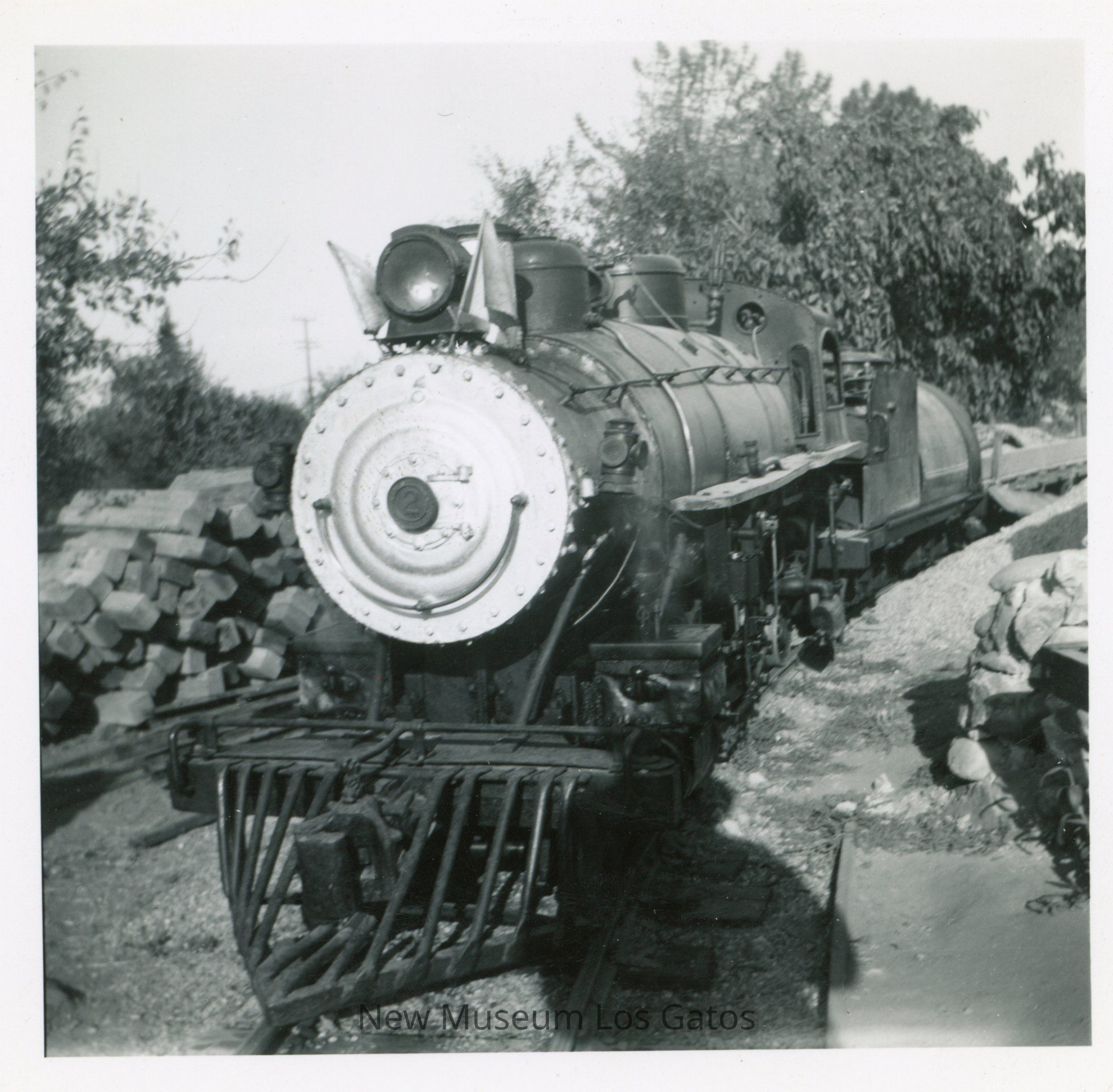 A black and white photograph featuring the Wildcat Railroad steam engine. The steam engine is in the center of the image, with pieces of wood stacked off to the left. The image is surrounded by a white border.Collection