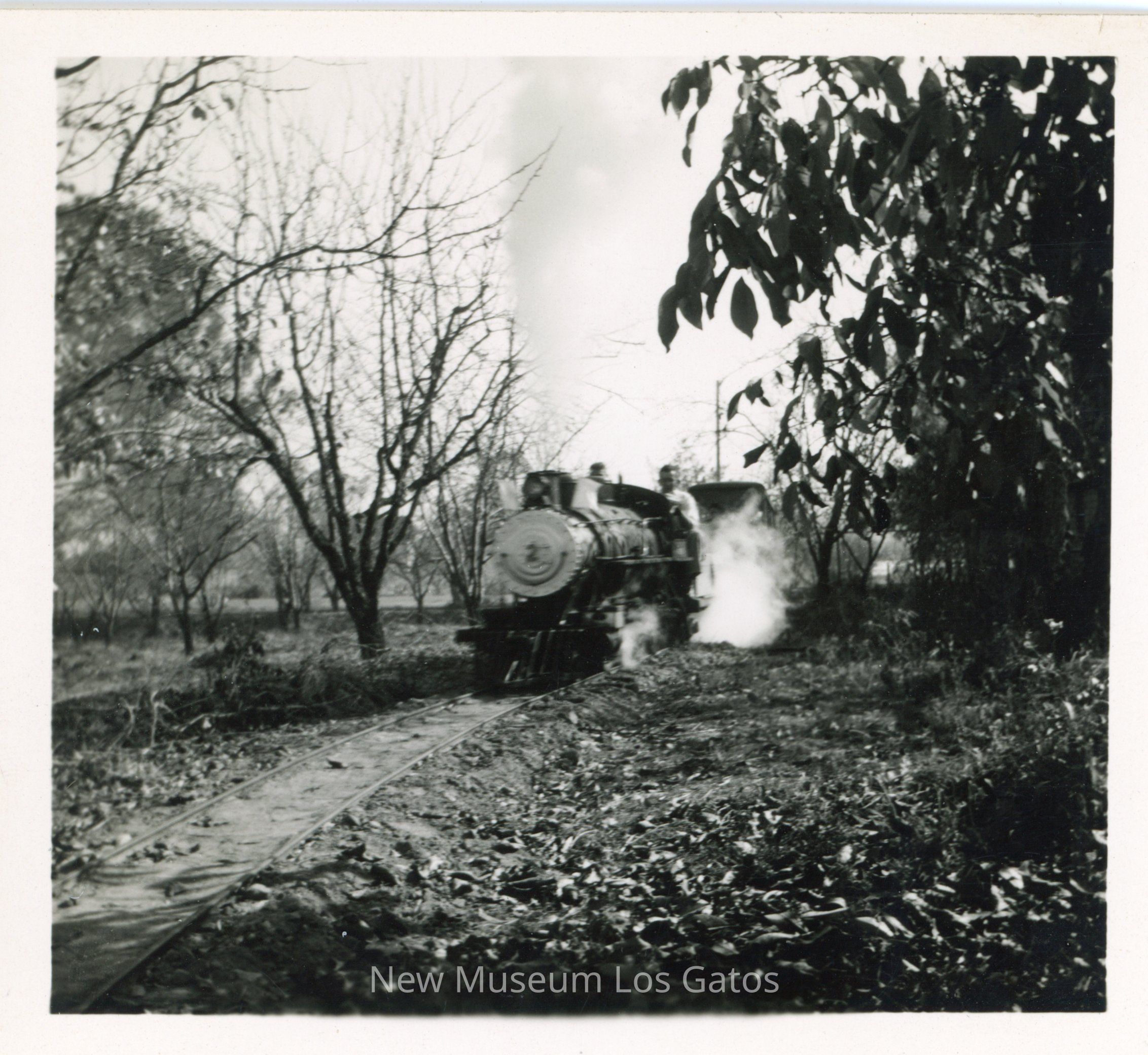 A black and white photograph featuring the Wildcat Railroad train running along the tracks. There is steam coming out of the top of the engine, as well as near the wheels in the back. There are two people sitting in the engine. There are trees on both sides of the tracks. The engine is slightly blurry in the image, which is surrounded by a white border.Collection