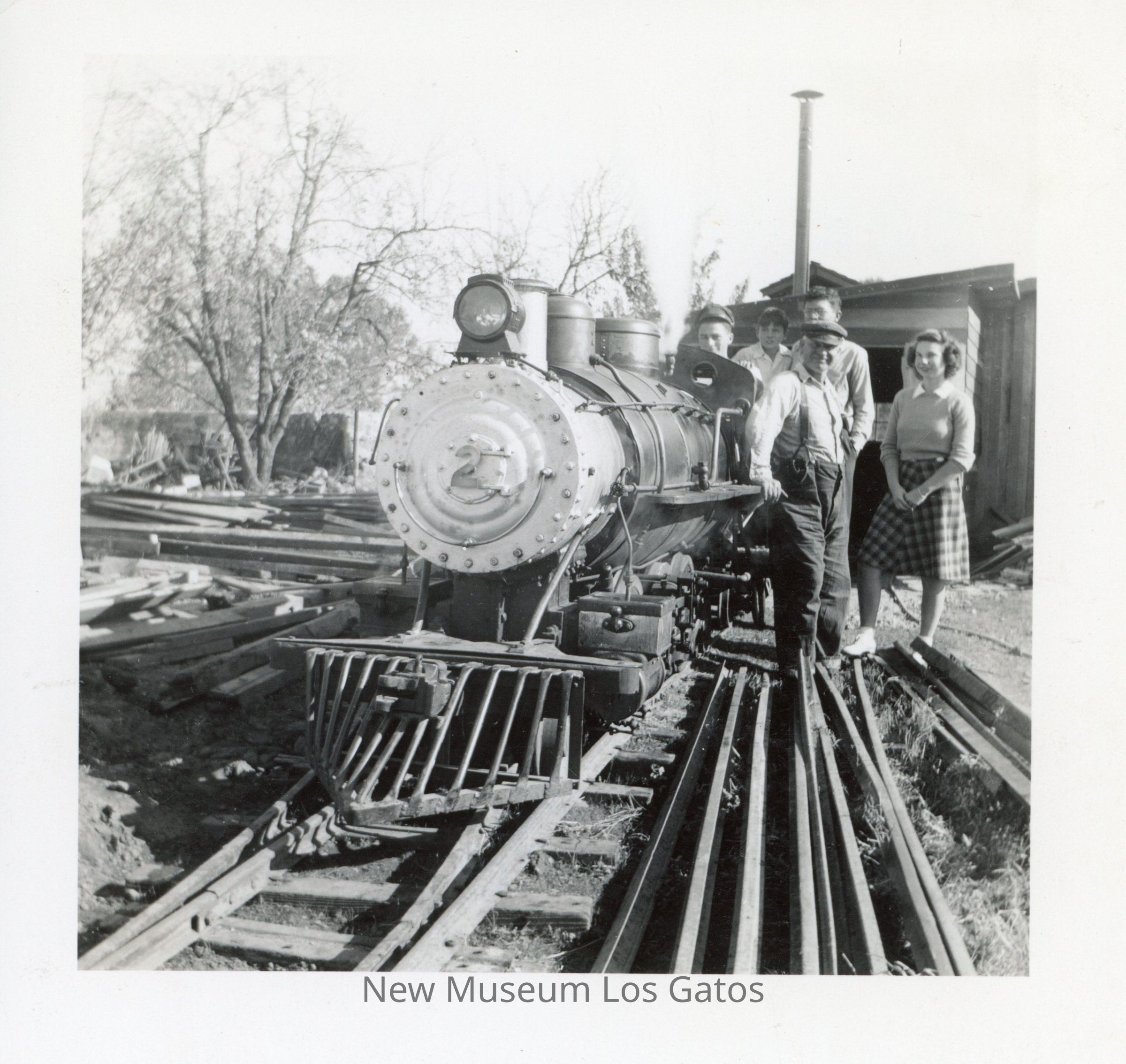 A black and white photograph featuring the Wildcat Railroad steam engine, most likely during construction. The steam engine is pictured on tracks, surrounded by wood and other building materials. Billy Jones is leaning on the right side of the engine, with a woman standing to his right side and three boys behind them and in the engine. The image is surrounded by a white border.Photograph Details