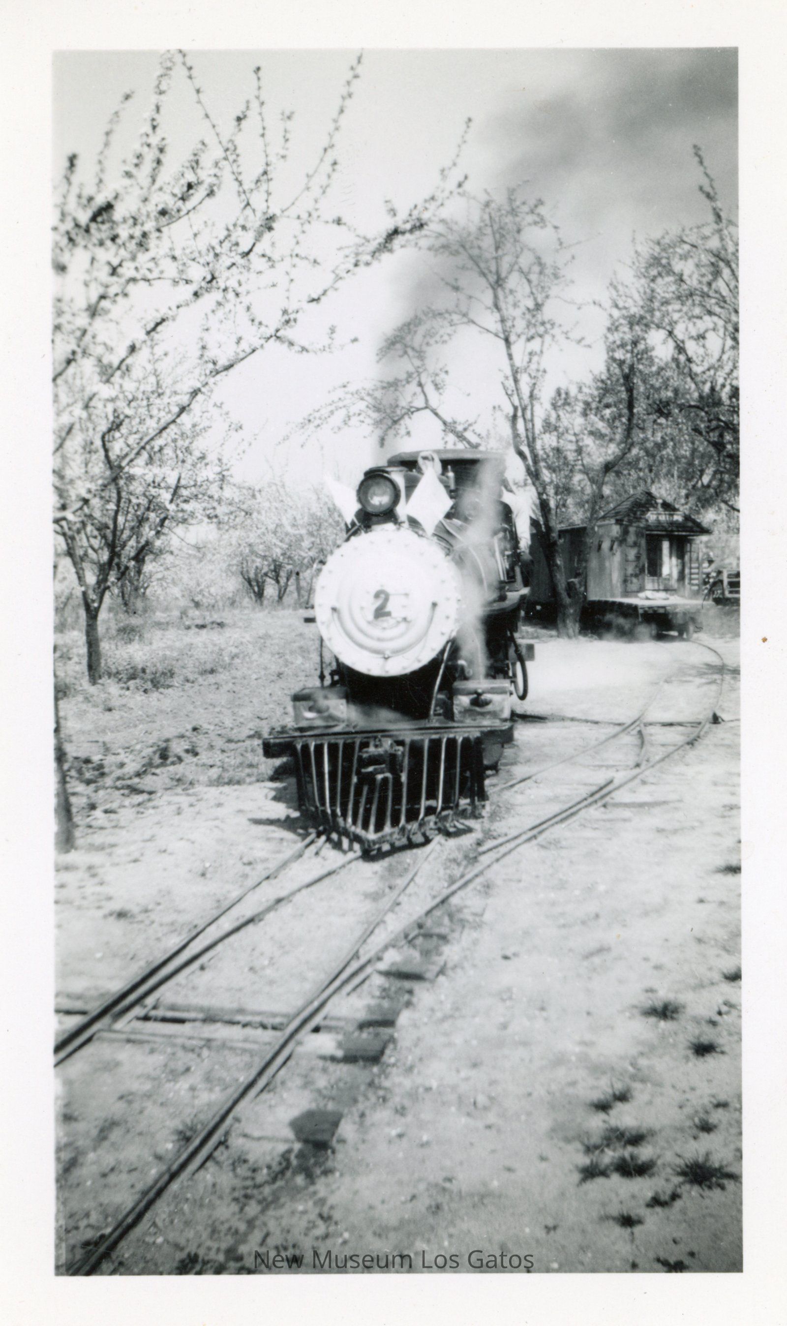A black and white photograph featuring the Wildcat Railroad steam engine. The steam engine is running on the tracks in the center of the image, with steam coming out of the top and the front of the engine. There are trees off to the left, and a building off to the right in the background. The image is surrounded by a white border.Collection
