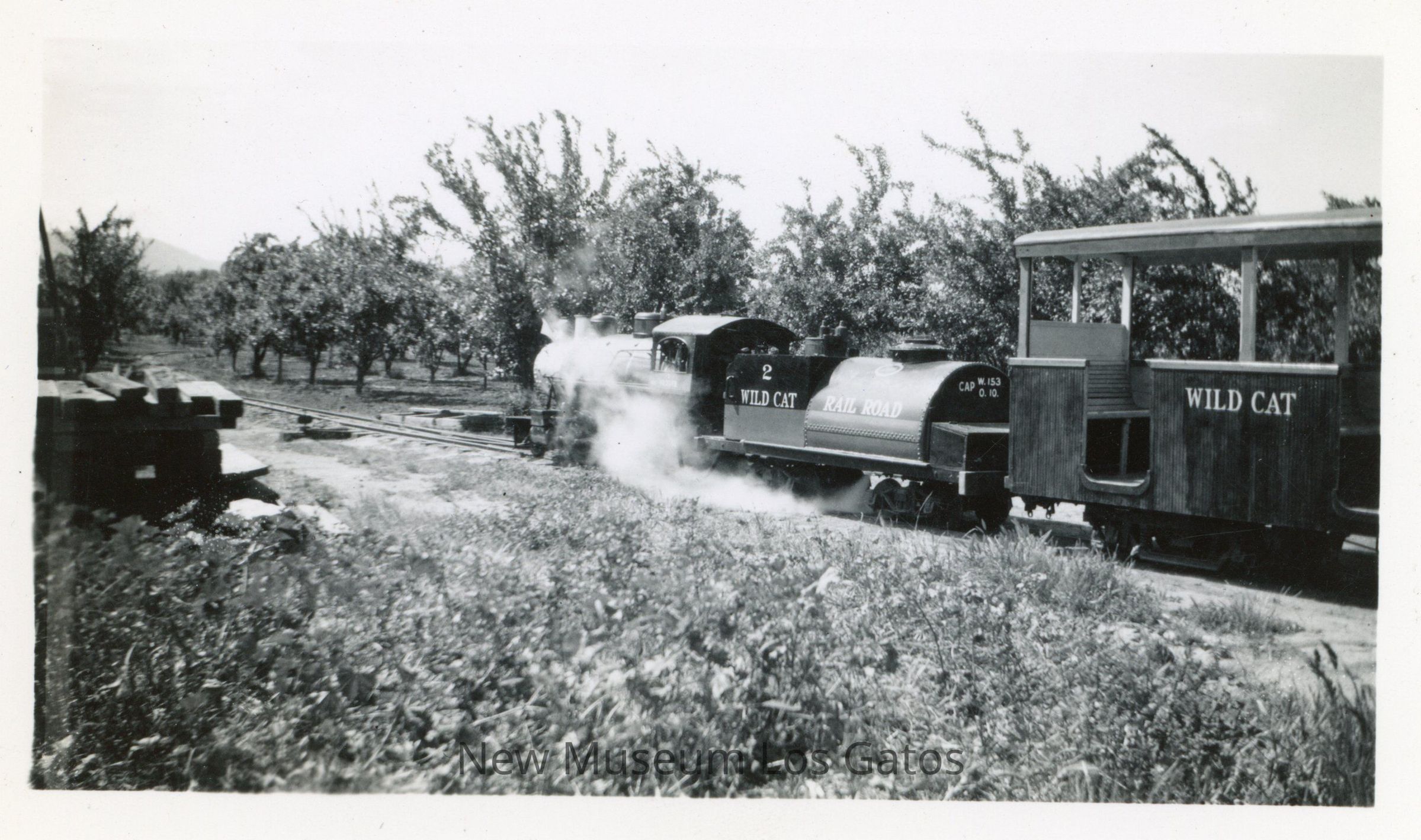 A black and white photograph featuring the Wildcat Railroad train running along the tracks. The steam engine and the front of the first car are pictured coming in from the right side of the image. There are trees in the background, and a pile of wood off to the left of the image. The image is surrounded by a white border.Collection