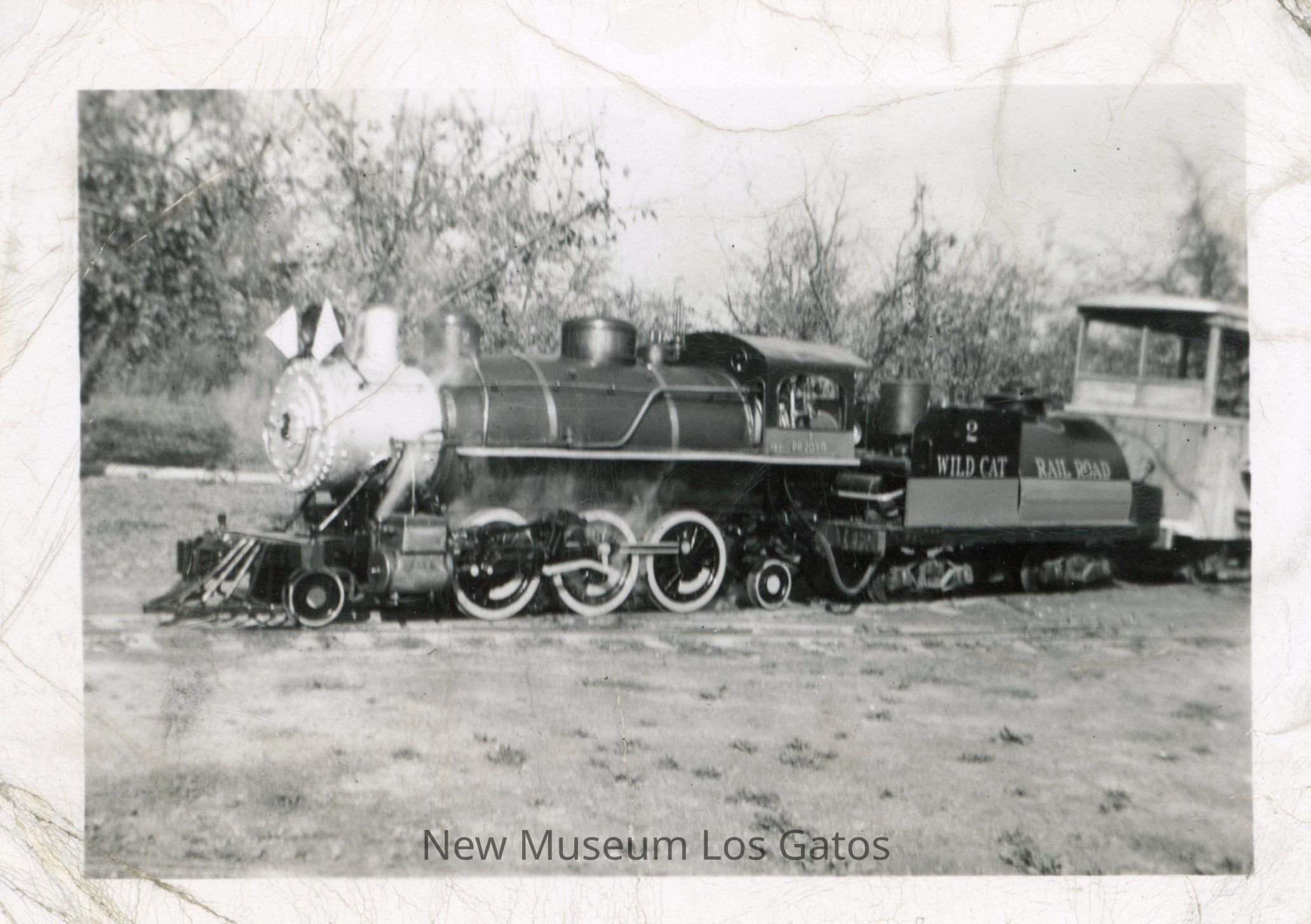 A black and white photograph featuring the Wildcat Railroad train. The steam engine and the front section of the first car are visible, coming into the image from the right. The ground is flat and barren, and there are trees in the background. The image is surrounded by a white border.Collection